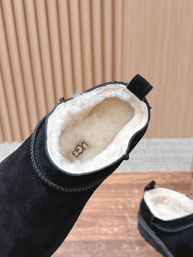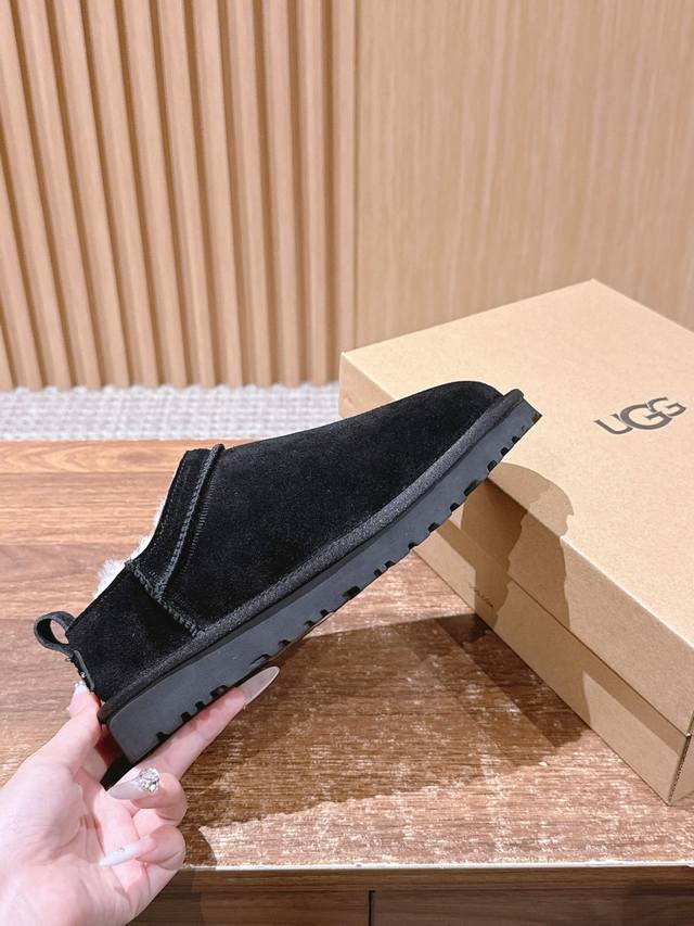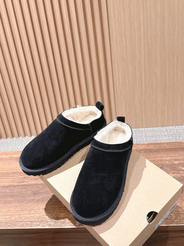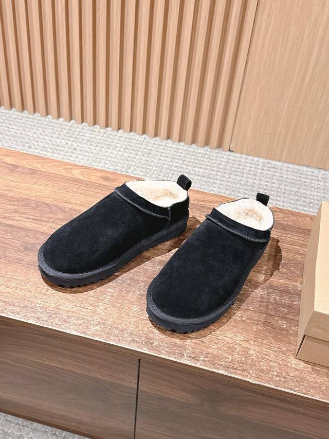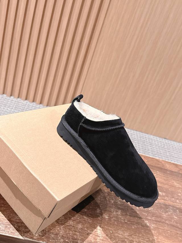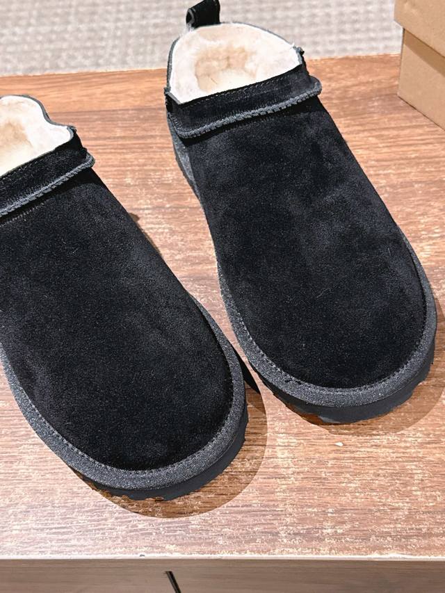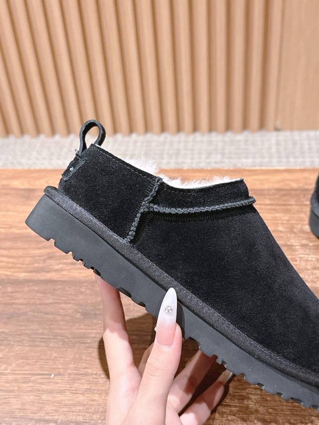 Ugg Slip-on thin-soled snow boots for autumn and winter, a trendy item that even celebrities are scrambling to wear! Zhou Dongyu's boots feature a high-low neckline design that accentuates her figure, making her look like a long-legged beauty. Material: Waterproof cow suede with genuine wool lining. Size: #35-39. Size 40 is custom-made and non-refundable.