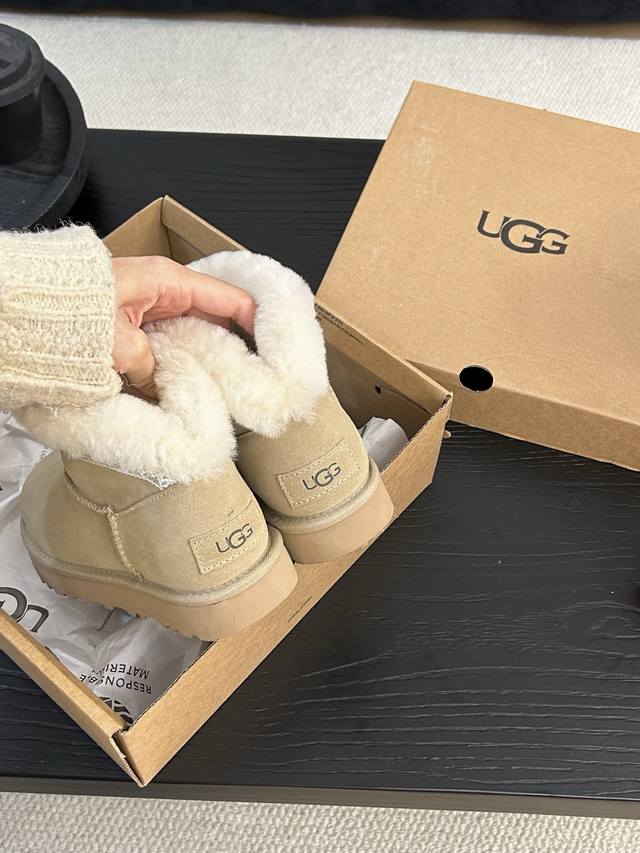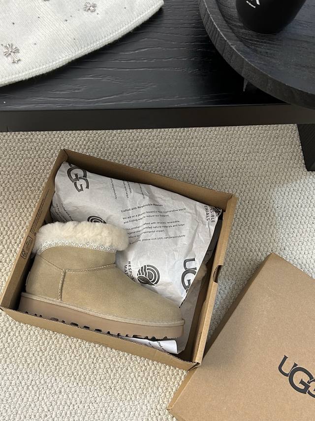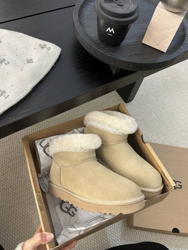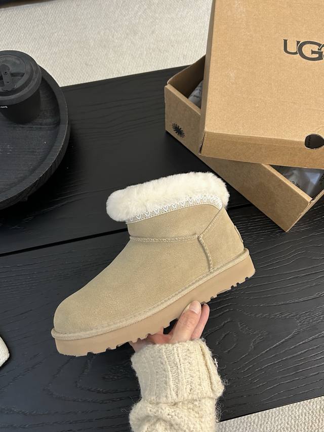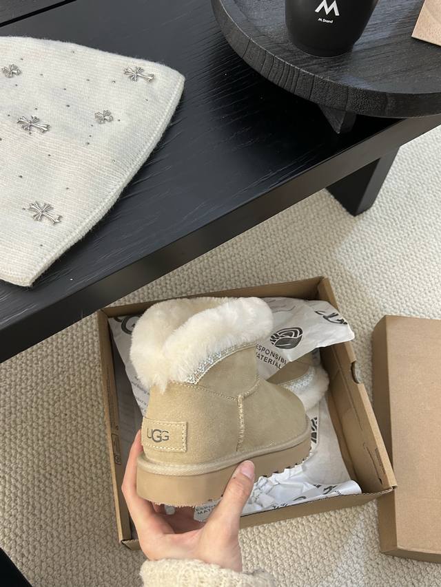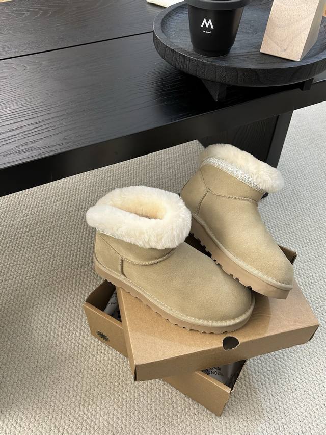 Ugg Taslin Mini Snow Boots, classic short-shaft design, suede upper with wool lining, warm and comfortable! The plush rolled-up collar adds a retro touch, making them incredibly versatile for autumn and winter outfits, easily matching jeans or skirts. Colors: Sand, Chestnut; Sizes: 35-40!