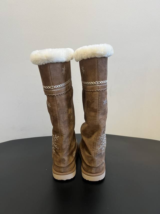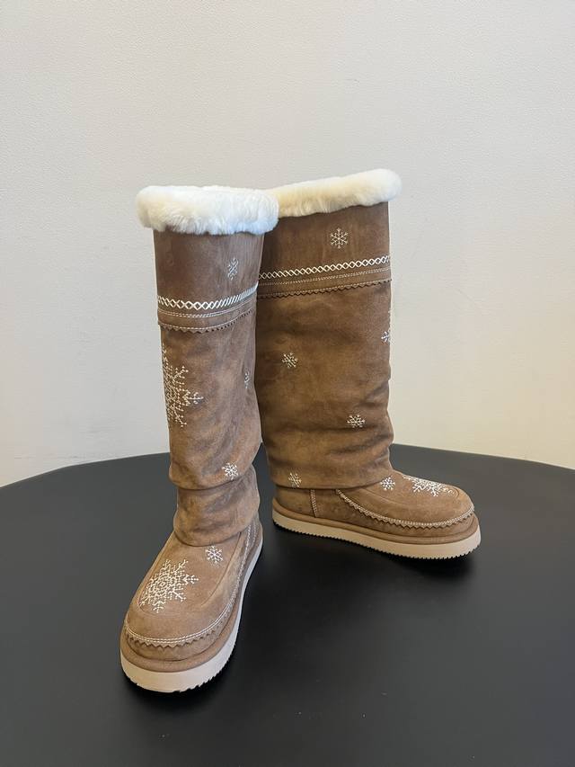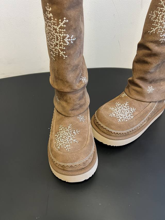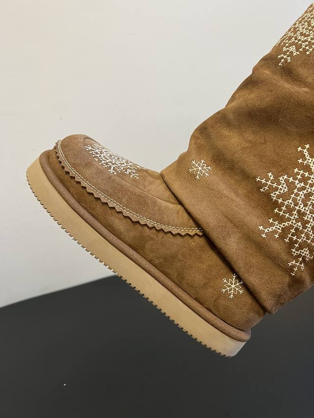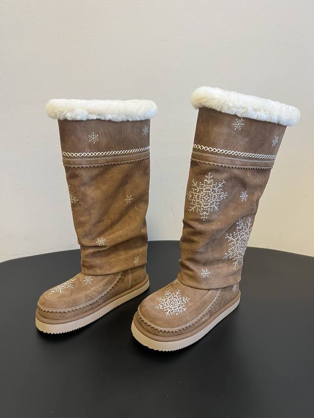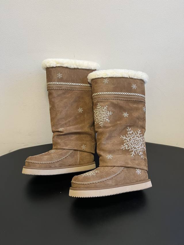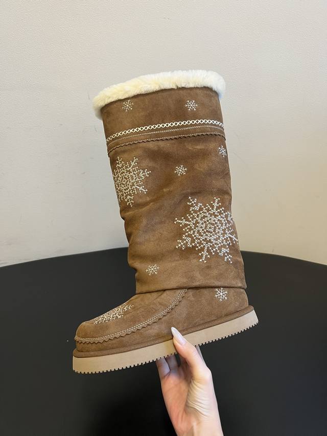 Unfolio 25Fw Autumn/Winter Retro Snowflake Tassel Tall Snow Boots DDD These boots blend ethnic style with winter elements, with tassel embellishments and snowflake embroidery adding a unique retro charm and romantic feel. Made of suede, they have a delicate texture; the plush material at the cuff is soft and skin-friendly, providing both warmth and comfort. DDD Available in brown and light brown, both warm earth tones, versatile and fitting the winter atmosphere. The snowflake embroidery on the shoe body is exquisite and delicate, and the tassel design sways gently with each step, adding a touch of dynamism; the neat stitching along the edges enhances the overall sophistication. DDD Upper: Cow Suede DDD Lining: Wool DDD Outsole: Rubber Outsole DDD Height Increase: 2.5cm DDD Size: 35-41, sizes 40 and 41 are custom-made and non-refundable DDD