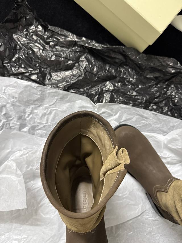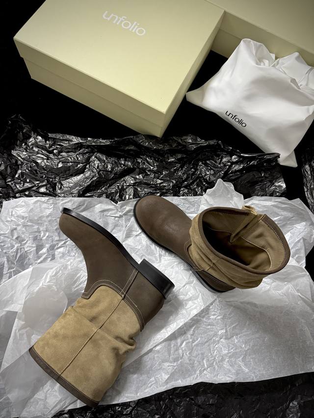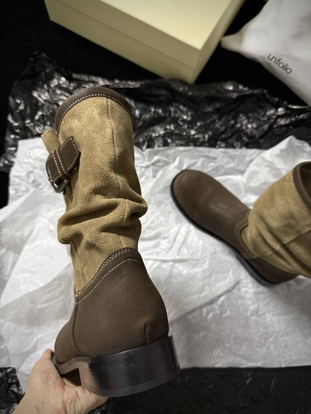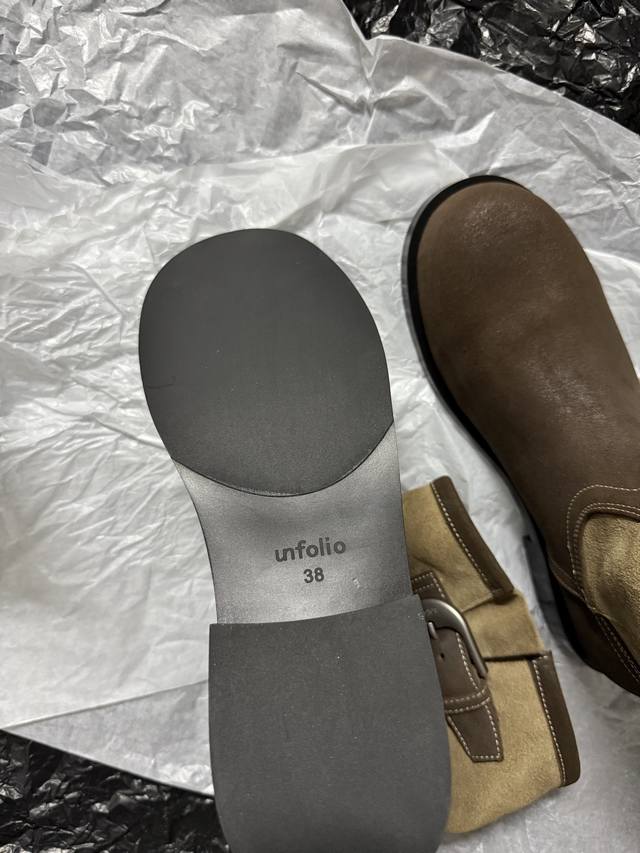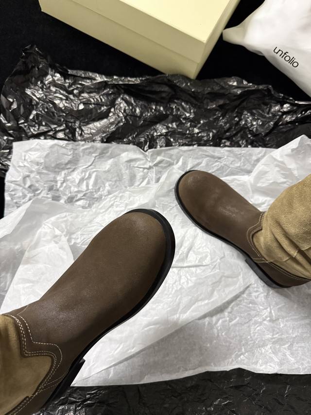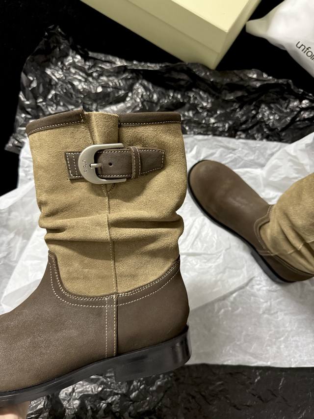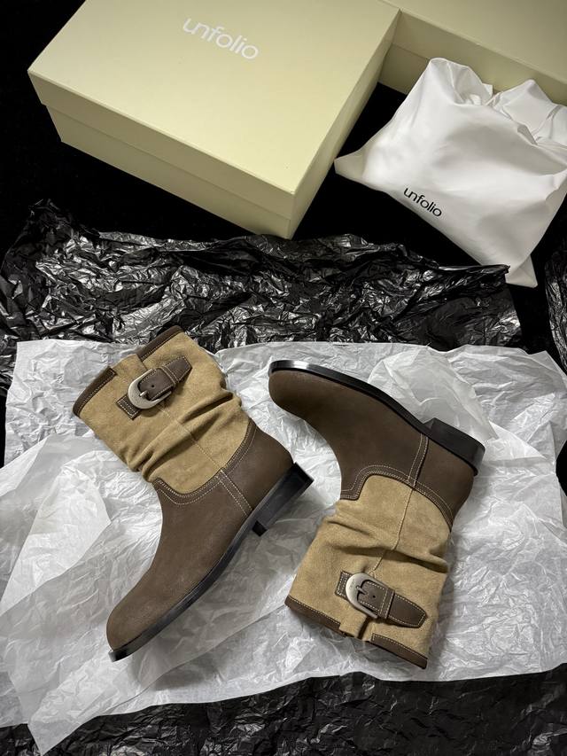 These boots are simply the epitome of autumn/winter style! The khaki and dark brown color blocking has a retro vibe. The pleated design and metal buckle details add a touch of sophistication. They look effortlessly chic on the feet and can be easily paired with a coat or a sweatshirt for a high-end look.