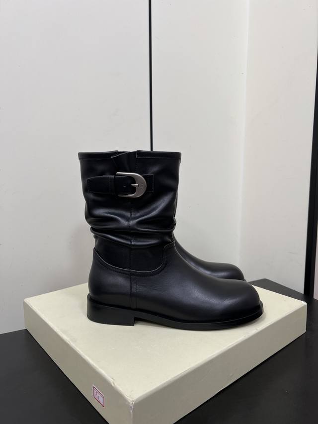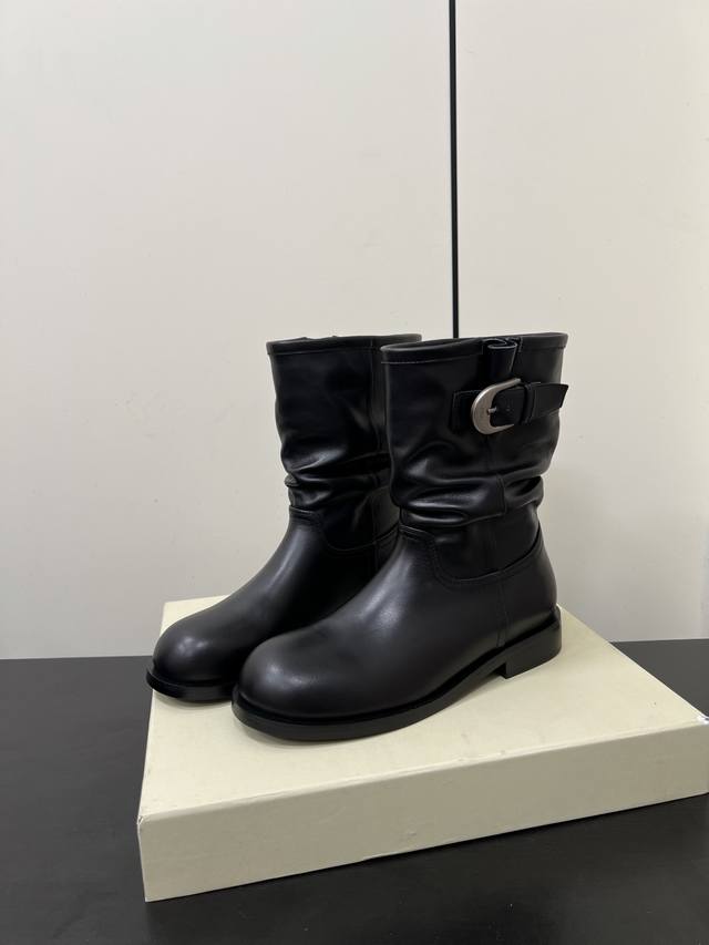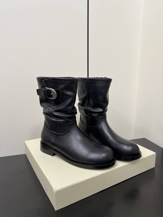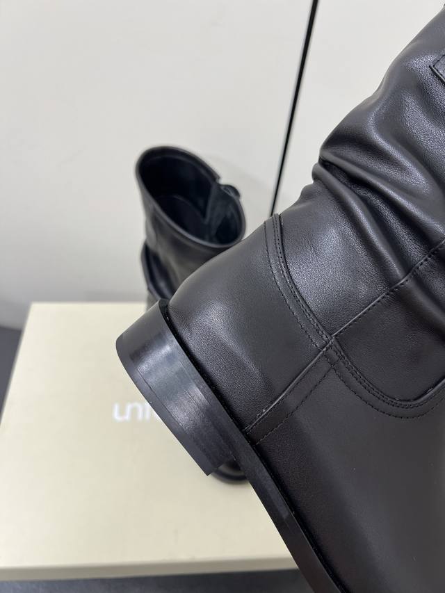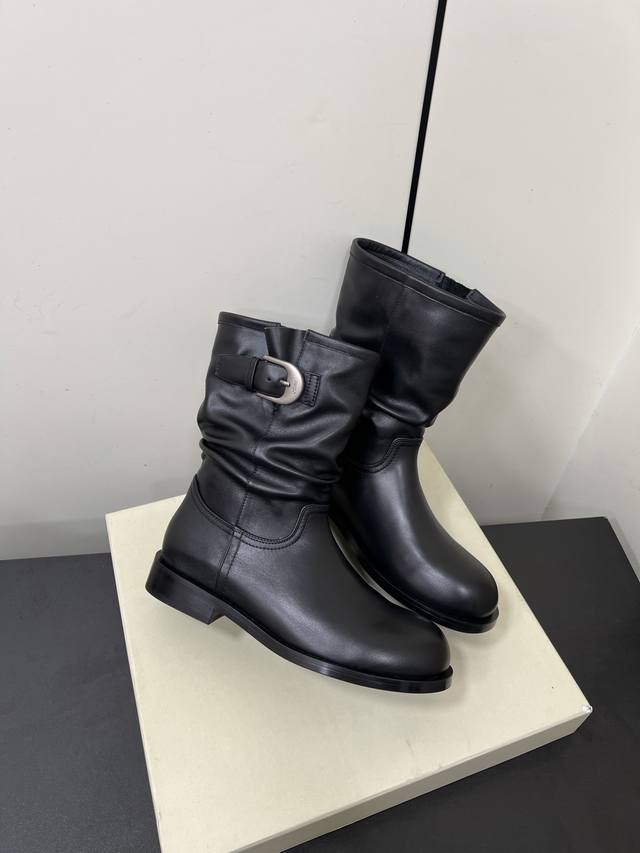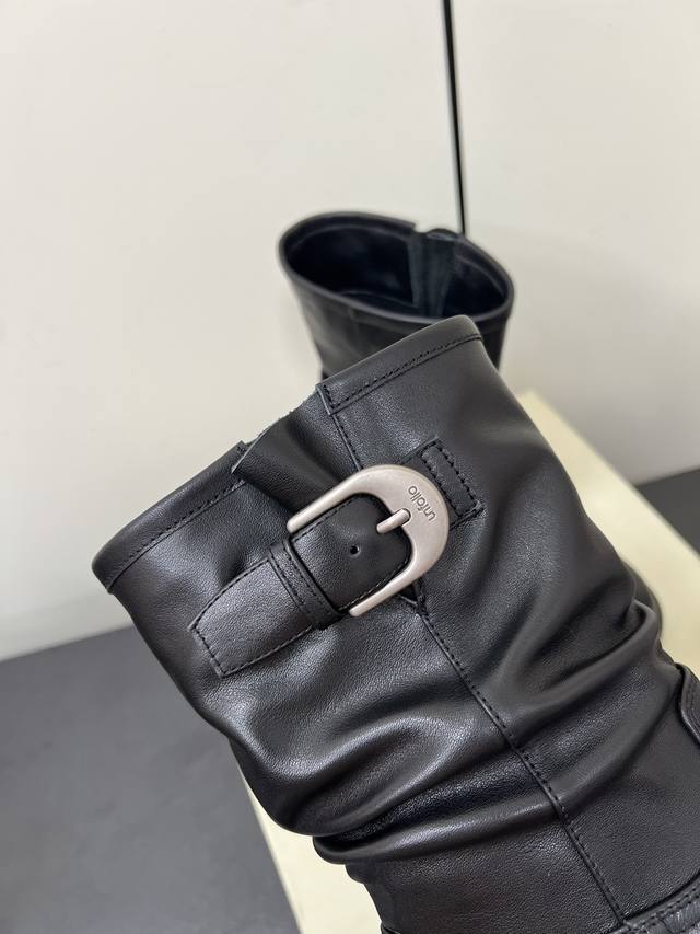 Unfolio Fall/Winter 2025 New Metal Buckle Color-Blocked Slouch Boots DDD These boots are inspired by traditional engineer boots. Their most distinctive feature is the adjustable metal buckle at the top and bottom, allowing for adjustment of the boot shaft's dimensions. Unfolio has refined this element while retaining its functionality, making it more decorative. The entire upper structure of the slouch boot is based on this design, while the silhouette has been modified to better fit women's needs. DDD Different colorways feature uppers made of smooth calfskin, distressed calfskin and suede, and full suede. The boot shaft lining uses fine, elastic Lycra fabric, a smooth and flowing material that provides immediate comfort upon slipping on. A specially designed thickened rubber sole makes them easy to care for and suitable for frequent everyday wear. DDD Upper: Cowhide suede/nude leather DDD Lining: Cowhide silk lining DDD Outsole: Rubber outsole DDD Size: 35-41 40.41 Made to order, no returns or exchanges DDD