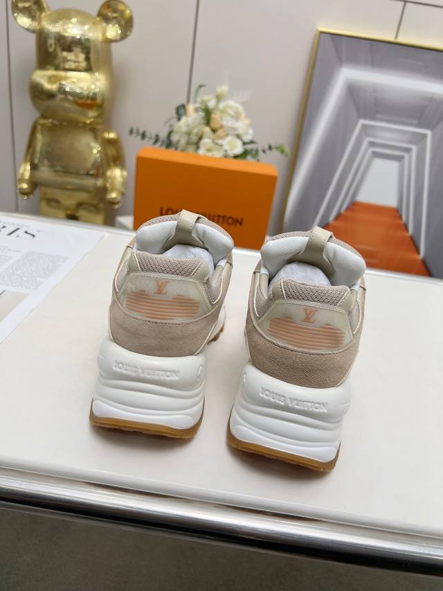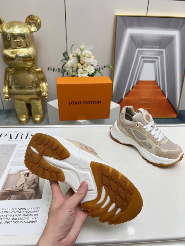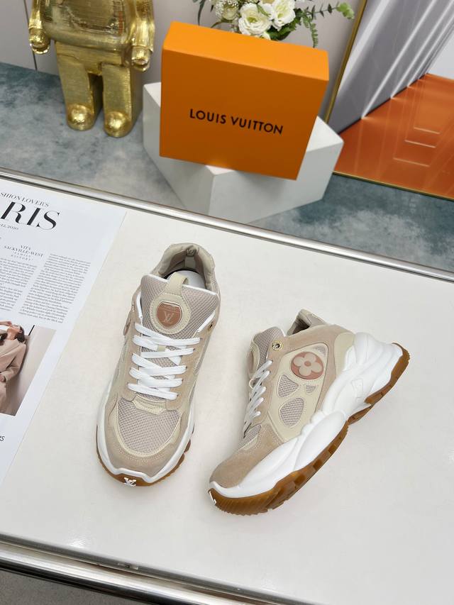 Unisex, this Run55 sneaker combines leather and technical materials, featuring a thickened outsole for agile running performance, providing a flexible, elastic, and comfortable experience for urban commuting. A Monogram floral accent is added to one side. Official colors: pink, white, black, apricot, blue. Sizes: 35-40. 41*42. Custom orders are non-refundable. Factory direct wholesale price.