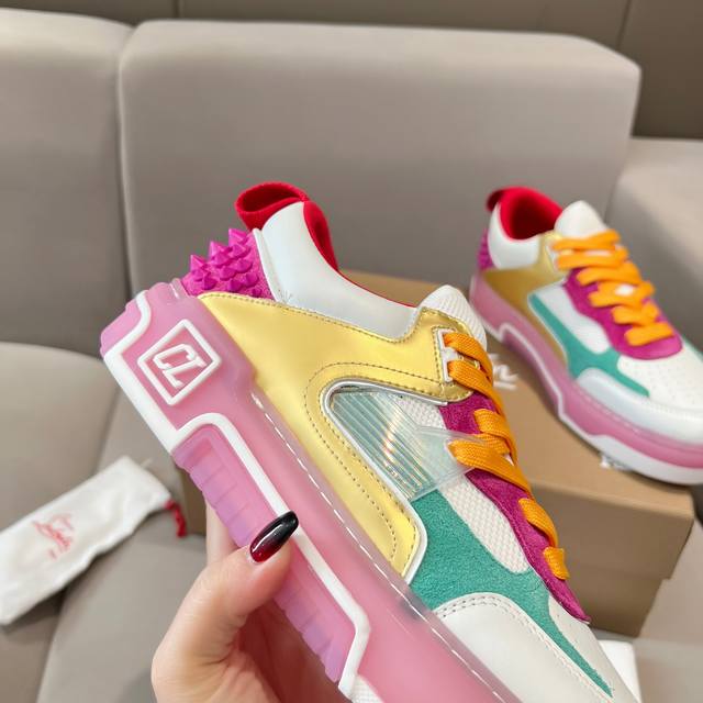 Wang Junkai, Yang Mi, Xu Kai, Zhang Jingyi, Ding Chengxin, Chen Muchi, and Wang Ziyi are wearing the same Christian Louboutin Astroloubi unisex thick-soled sneakers with red soles. These shoes perfectly blend fashion and sport. They're made from luxurious calfskin, soft suede, smooth satin, and laminated leather, with classic rivet detailing on the heel. The lining is a blend of durable, breathable, and quick-drying comfort, while the knitted tongue adds durability. The outsole is constructed from a combination of EVAP foam and imported rubber, and the colorful outsole features the brand's signature Cl lettering on the side, showcasing the brand's distinctive style. These are incredibly comfortable skate shoes!