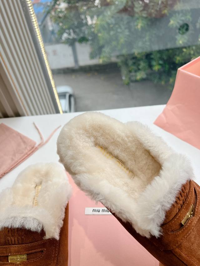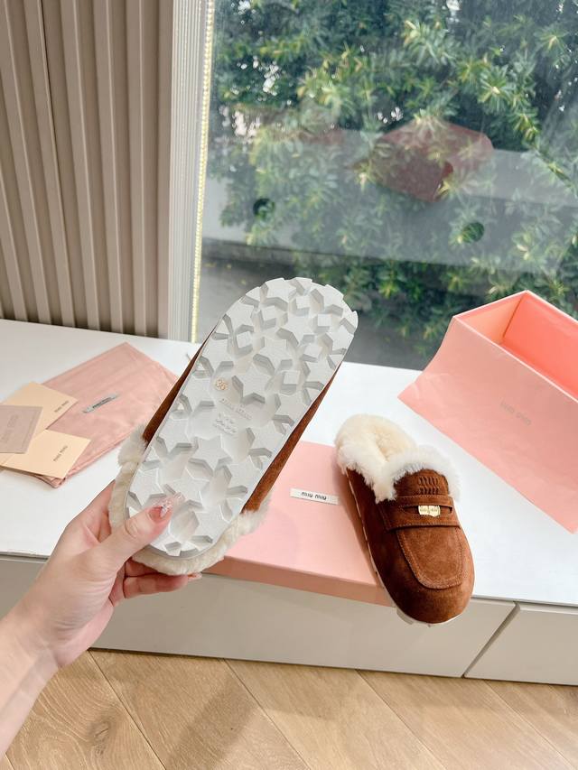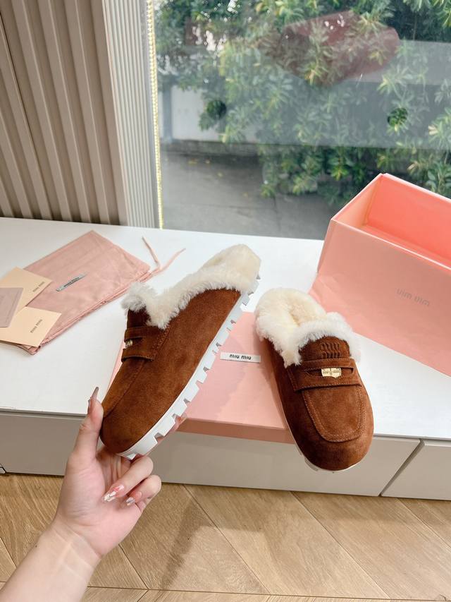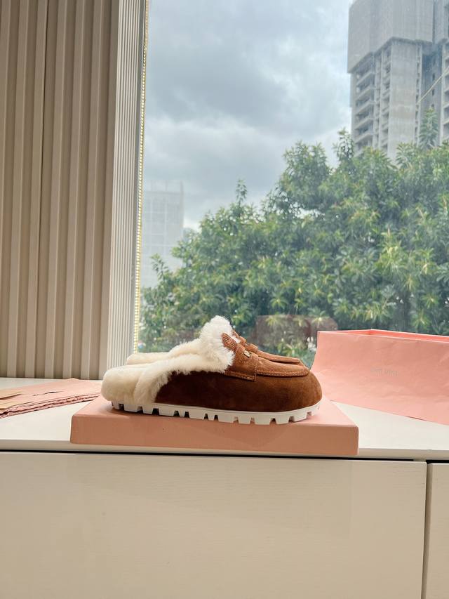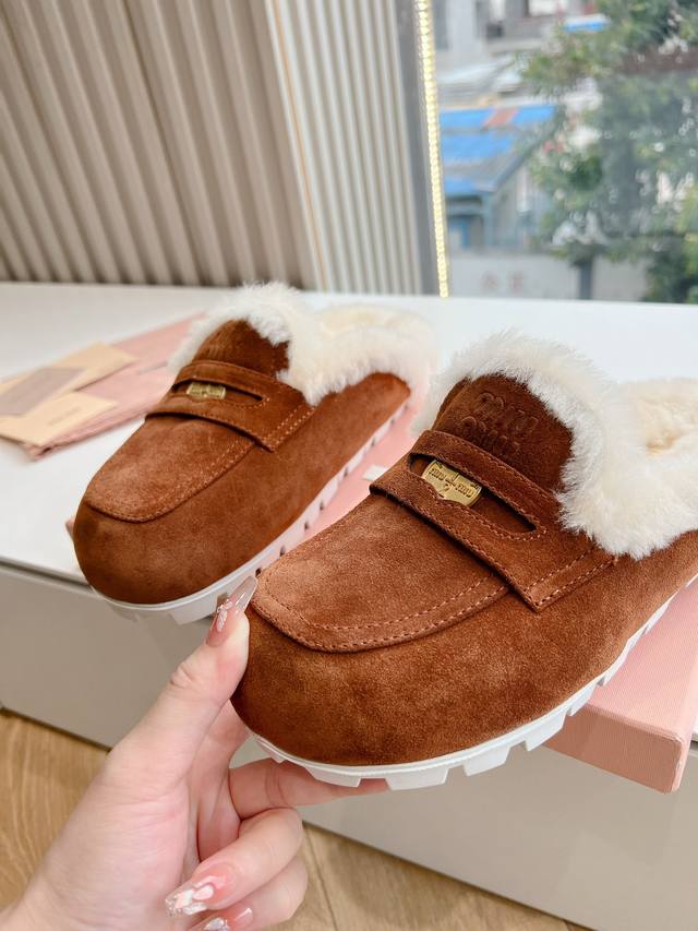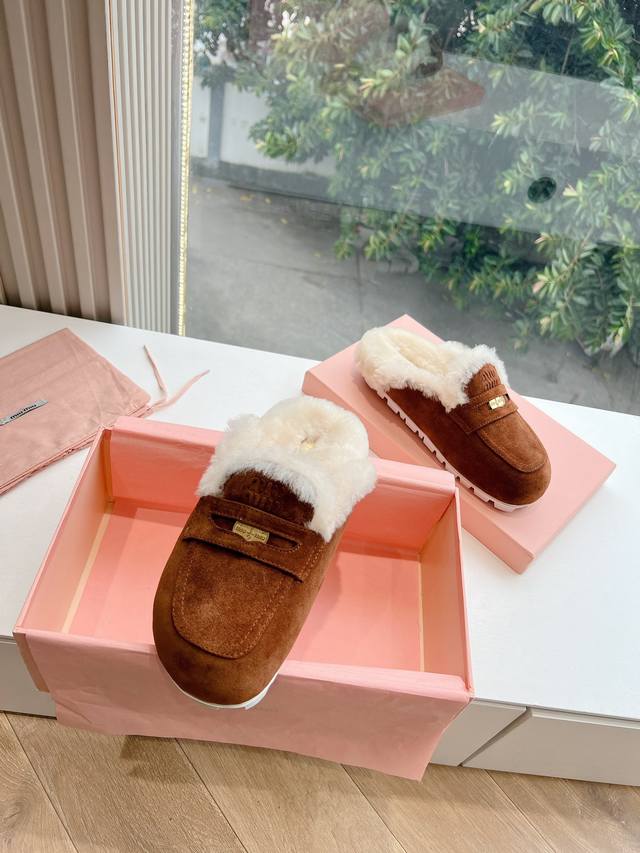 What you see is what you get Embroidered Logo og0286 In stock Miu Miu platform new British style closed-toe fur slippers