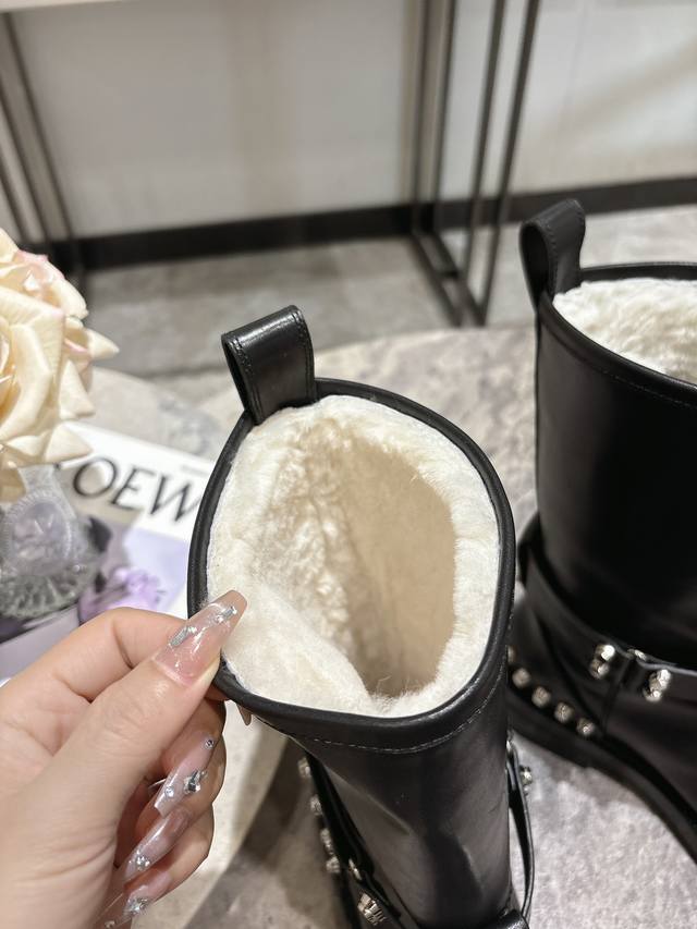 Retro heavy metal style, a must-have for women in winter, made of black calfskin, with a thick mid-heel design. The splicing of metal rivets and leather on the upper looks particularly noble and avoids the same style
