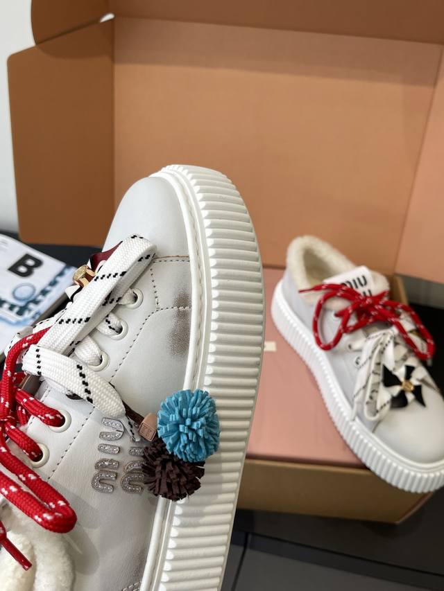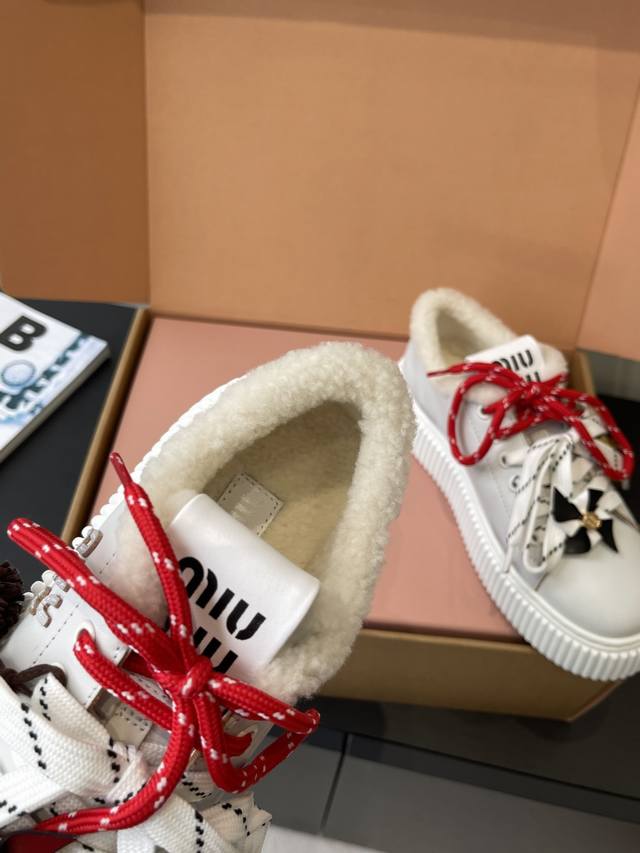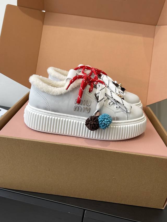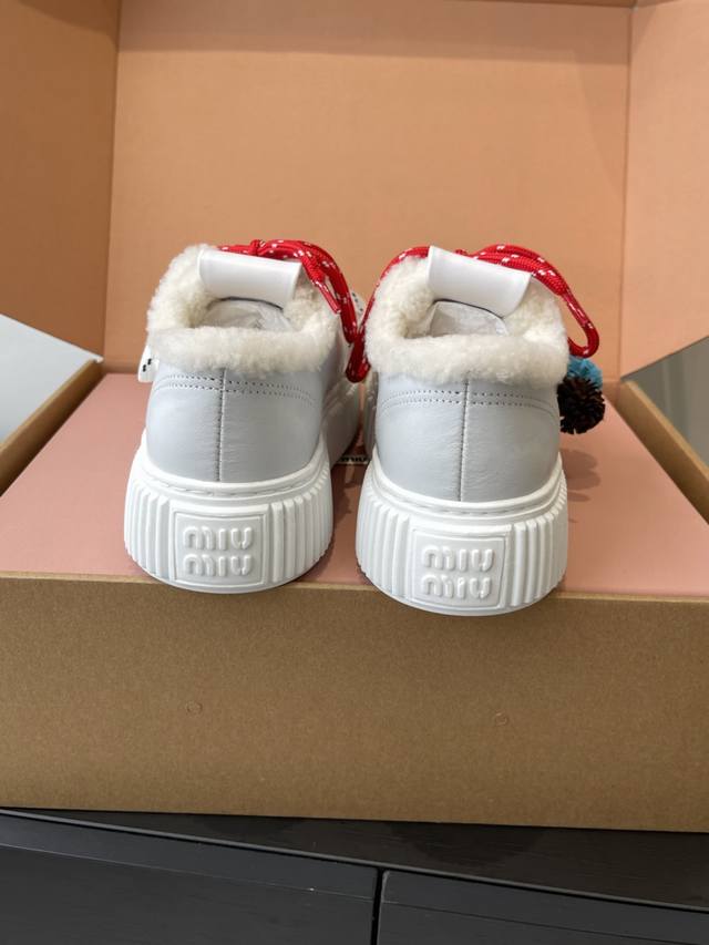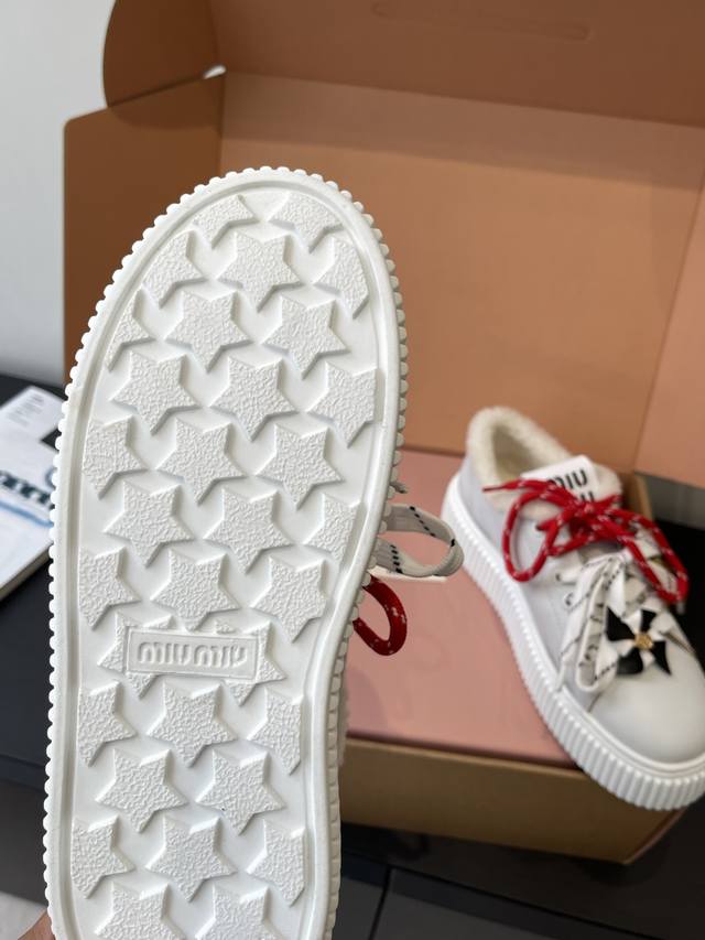 Wool-lined Miu Miu 25Ss new thick-soled casual white sneakers for fall/winter. Made from premium, premium fabric, these shoes are paired with classic 3D embroidered logos for a rich, three-dimensional look that instantly brightens the look and maximizes recognition. The ultra-light IP foam outsole is lightweight and highly resilient, making them a perfect fit for everyday outings or vacations. Upper: imported high-mercerized cow suede. Lined with sheepskin and lambswool. Original IP foam outsole. Sizes: 35-40. 40.41 Made to order.