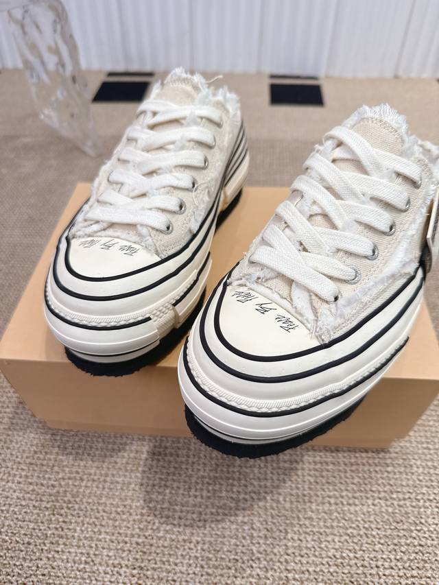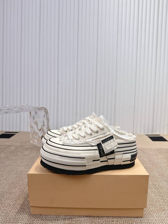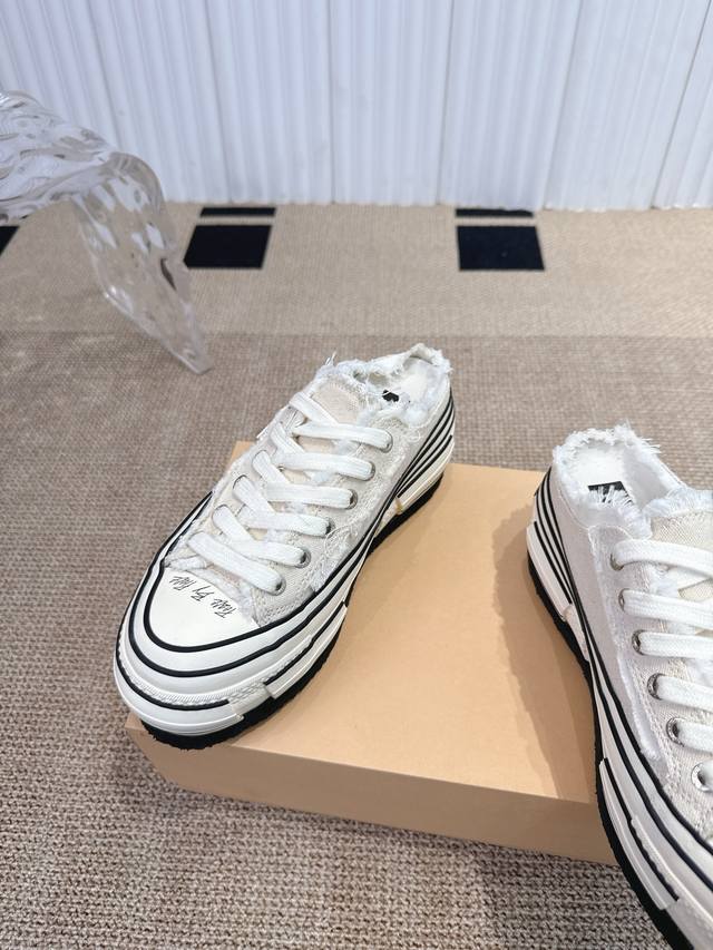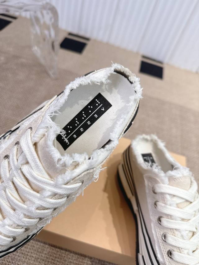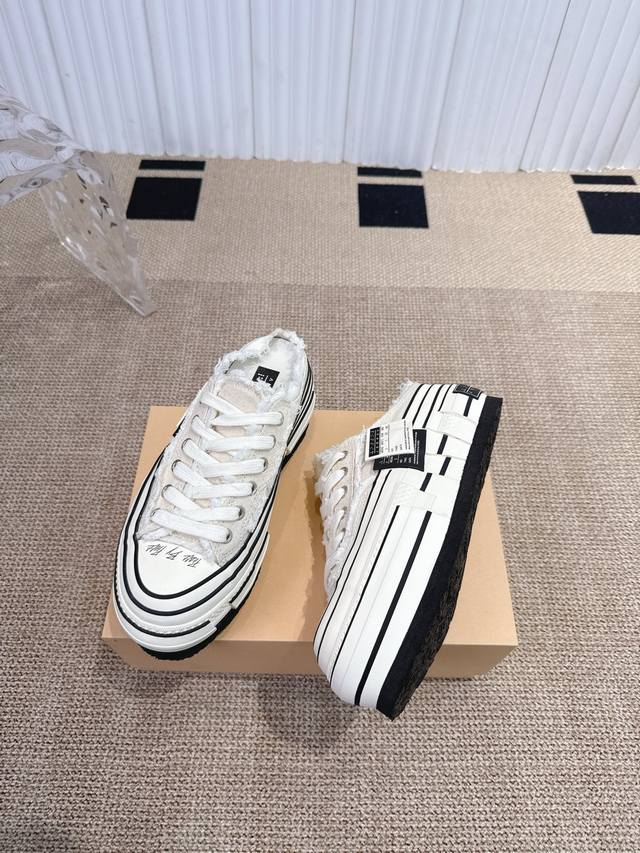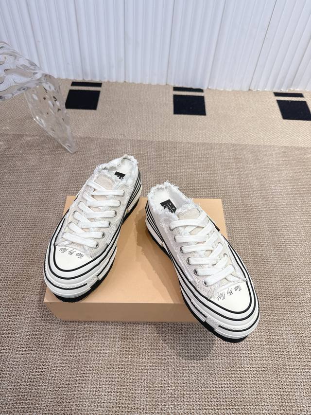 Wu Jianhao's Xvessel vulcanized double-label platform canvas shoes with raised heels and half-slippers. Xvessel double-label mules are easy to put on and take off, creating a lazy atmosphere and allowing you to enjoy the freedom of going out. The Double Rise