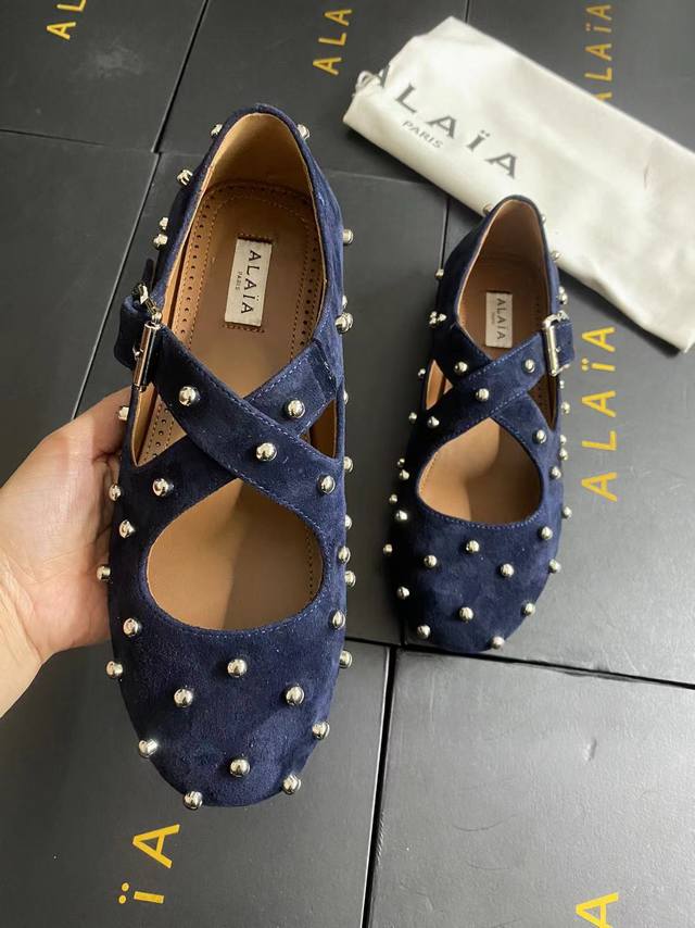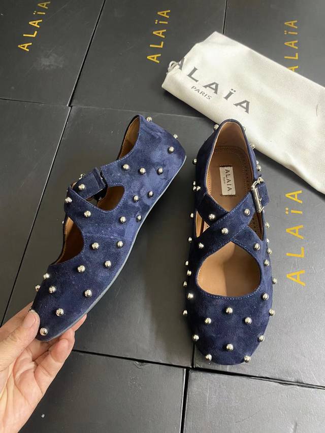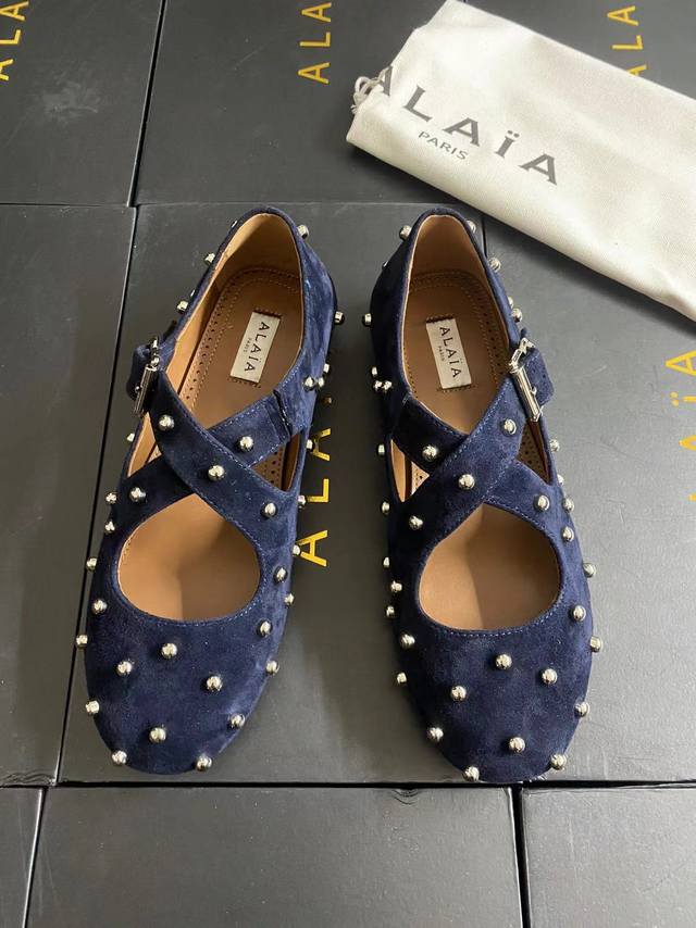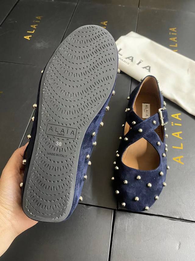 Alaia runway style flat ballet flats! A super popular ballet flat with a sweet and cool ballet style, romantic, charming, comfortable, and versatile. Made with original custom-made cowhide with Swarovski crystal upper, sheepskin lining, and custom-molded rubber non-slip outsole. Sizes: 35-41. Sizes 40 and 41 are custom-made and non-refundable.