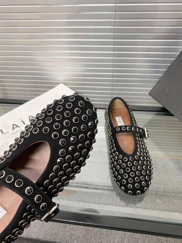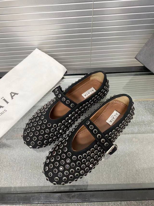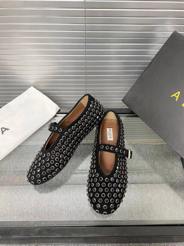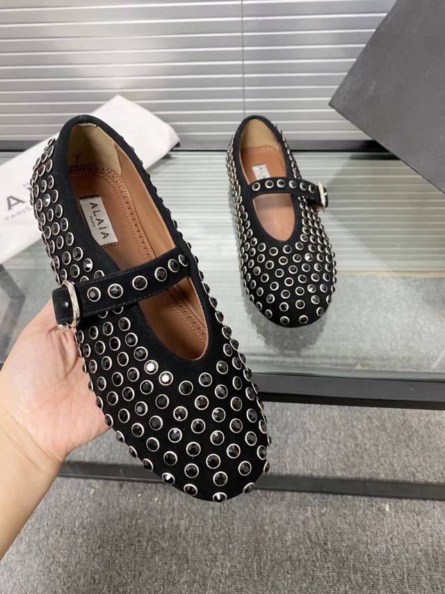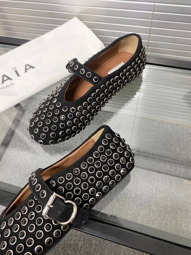 Alaia runway style flat ballet flats! A super popular ballet flat with a sweet and cool ballet style, romantic, charming, comfortable, and versatile. Made with original custom-made cowhide with Swarovski crystal upper, sheepskin lining, and custom-molded rubber non-slip outsole. Sizes: 35-41. Sizes 40 and 41 are custom-made and non-refundable.