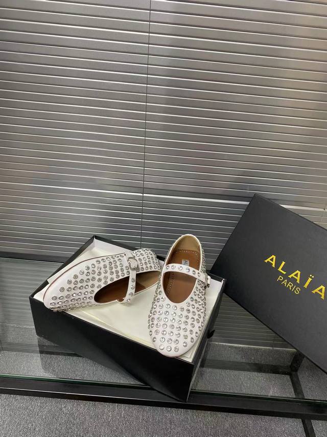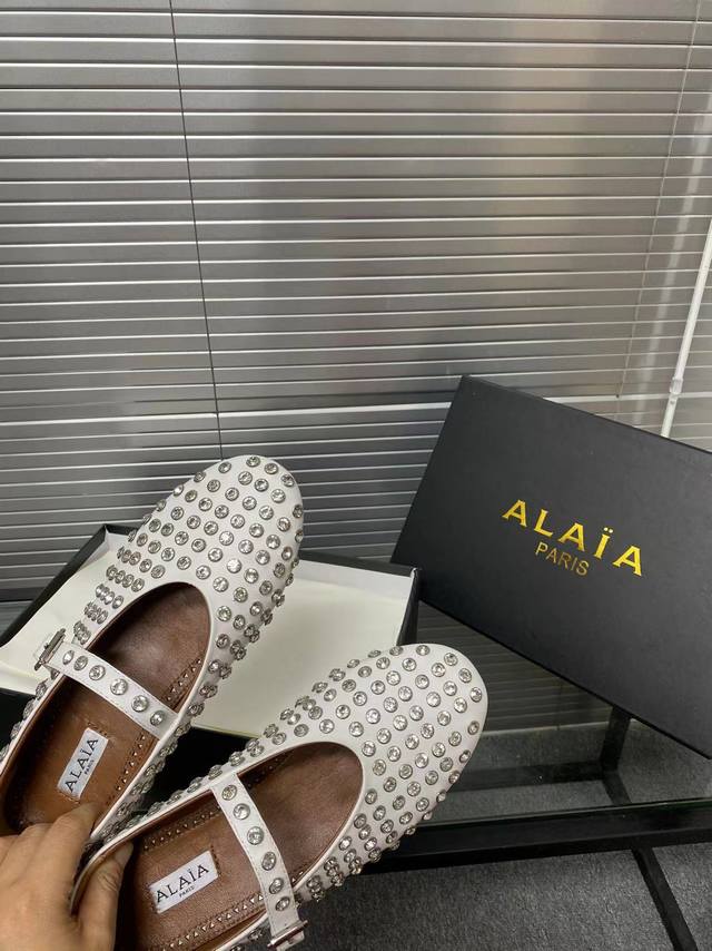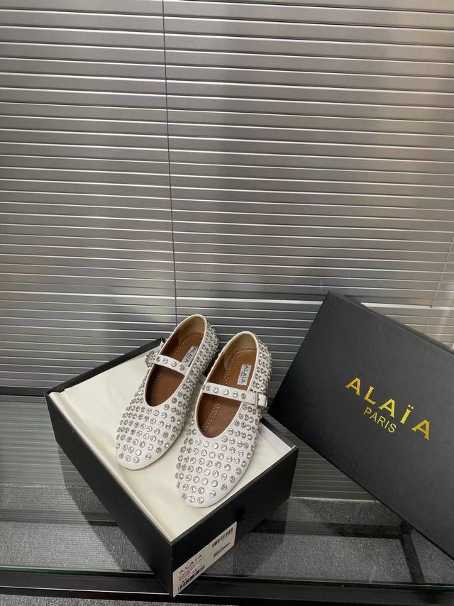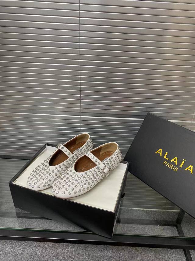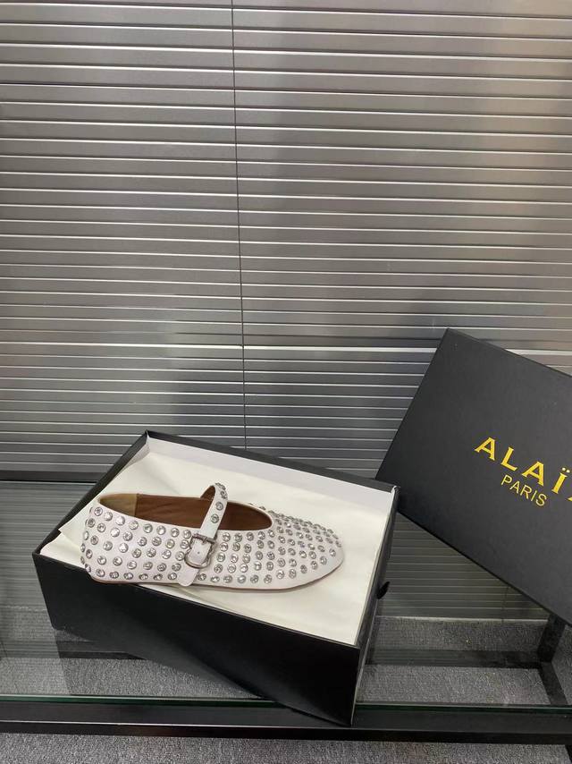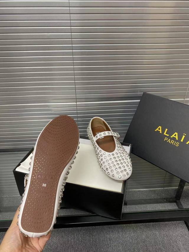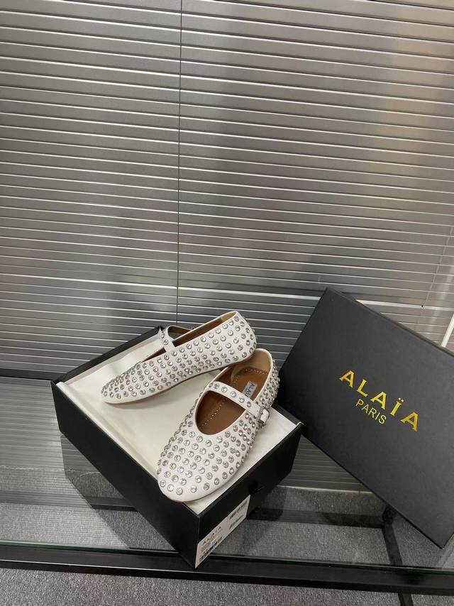 Alaia runway style flat ballet flats! A super popular ballet flat with a sweet and cool ballet style, romantic, charming, comfortable, and versatile. Made with original custom-made cowhide with Swarovski crystal upper, sheepskin lining, and custom-molded rubber non-slip outsole. Sizes: 35-41. Sizes 40 and 41 are custom-made and non-refundable.