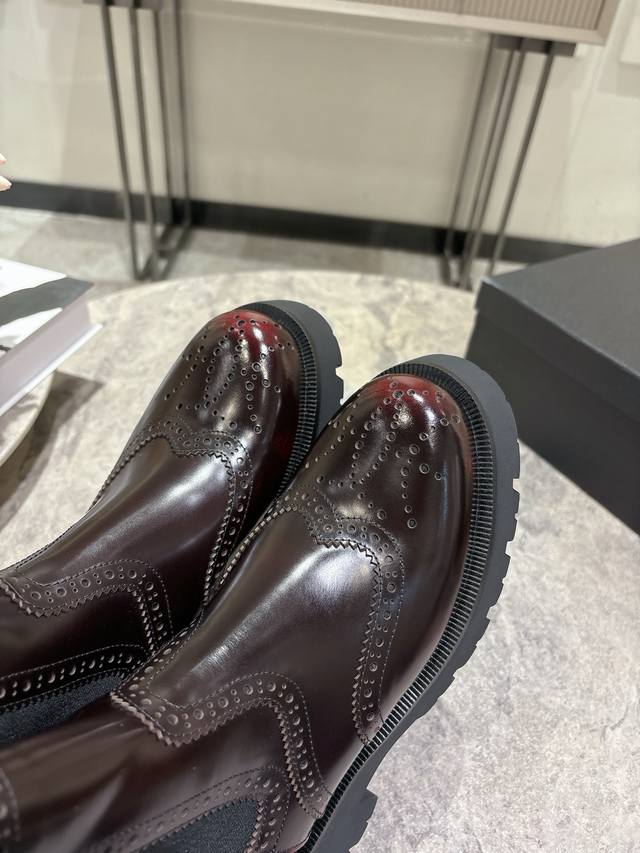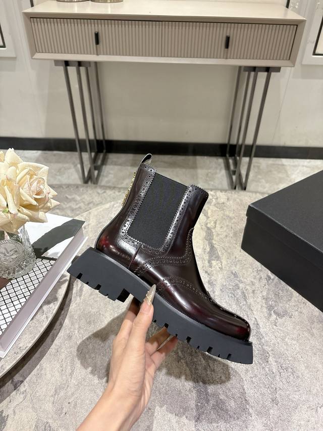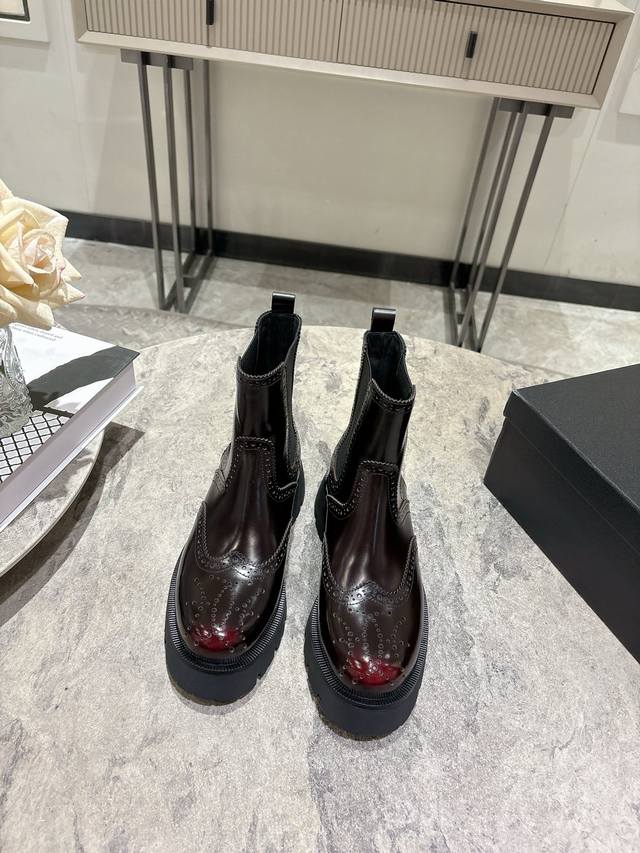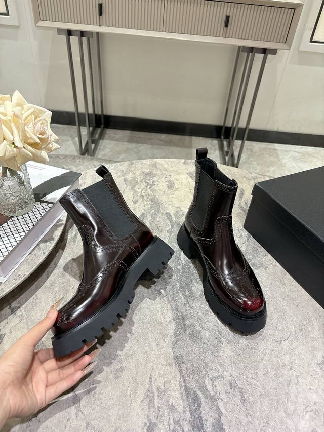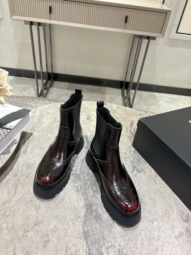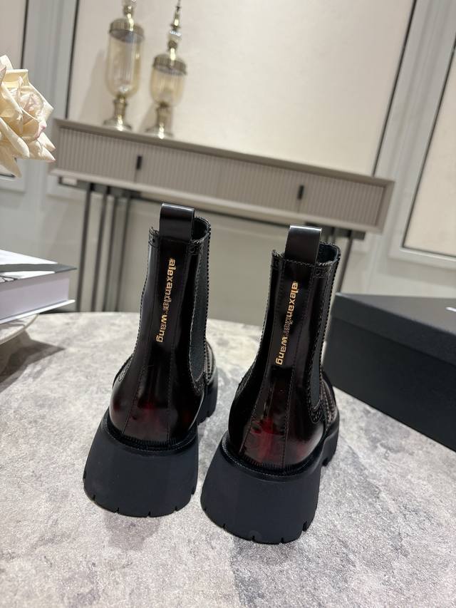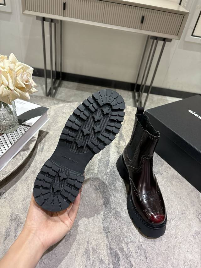 Alexander Wang 25Ss Autumn/Winter New Brogue Chelsea Boots DDD These boots combine traditional brogue detailing with the elasticated Chelsea boot shaft, while incorporating chunky workwear elements, retaining a retro elegance while injecting a street-style cool vibe. Ddd Continuing Alexander Wang's consistent "cool and minimalist" style, these boots add unique details to the classic silhouette, showcasing the brand's unique trendsetting attitude. Ddd The upper is made of glossy leather, offering a high-gloss finish that enhances the visual appeal and is easy to clean. The thick rubber outsole not only improves slip resistance but also effectively adds height, lengthens the leg line, and optimizes body proportions. DDD Upper: Original imported split-edge cowhide Ddd Insole: Sheepskin Ddd Outsole: Original custom-made foamed rubber outsole Ddd Size: 35-40, size 40 is custom-made and non-refundable DDD