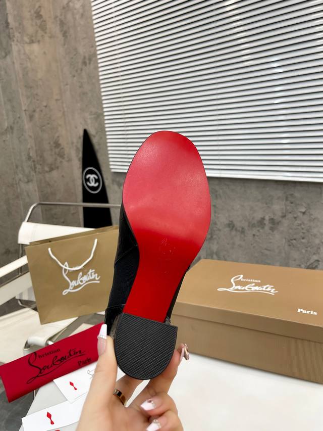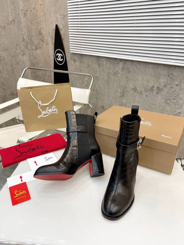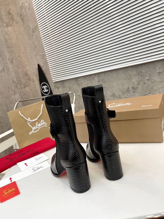 Christian Louboutin Cl's new chunky-heeled platform boots are crafted from glossy calfskin. The sides feature a striking gold-plated Christian Louboutin Cl logo on the elastic waistband. The boot height is 6 inches (15cm). Material: Crocodile-patterned calfskin; Lining: Sheepskin; Heel height: 7cm (rubber-leather); Colors: Black, Reddish-brown; Sizes: 34-41 (34, 41 custom sizes); Packaging: Original packaging.