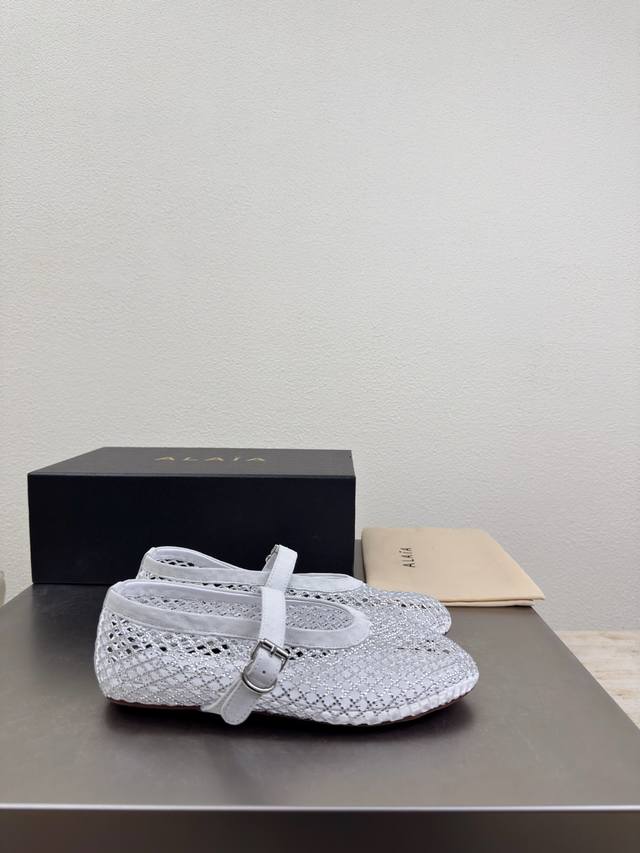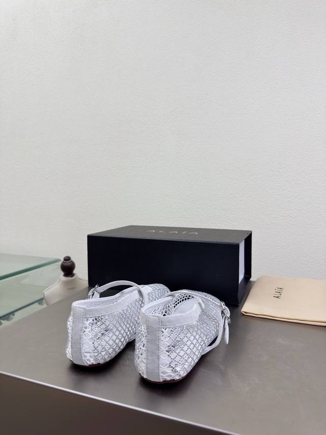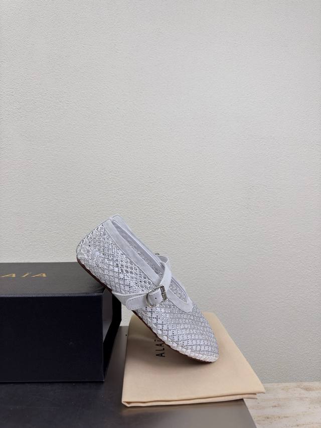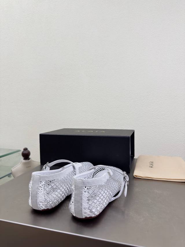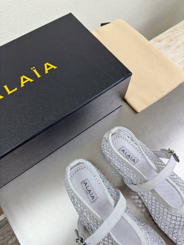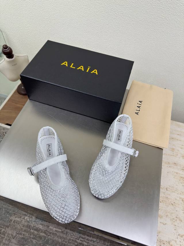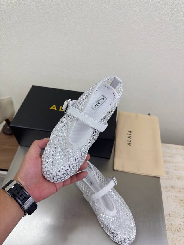 Exquisite diamond-encrusted Alaia slippers from Paris. Love at first sight in white. Handmade, high-end classic. Alaia also has a sexy side. Easily paired with different styles and looks, whether jeans, suit pants, or a pleated skirt, it elevates your outfit to fashion, elegance, and excellence. Made with original materials for ultimate sexiness. Features a sheepskin lining and original outsole. Available in sizes 34, 35, 36, 37, 38, 39, 40, 41, 42. Customized. Comes with original packaging.