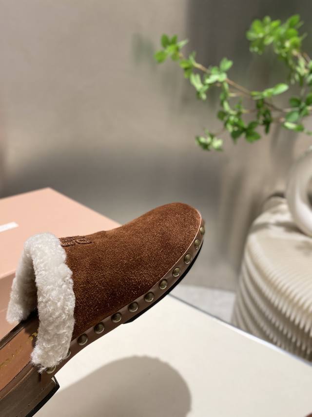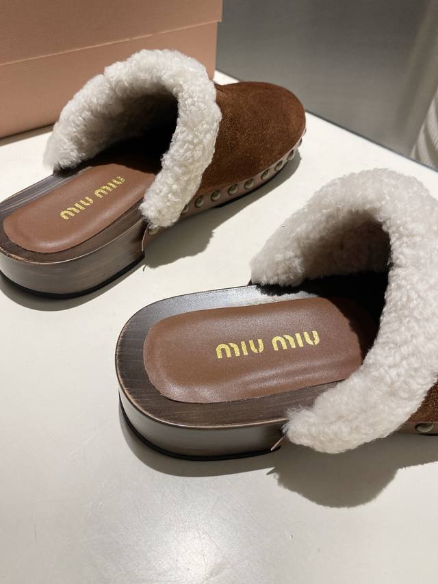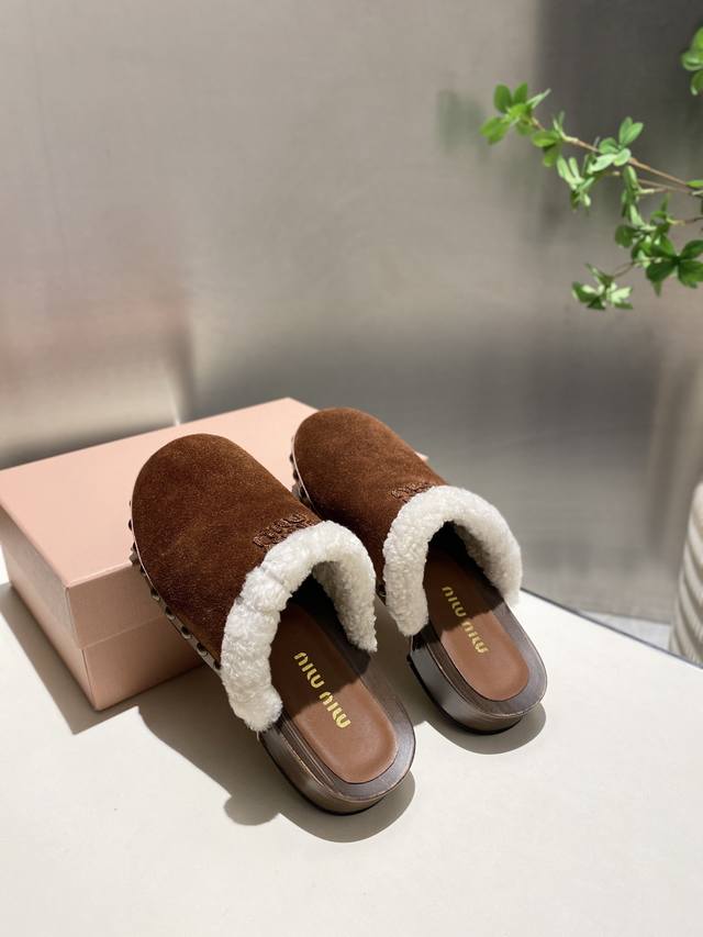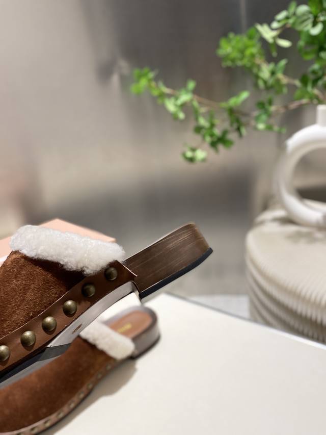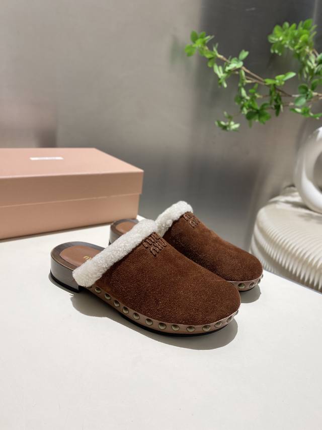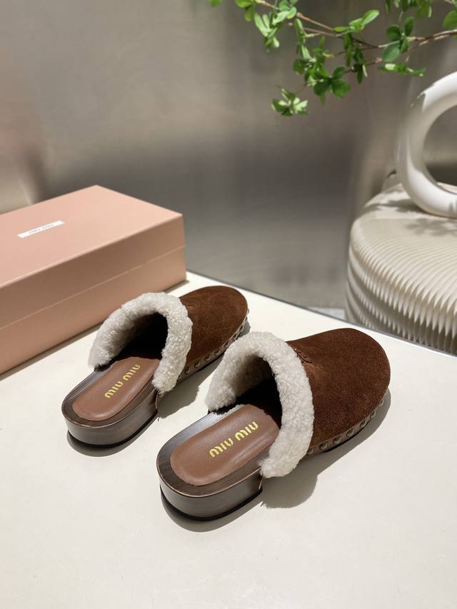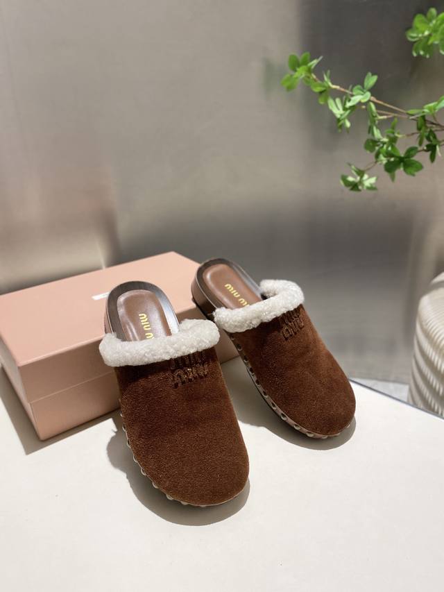 Factory direct new Miu Miu autumn/winter wool closed-toe slippers, comfortable and soft to wear, super convenient, slip-on slippers for going anywhere. Upper: cow suede, lining: wool, sheepskin insole, original mold, non-slip PU foam sole. Heel height: 3cm. Sizes 35-41. Sizes 40 and 41 are non-refundable and non-exchangeable.