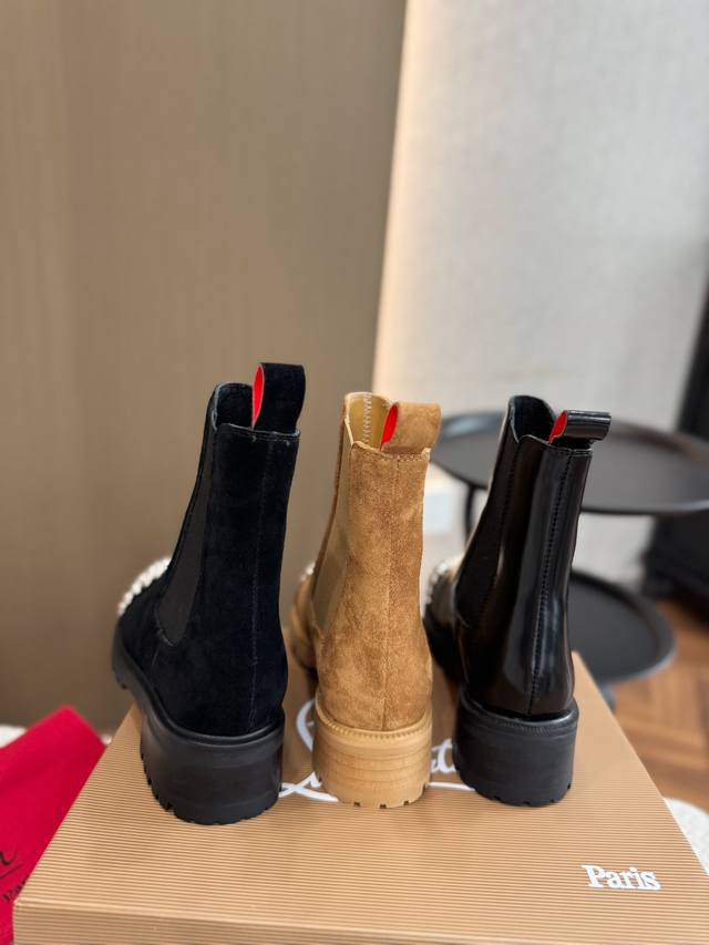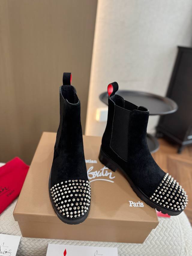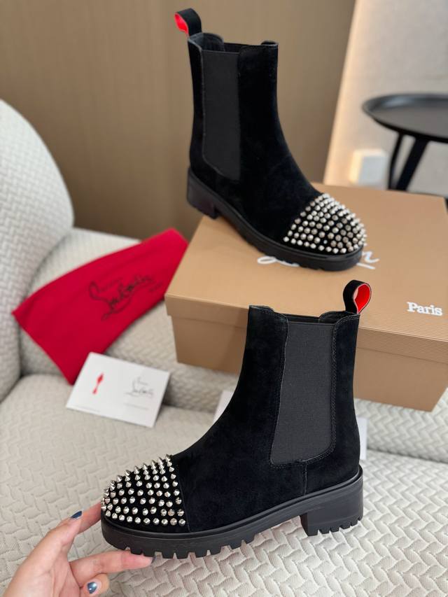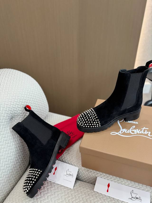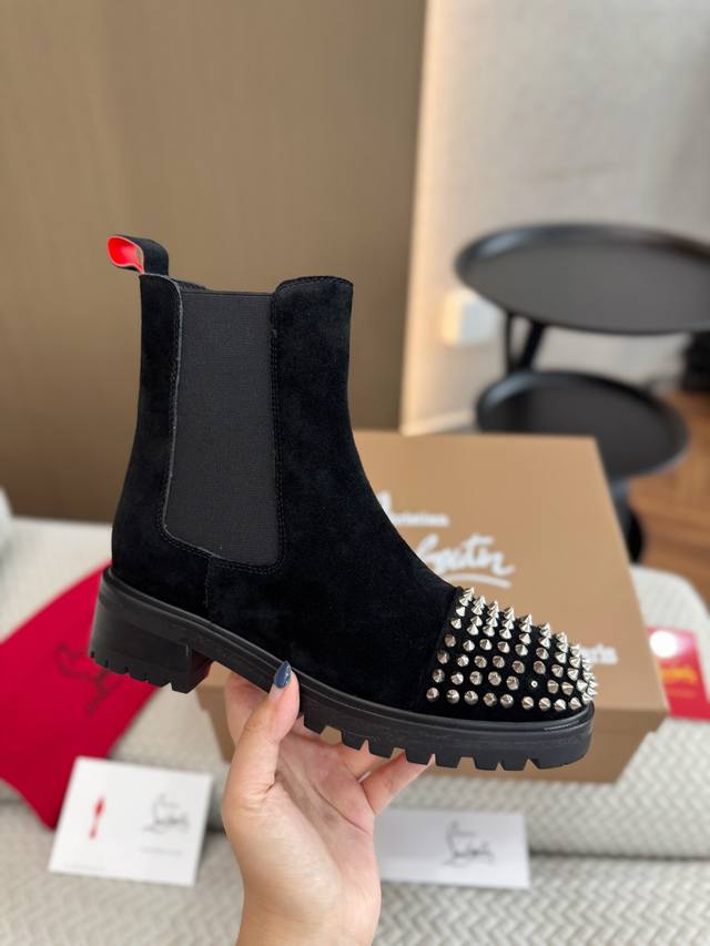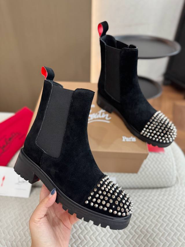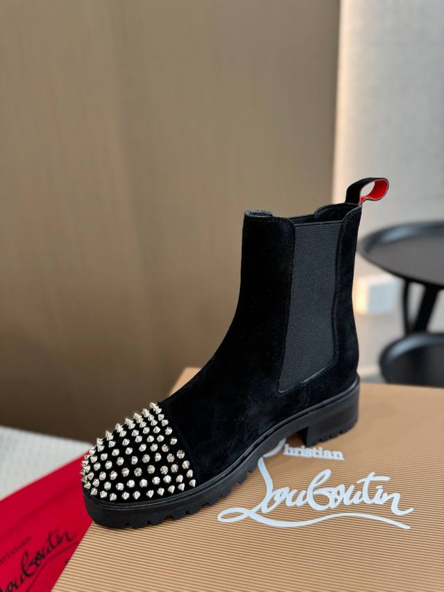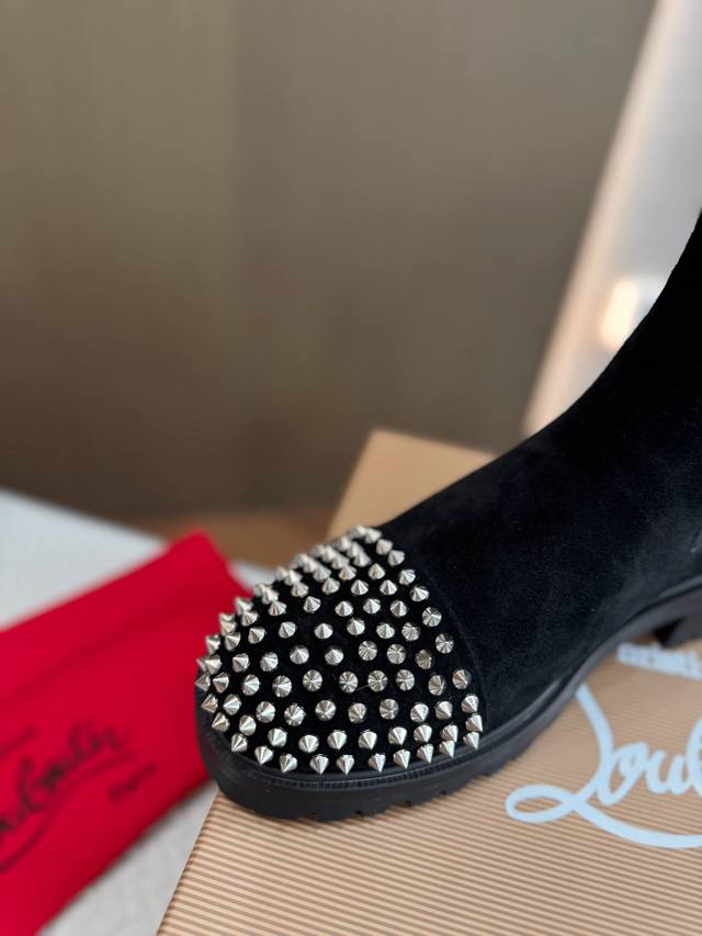 Factory direct price Christian Louboutin Autumn/Winter New Arrival Hot Selling Item. Forwarding the picture guarantees a sale. Original development, high-quality boutique new product, original packaging, full and stylish boot shape, rivet design on the toe, top-quality double-layer black and red color scheme outsole, color, luster, and texture completely comparable to the authentic product. All these craftsmanship elements, plus celebrity street style photos, are key selling points and reasons why our factory strongly recommends it! Material: Imported cow suede upper with electroplated hardware rivets! Full cow leather lining! Top-quality craftsmanship that ordinary factories cannot achieve, combined two-tone rubber outsole, comes with original boutique packaging. Sizes: 35-40, 41 (custom orders available).