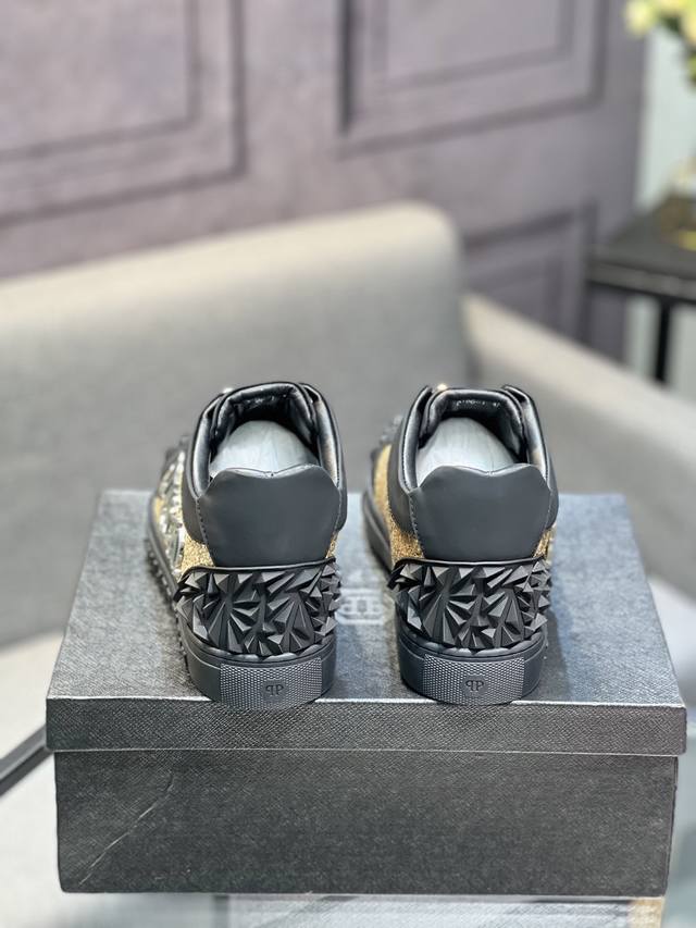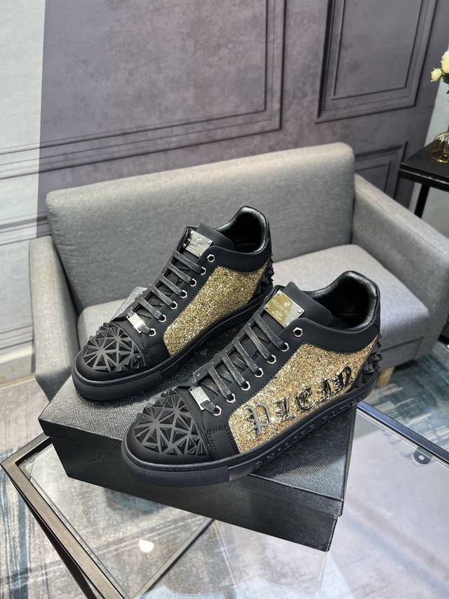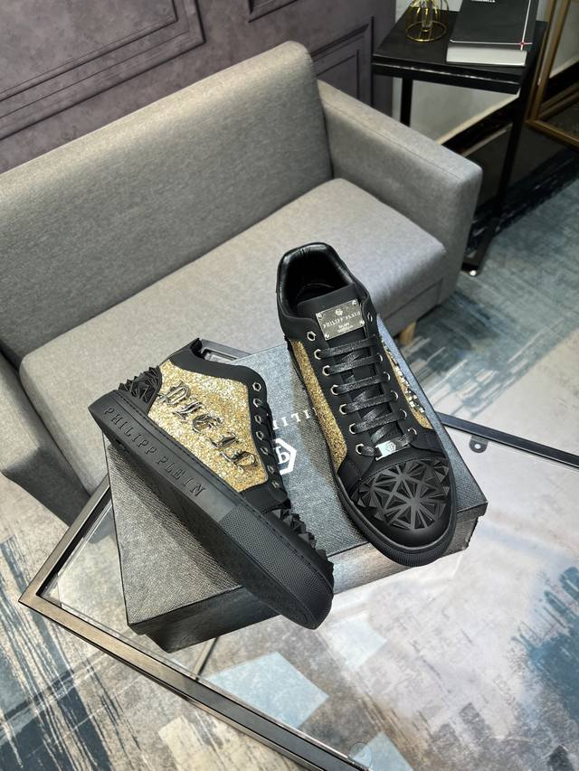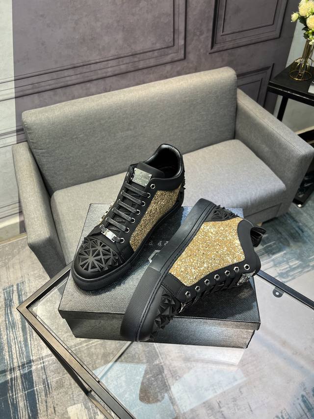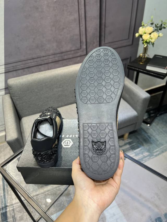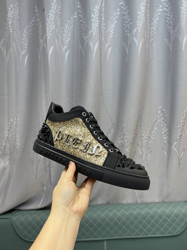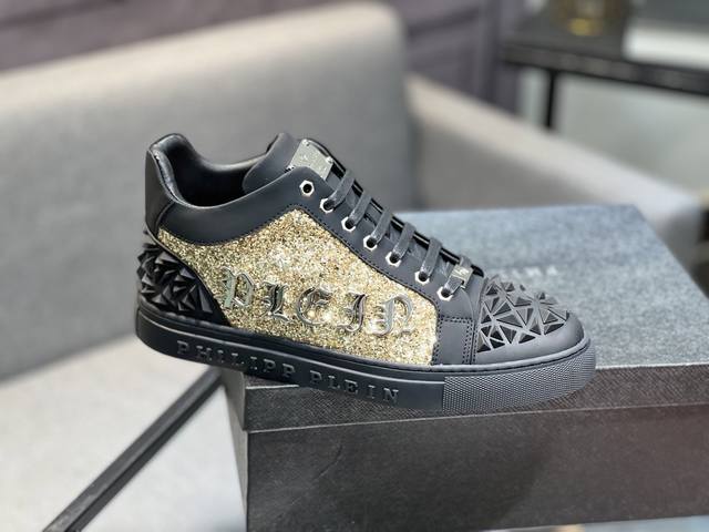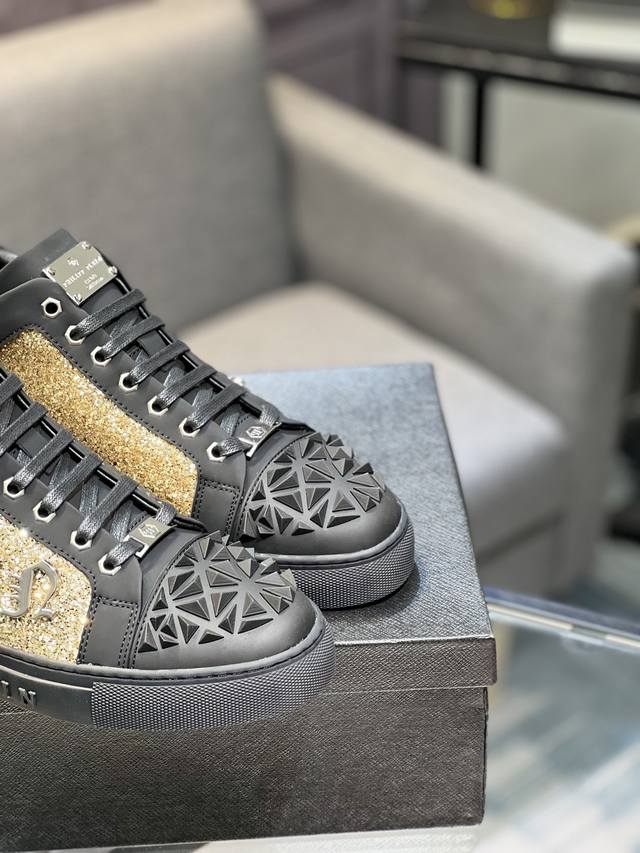 Factory direct price for men's sports shoes, original Philipp Plein high-top men's shoes, high-end brand, imported top-grain cowhide and sheepskin lining, original hardware buckles. A masterpiece, a 1:1 replica of the official quality! Create a stylish and unique look! A must-have classic for trendy men. Sizes 38-44, 45 available for custom orders.