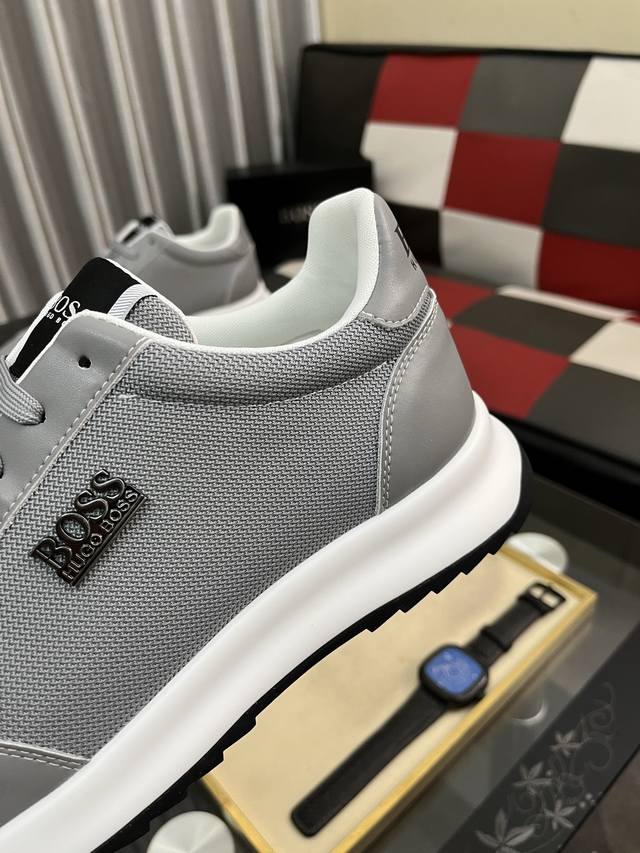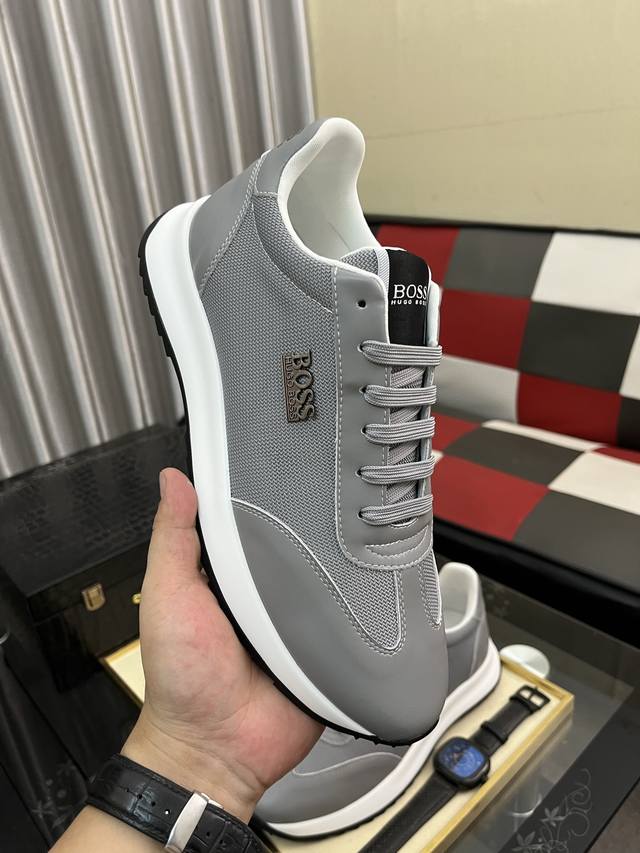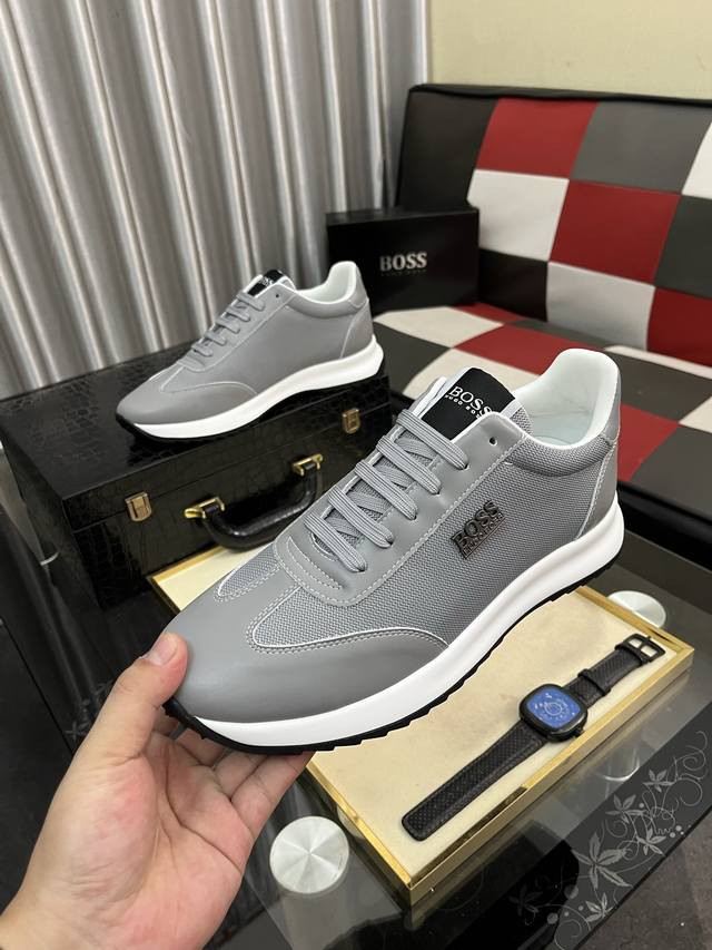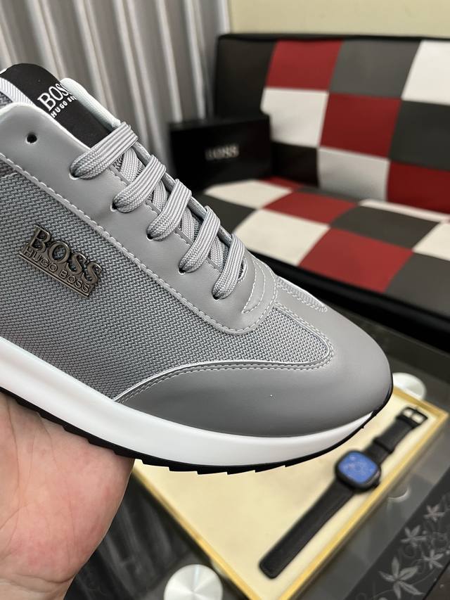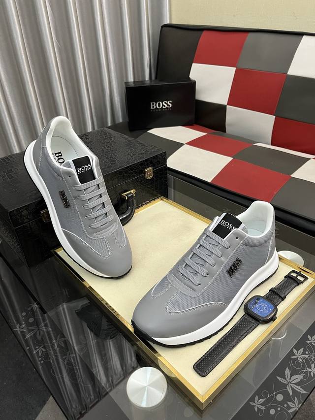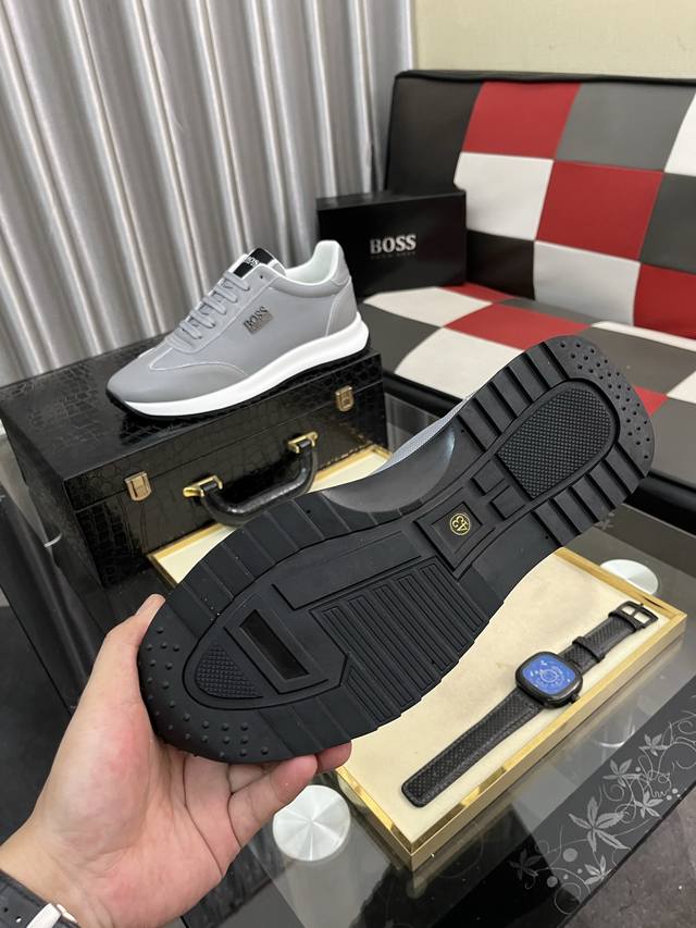 Factory direct price men's sports shoes, original quality BOOS men's casual shoes. The upper is made of imported calfskin, super breathable and comfortable. The inner lining is finely crafted, high-end and stylish. It has a fashionable and classic design. The foamed transparent wear-resistant outsole is comfortable to wear and worth owning. Sizes: 38