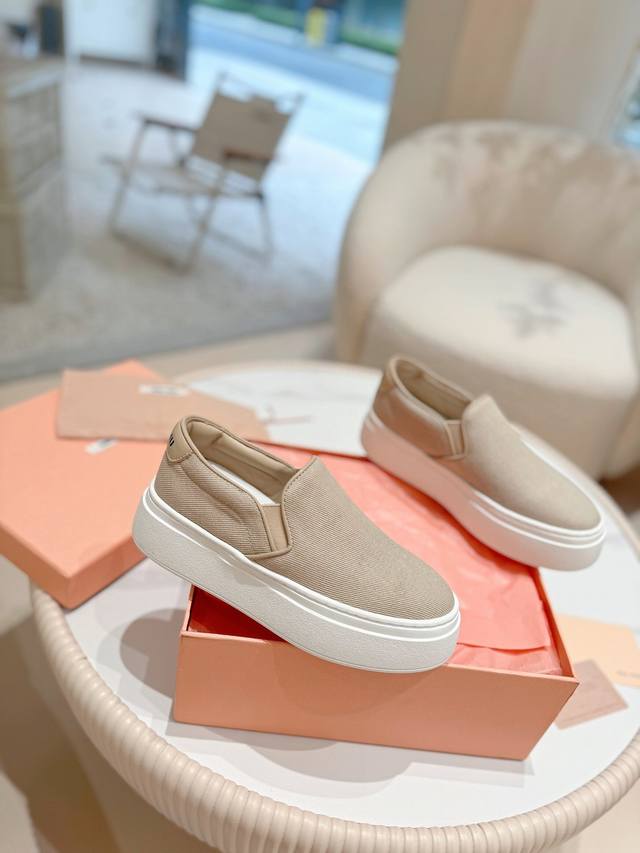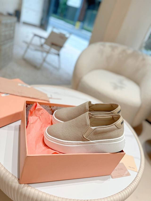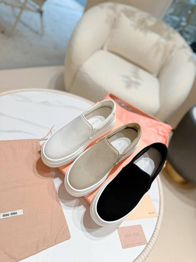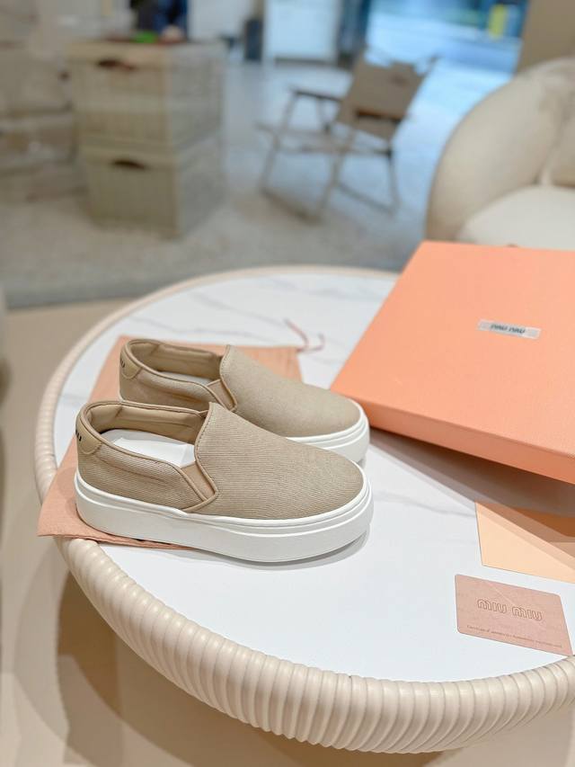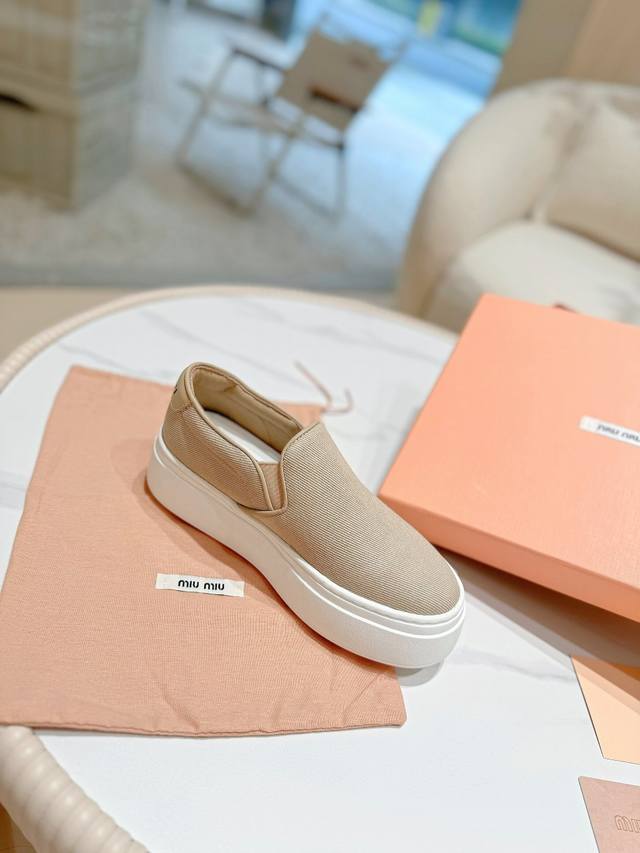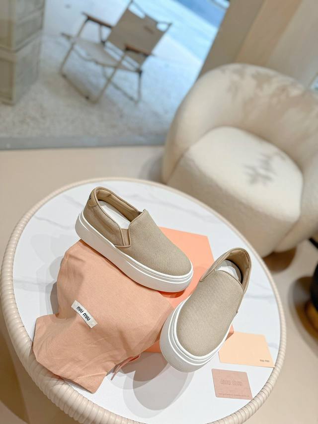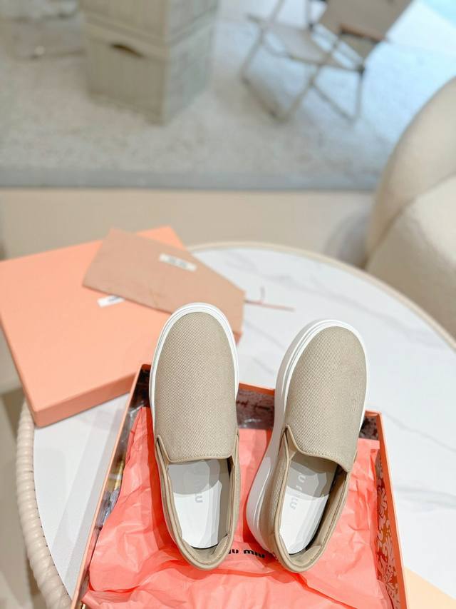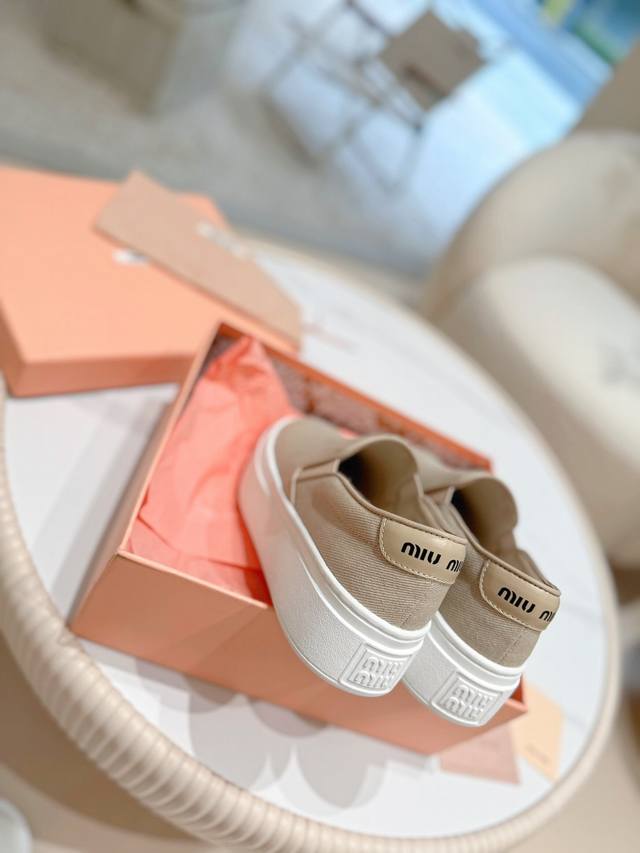 Factory direct price! Miu Miu 24Ss latest chunky casual white sneakers, top-quality, top-tier version, exclusively from official stores! Luxurious and sophisticated, exuding a high-end feel, making you stand out from the crowd! Material: Custom-made original canvas upper, identical to official store styles with no color difference. Superior to all ordinary washed fabrics on the market! Features include: custom-made original canvas lining, custom-molded logo leather insole, and a custom-molded TPU anti-slip outsole (not the bulky rubber outsole found elsewhere). Comes with official store packaging! Available in three colors: black, beige, and apricot. Sizes: 35-40, 41 available for custom orders.
