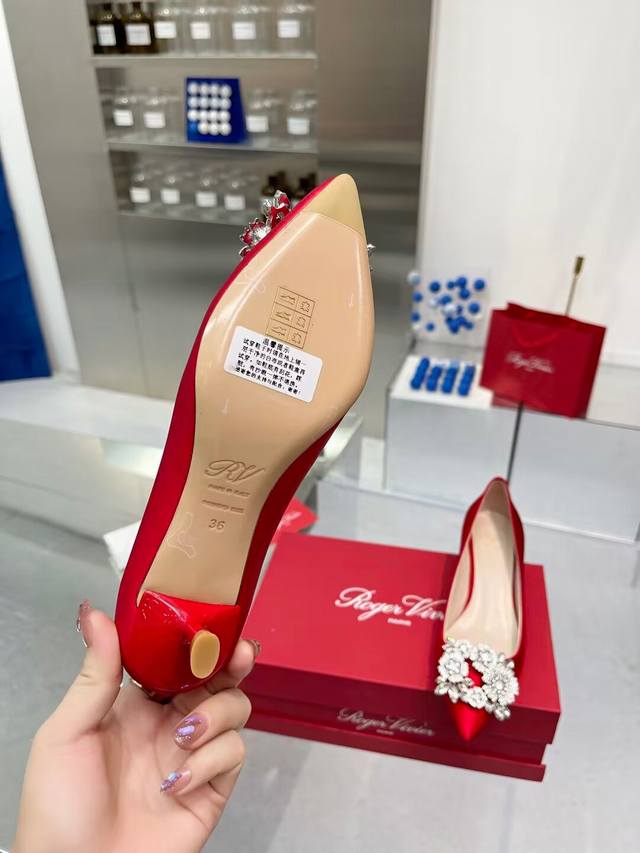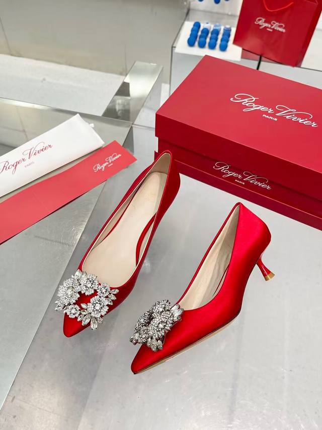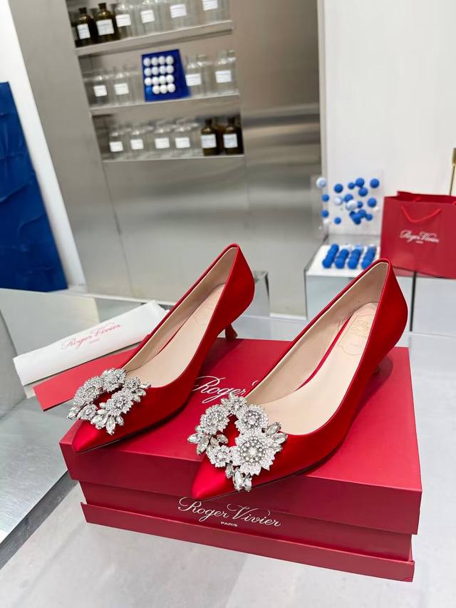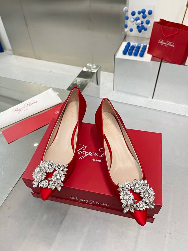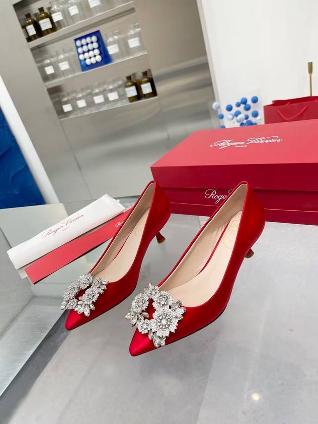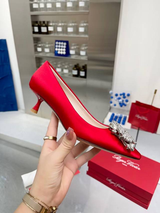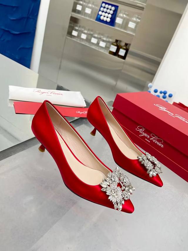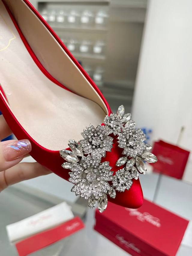 Factory direct price women's shoes, sports shoes, original Roger Vivier new arrivals for all seasons, Rv. Bouquetstrass Czech rhinestone single shoes. Material: Imported silk fabric. Lining: Kunlun light-colored sheepskin lining. Heel height: 4.5cm, sizes 34-39. Custom sizes 40 and 41 available. Luxury buckle: Top-grade sparkling Czech rhinestones. Made with Italian genuine leather sole.