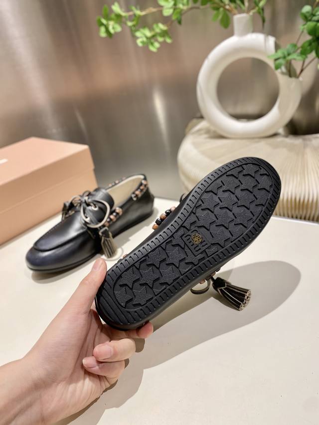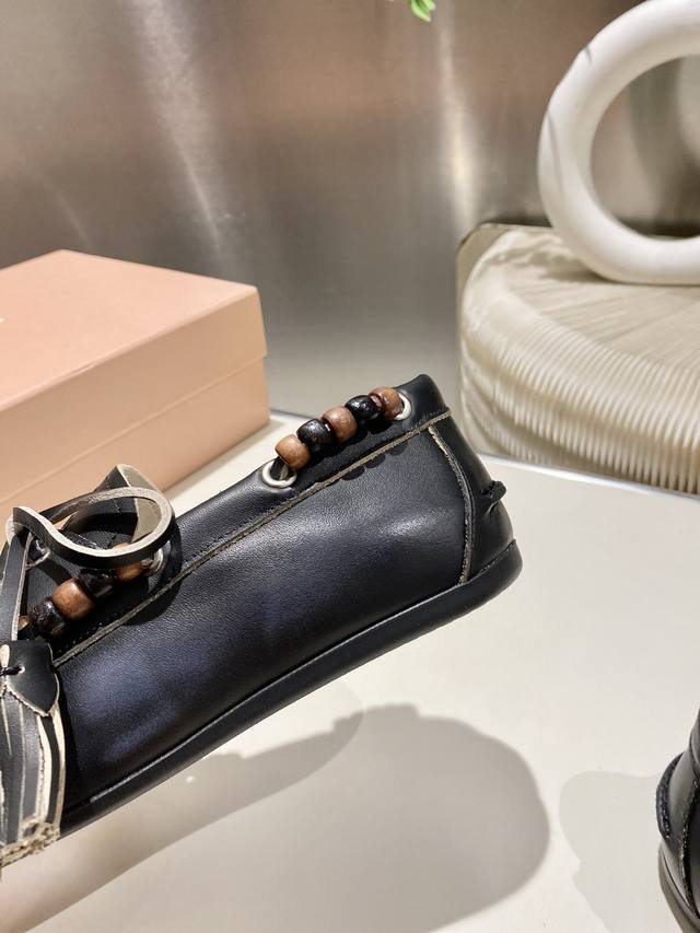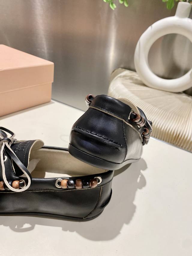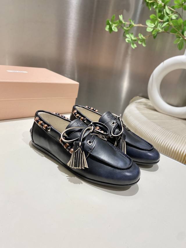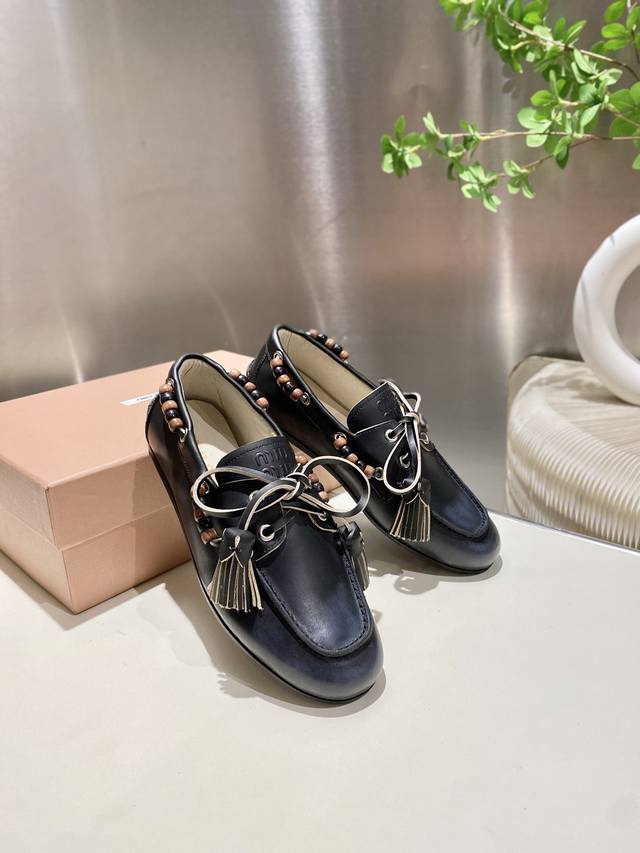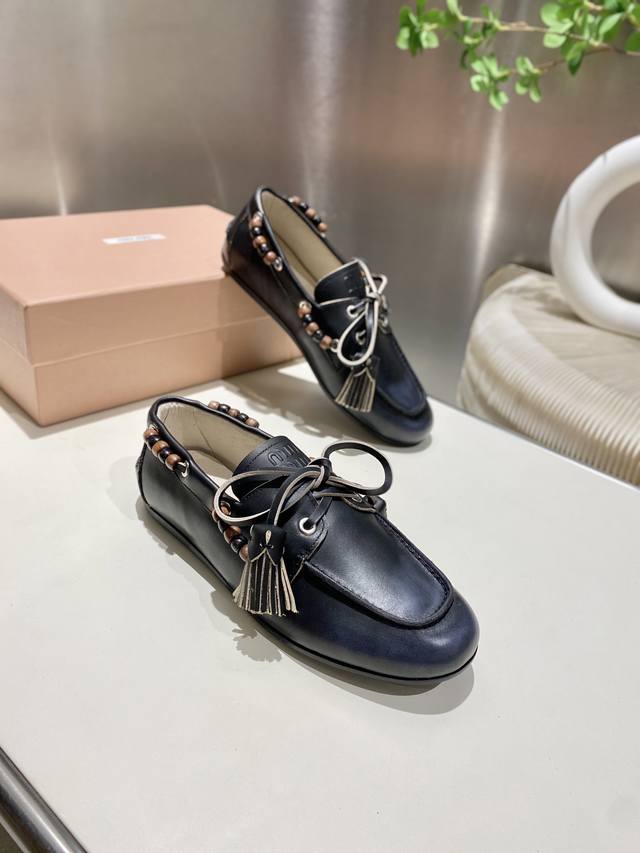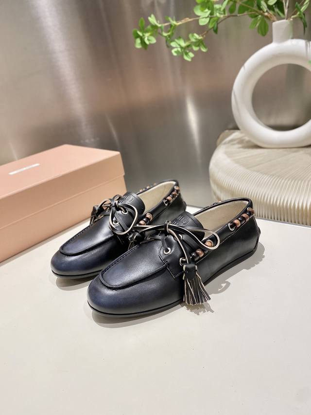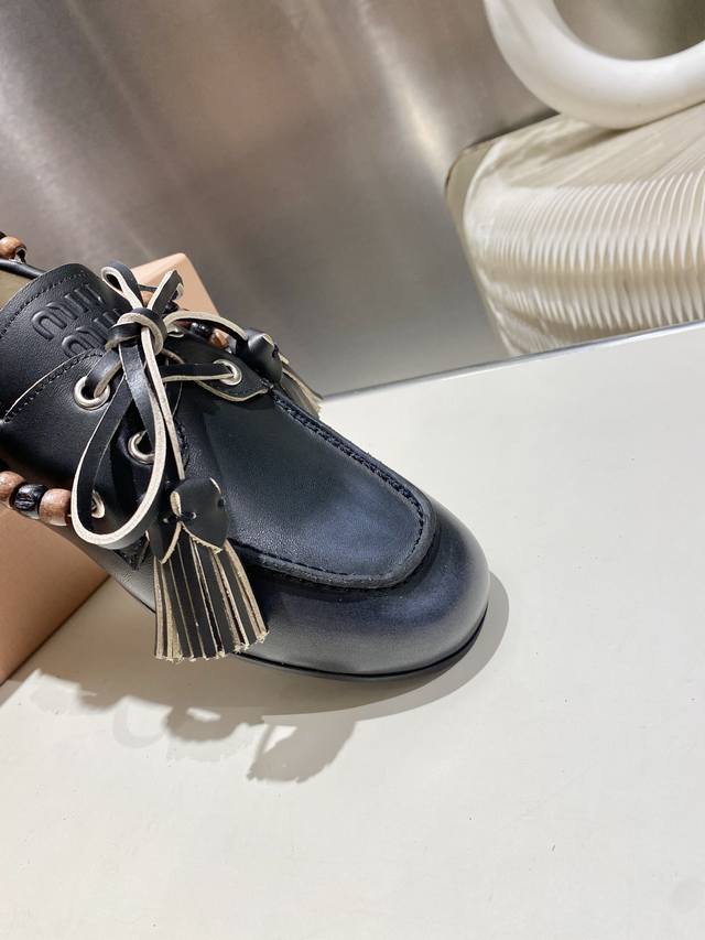 Factory direct single shoes/slippers 330 Miu Miu 2025 distressed lace-up eyelet flat loafers with tassels, new runway style. Retro leather loafers/driving shoes, retro fashion, simple and high-end, easy to match, very comfortable to wear, a must-have item of the year! Super heavy-duty, each pair is unique with distressed finish, original distressed cowhide upper, sheepskin lining, original outsole, sizes 34-41, 34, 40, 41 custom DDD