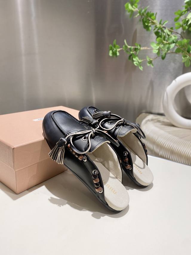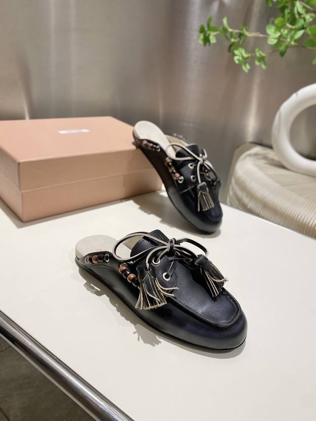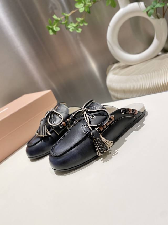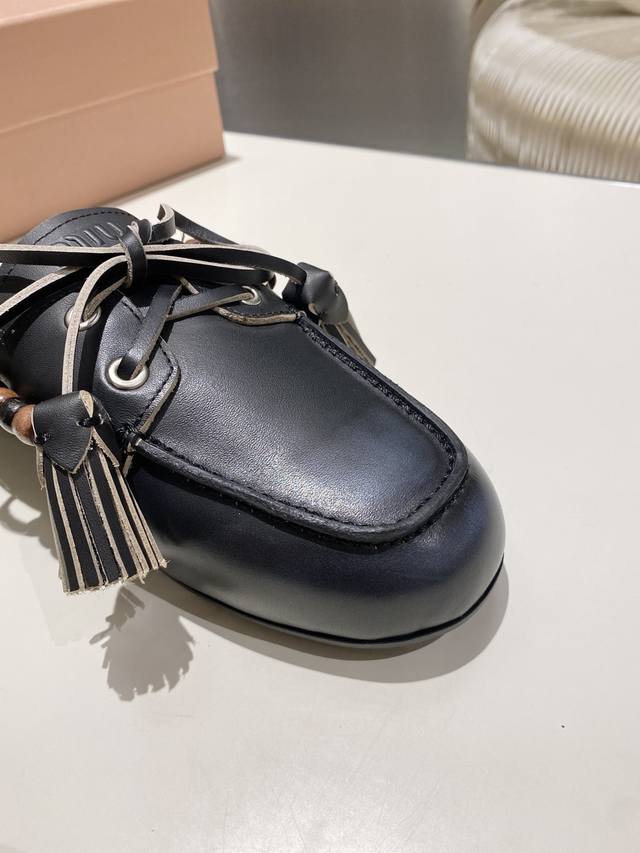 Factory direct single shoes/slippers 330 Miu Miu 2025 distressed lace-up eyelet flat loafers with tassels, new runway style. Retro leather loafers/driving shoes, retro fashion, simple and high-end, easy to match, very comfortable to wear, a must-have item of the year! Super heavy-duty, each pair is unique with distressed finish, original distressed cowhide upper, sheepskin lining, original outsole, sizes 34-41, 34, 40, 41 custom DDD