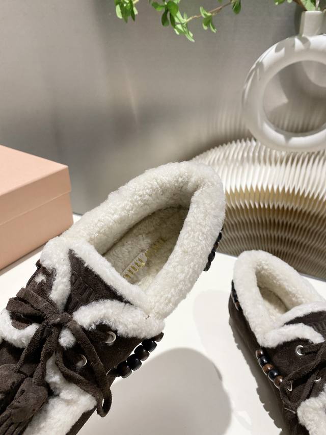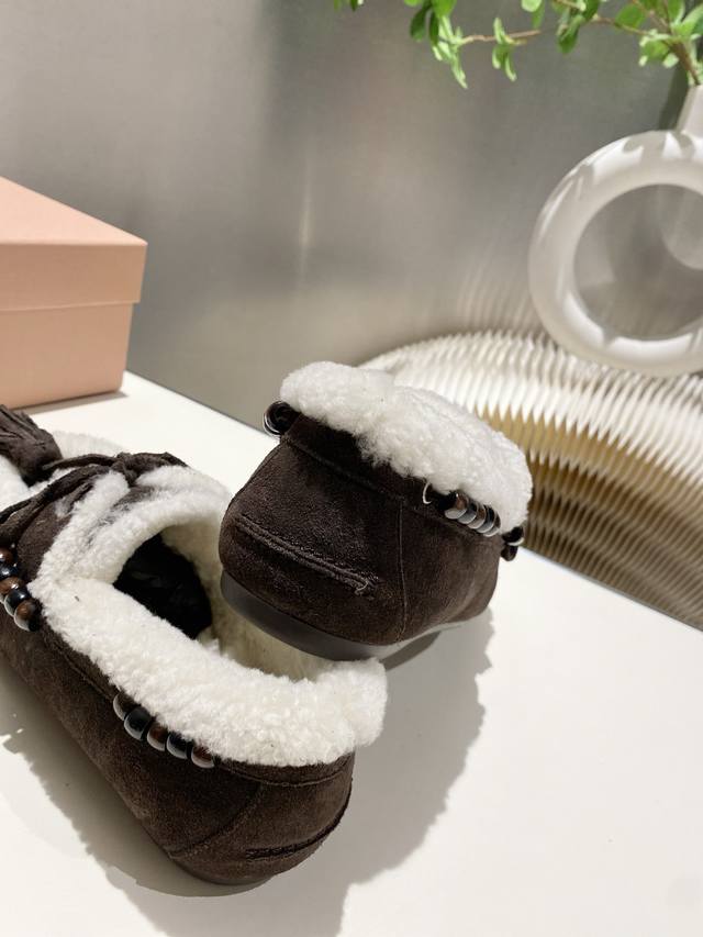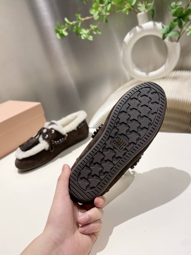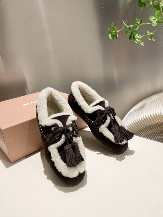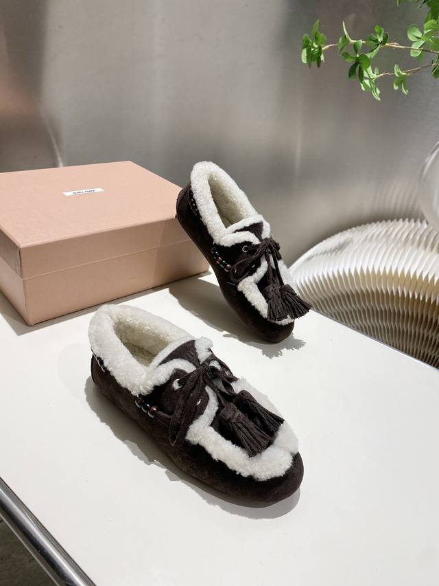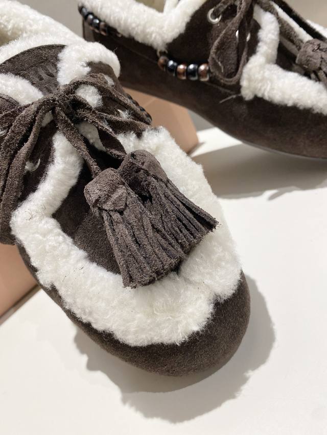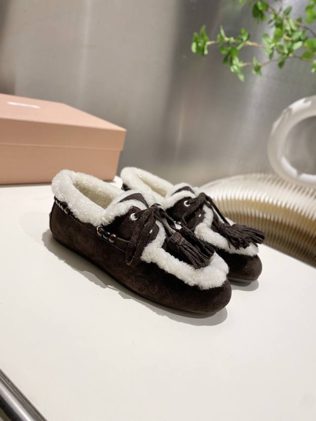 Factory direct stock Miu Miu 2025 flat loafers with fur trim, new runway style with tassels. Retro loafers, retro, fashionable, simple, and high-end, easy to match, very comfortable to wear, a must-have item of the year! Original cow suede upper, wool lining, original outsole. Sizes 34-41. Custom sizes available (34, 40, 41).