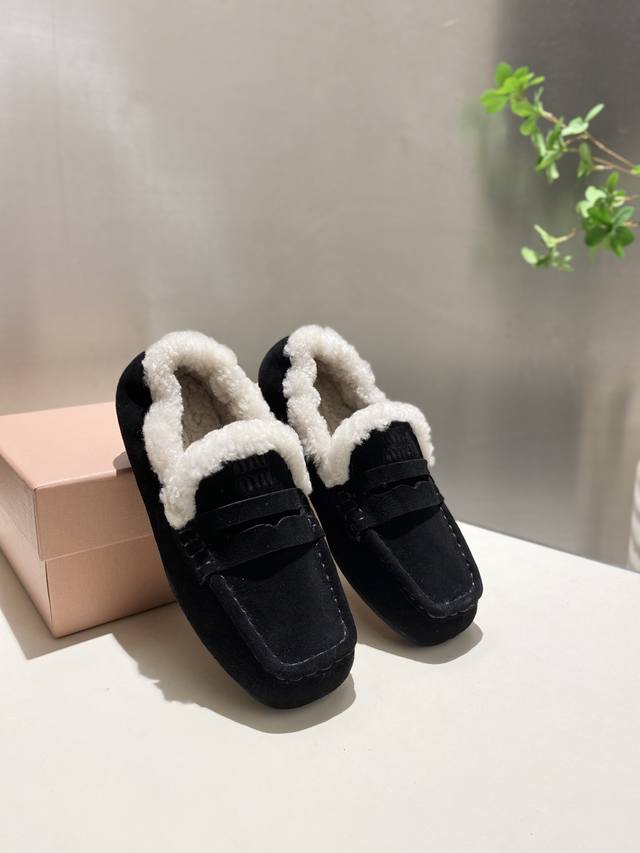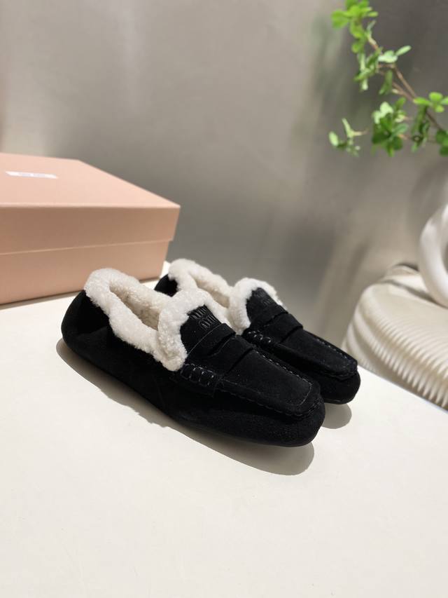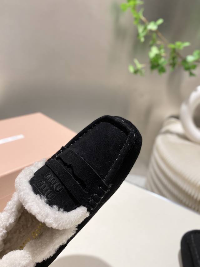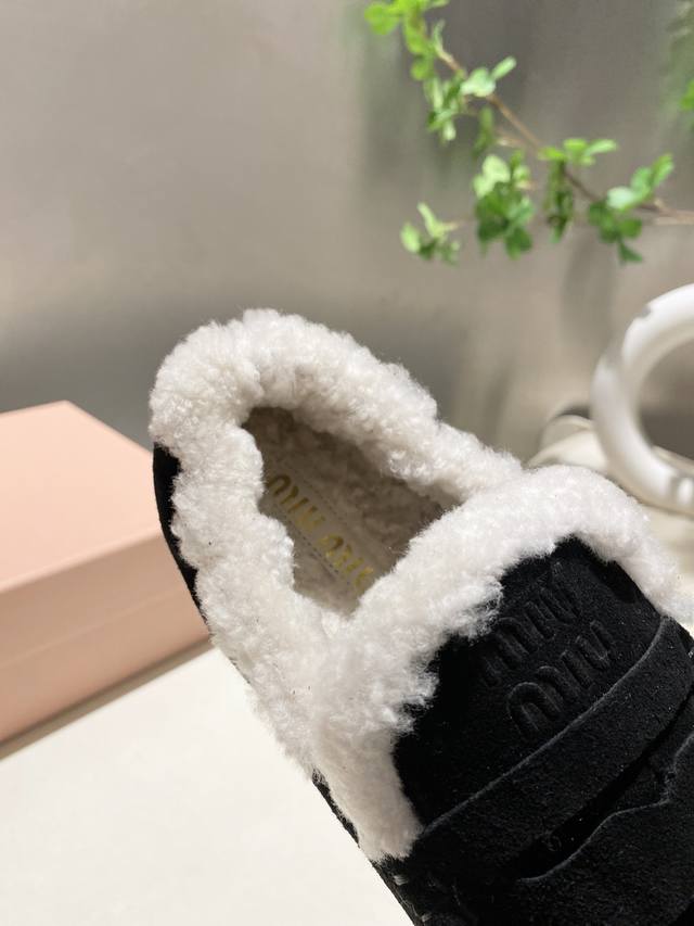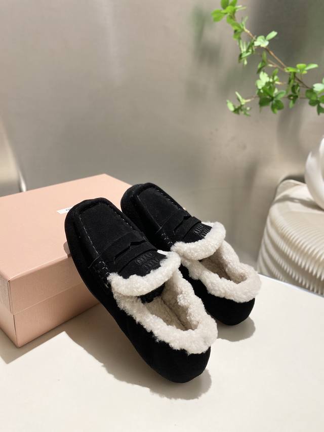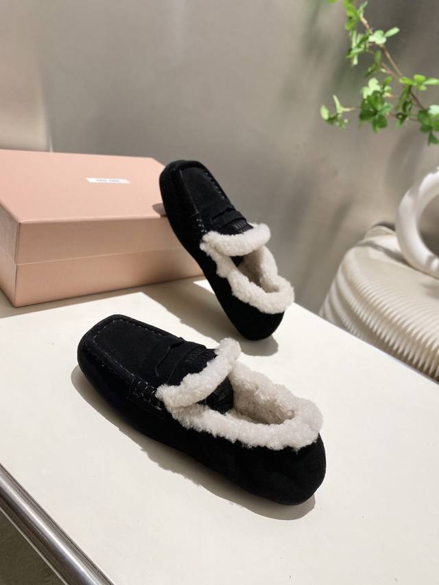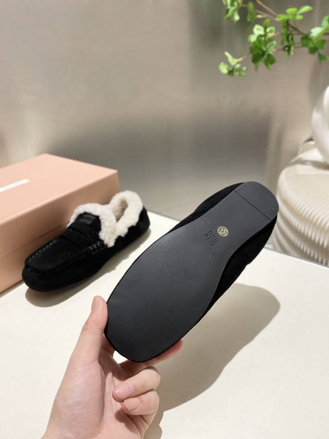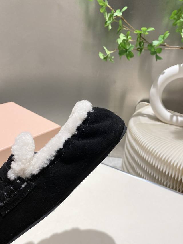 Factory direct, two versions available: leather-lined and fur-lined, flat heel, 4.5cm. Miu Miu 2025 Early Spring/Summer runway new style slip-on Mary Jane ballet flats. Official Spring/Summer runway new style, fashionable and versatile, super easy to wear barefoot or with socks! 1:1 replica of the original. Upper: Custom imported cowhide. Lining: Sheepskin. Sole: Boutique outsole. Sizes: 34-41. Sizes 34, 40, and 41 are custom-made and non-refundable.