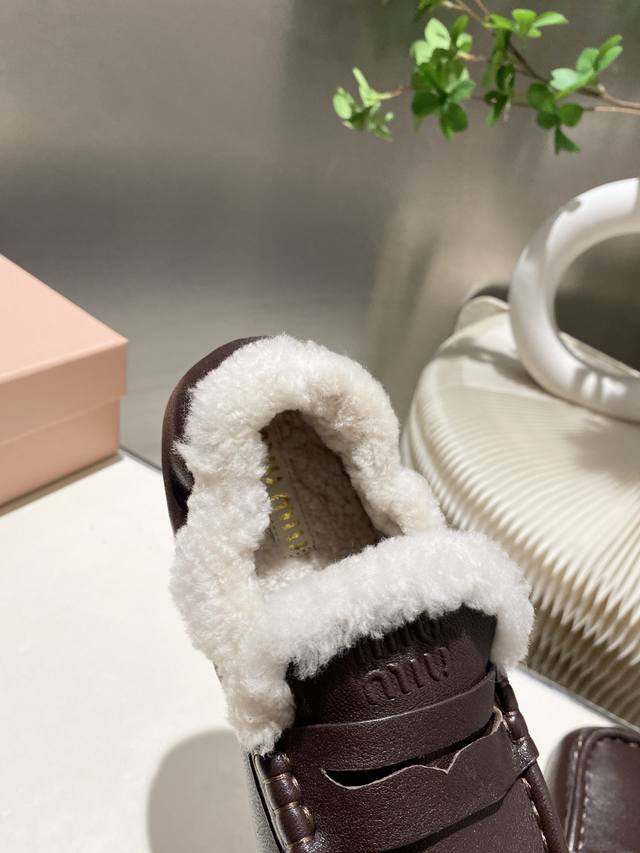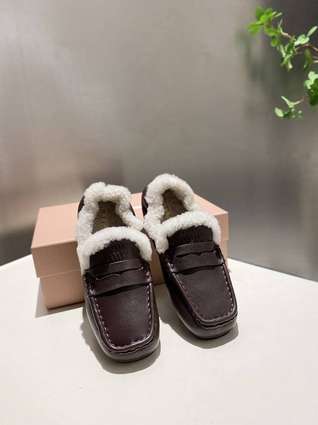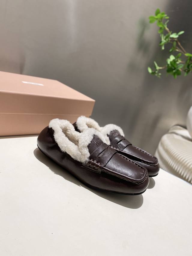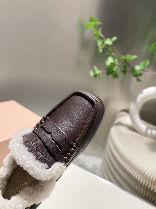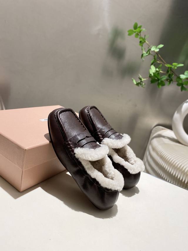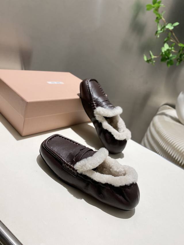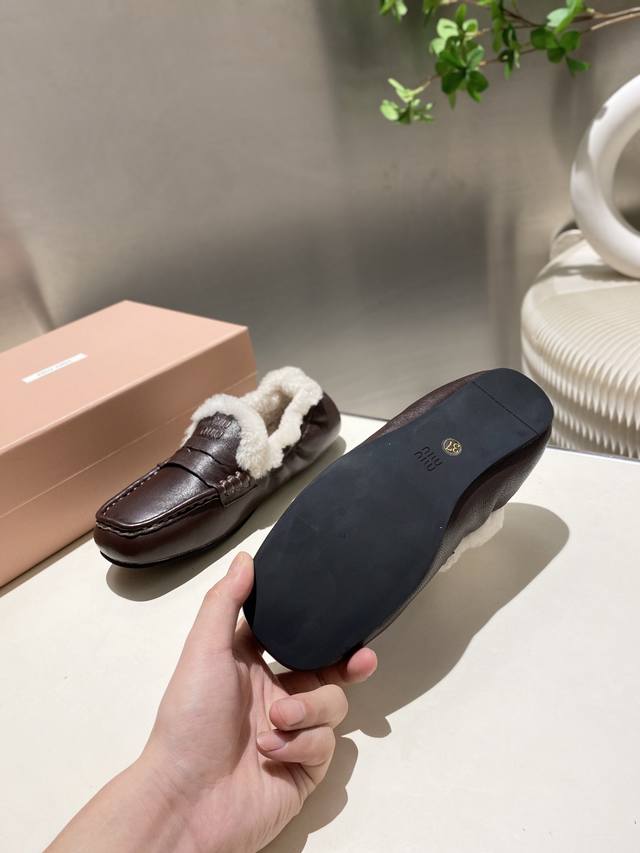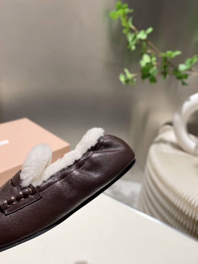 Factory direct, two versions available: leather-lined and fur-lined, flat heel, 4.5cm. Miu Miu 2025 Early Spring runway new style slip-on Mary Jane ballet flats. Official Spring/Summer runway new style, fashionable and versatile, super versatile whether worn barefoot or with socks! 1:1 replica of the original. Upper: Custom imported cowhide. Lining: Sheepskin. Sole: Boutique outsole. Sizes: 34-41. 34.4041 is a custom order and cannot be returned or exchanged.