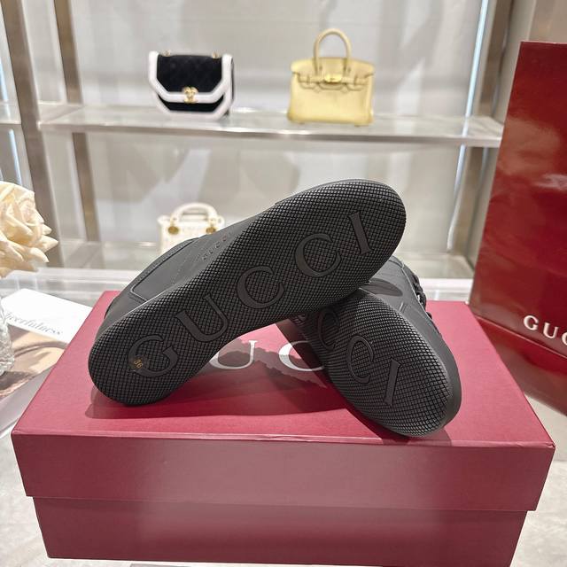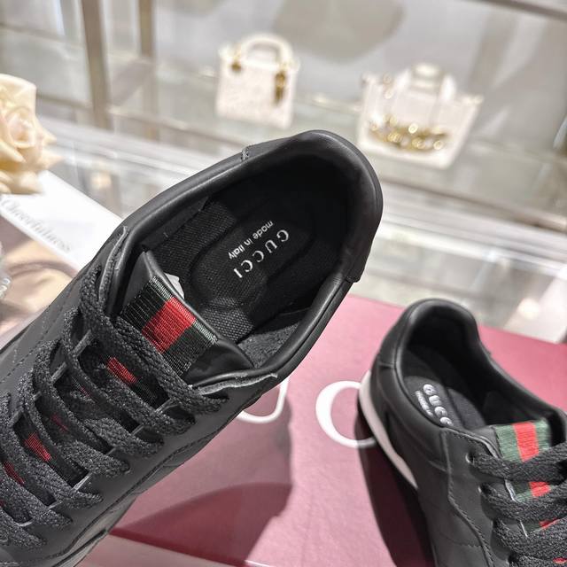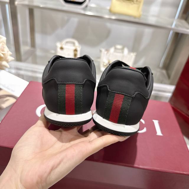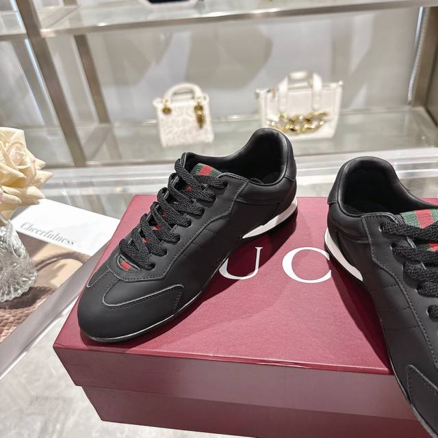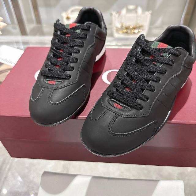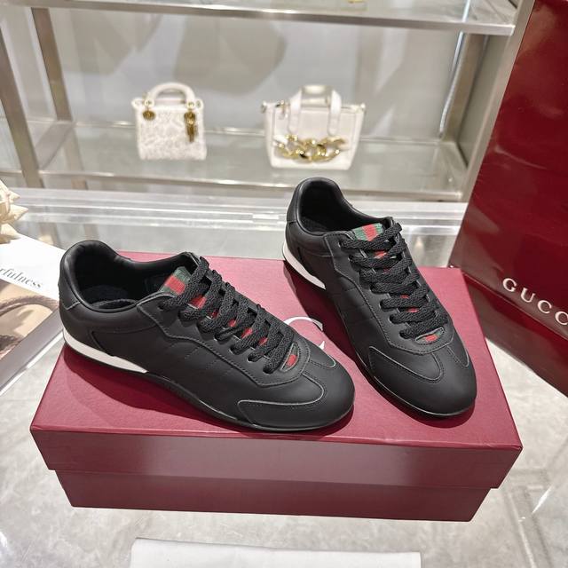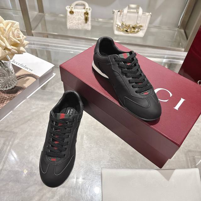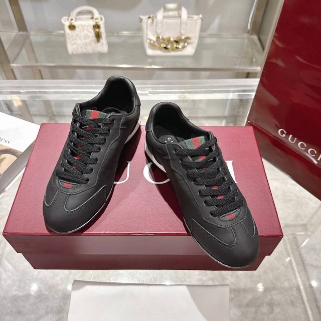 Gg German training shoes, hot-selling style, lightweight design reinterprets sporty fashion. Exquisite texture on the feet. Side stitching details add a finishing touch. Black cowhide upper, black cowhide lining, one-piece latex insole. Signature red and green webbing on the tongue and heel. Two-tone rubber sole. Unisex, women's sizes 35-40. Men's sizes: 39-45. Full packaging.