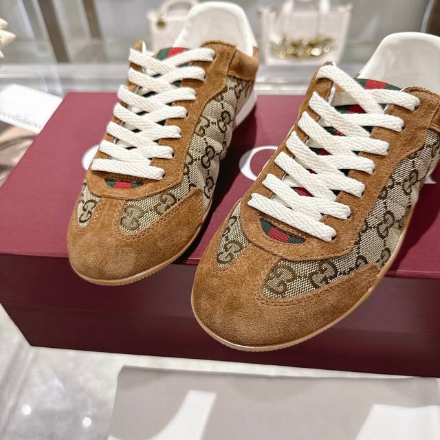 Gg German training shoes, hot-selling style, lightweight design reinterprets sporty fashion. Exquisite texture on the feet. Side stitching details add a finishing touch. Black cowhide upper, black cowhide lining, one-piece latex insole. Signature red and green webbing on the tongue and heel. Two-tone rubber sole. Unisex, women's sizes 35-40. Men's sizes: 39-45. Full packaging.