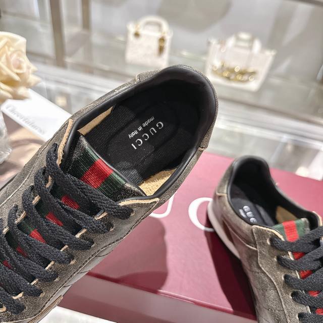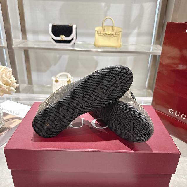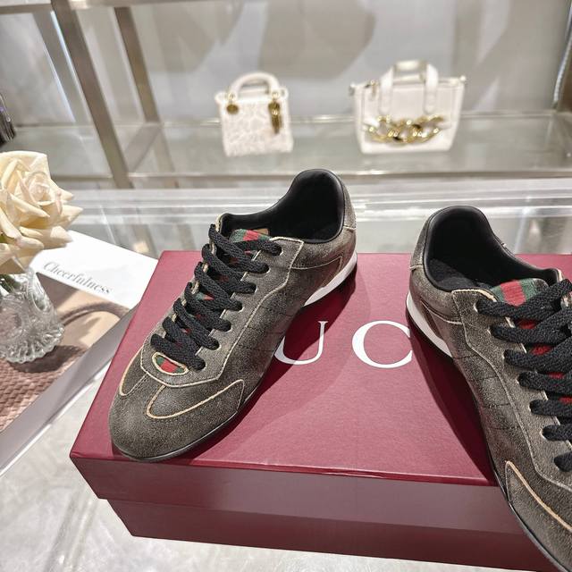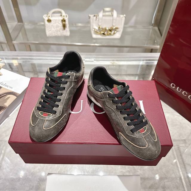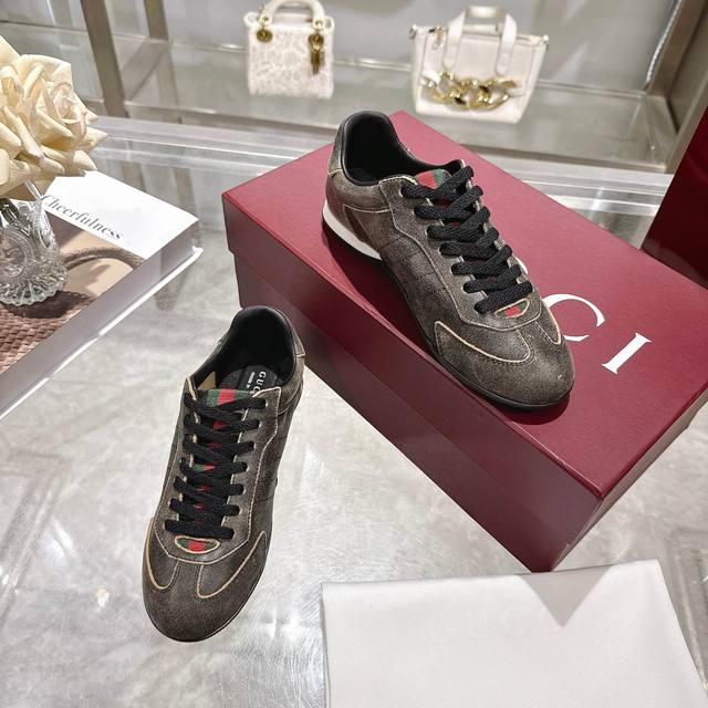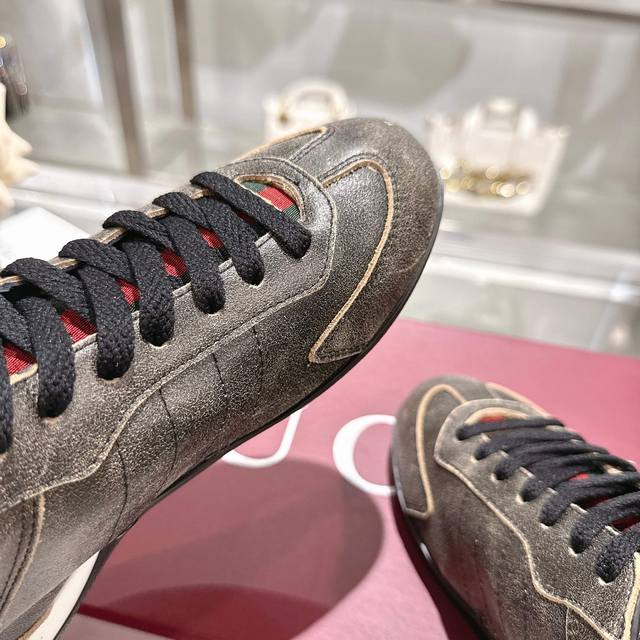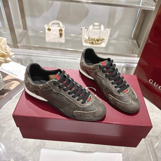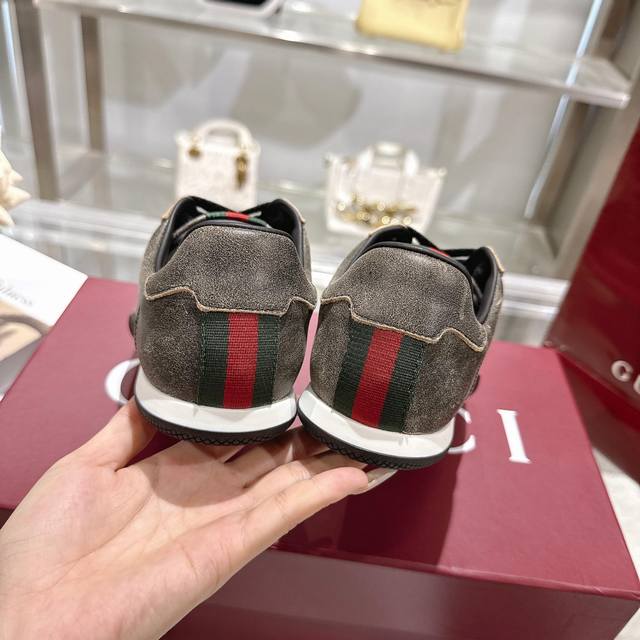 Gg German training shoes, hot-selling style, lightweight design reinterprets sporty fashion. Exquisite texture on the feet. Side stitching details add a finishing touch. Black cowhide upper, black cowhide lining, one-piece latex insole. Signature red and green webbing on the tongue and heel. Two-tone rubber sole. Unisex, women's sizes 35-40. Men's sizes: 39-45. Full packaging.