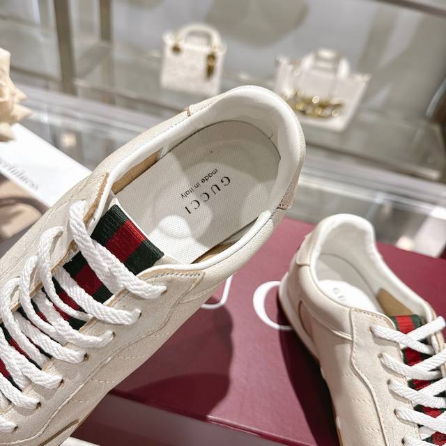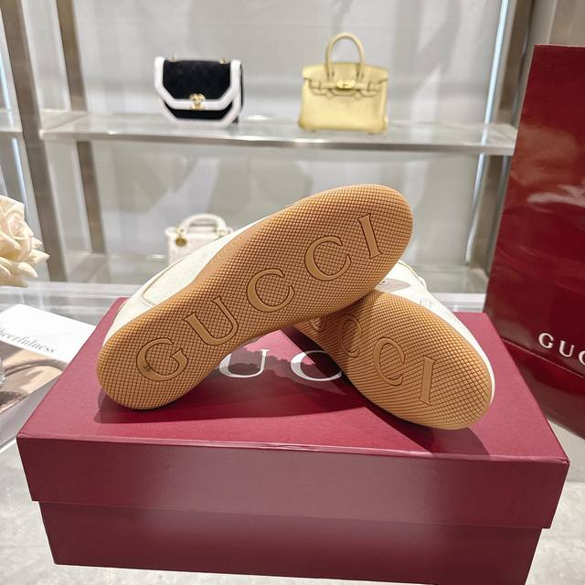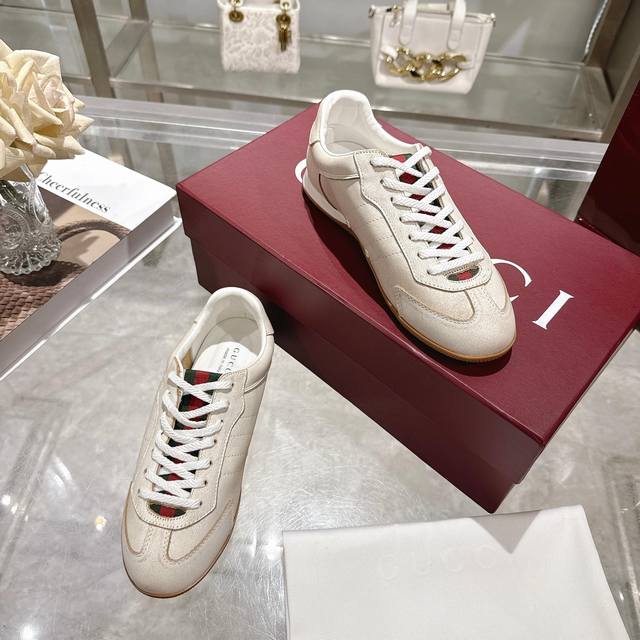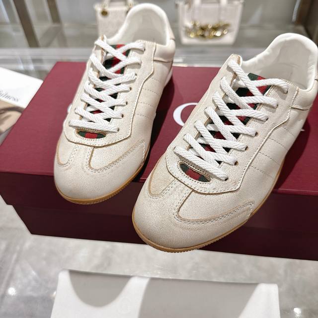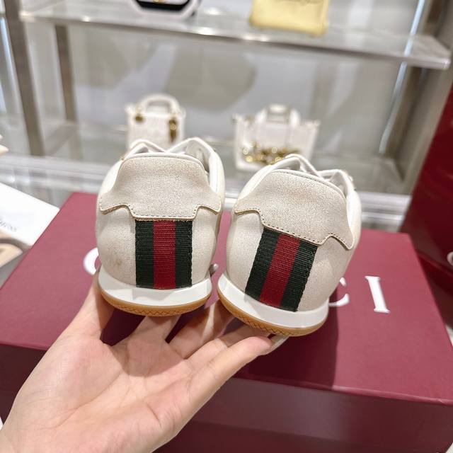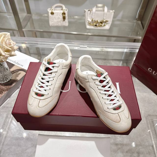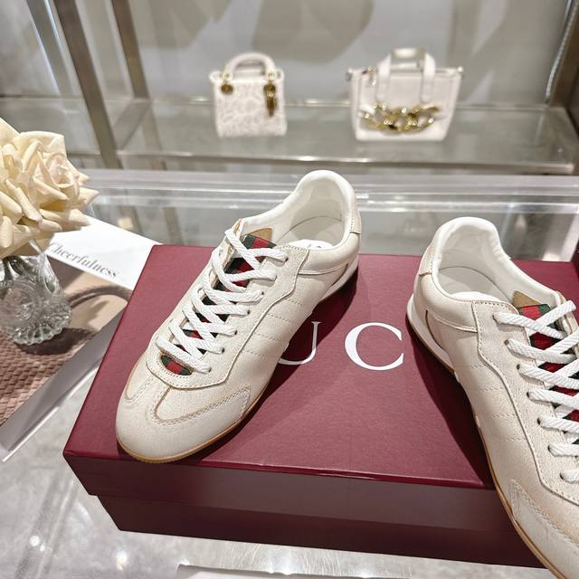 Gg German training shoes, hot-selling style, lightweight design reinterprets sporty fashion. Exquisite texture on the feet. Side stitching details add a finishing touch. Black cowhide upper, black cowhide lining, one-piece latex insole. Signature red and green webbing on the tongue and heel. Two-tone rubber sole. Unisex, women's sizes 35-40. Men's sizes: 39-45. Full packaging.