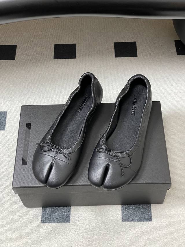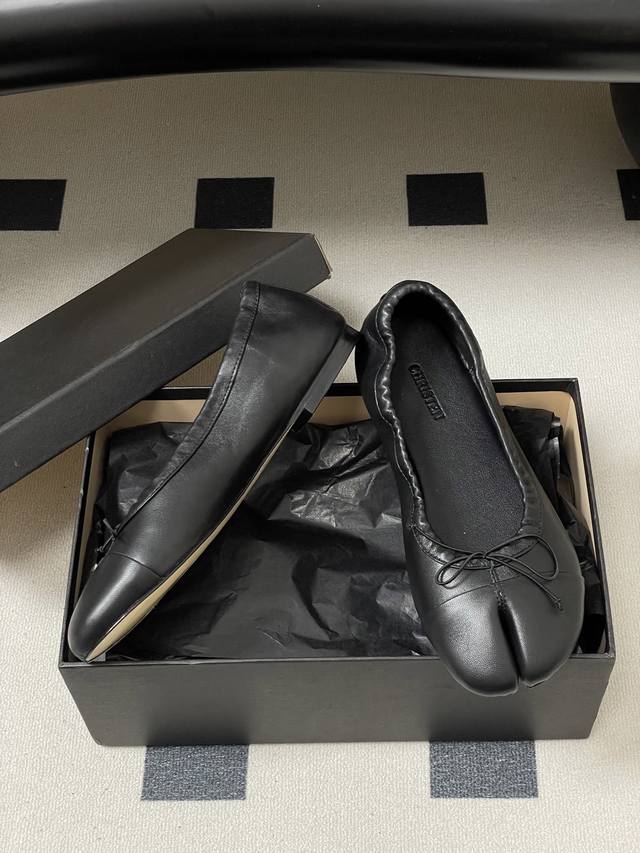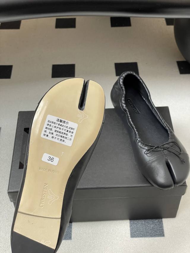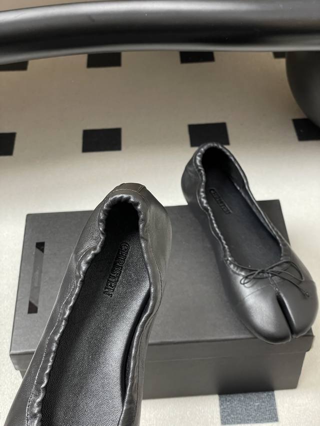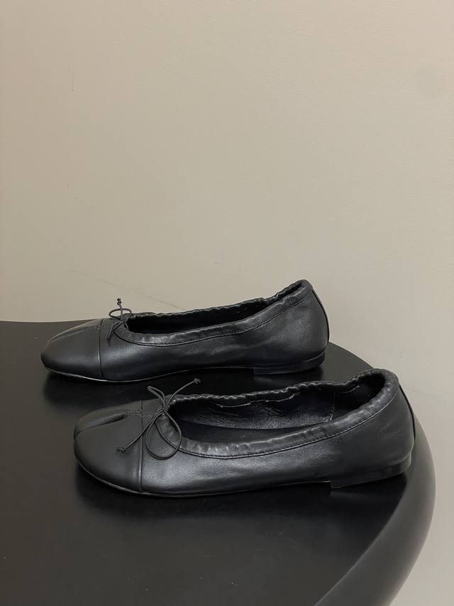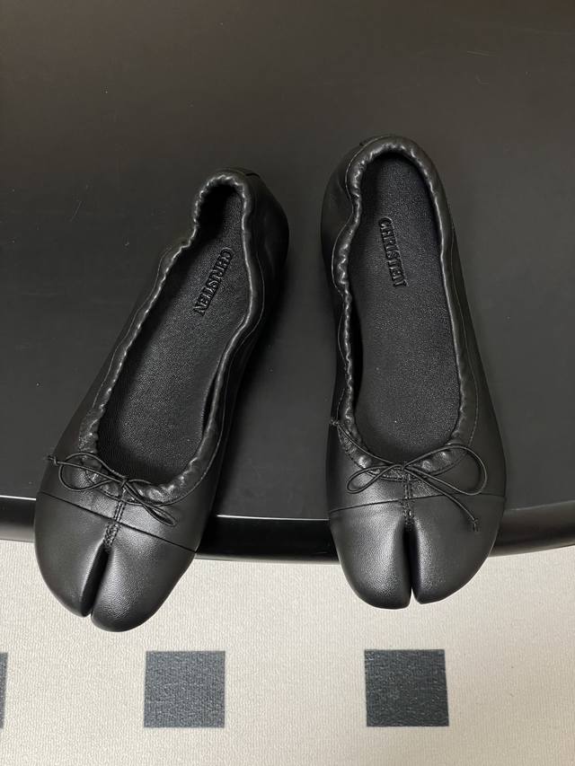 Factory Price - Ddd Christen 26S Spring/Summer New Bow-Tie Split-Toe Ballet Flats, Super Soft Flat Shoes. Ddd features a split-toe design inspired by traditional Japanese tabi socks, separating the big toe from the other toes for a highly distinctive look. The heel-less design is reminiscent of ballet flats, with a soft sheepskin upper and a pleated, elastic design that conforms to the foot's shape, balancing elegance with everyday comfort. Ddd The toe is adorned with a delicate bow. Available in black and white color blocking and pure black, the minimalist design is versatile enough for various occasions, from casual to slightly formal. The sole and stitching details are exquisite; incorporating the brand's century-old shoemaking expertise, the ergonomic design is optimized for Asian foot shapes. Upper: Sheepskin Lining/Insole: Sheepskin Outsole: Italian genuine leather Sizes: 35-39 Size 40: Custom orders, no returns or exchanges.