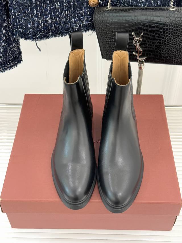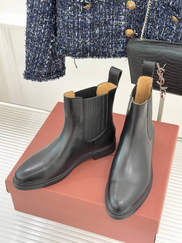 shoe silhouette continues the timeless shape of the Chelsea boot, with clean lines eliminating unnecessary embellishments. Only delicate, elastic side panels echo the classic design language. The rounded toe and ankle-hugging boot shaft balance comfort and a slimming effect, elongating the leg line. The upper is crafted from premium cowhide treated with natural wax, hand-finished for a warm sheen and natural texture, or from tumbled Rugged Calf leather, soft to the touch and possessing a timeless quality. The lightweight rubber sole, crafted with Italian craftsmanship, balances support and comfort at approximately 3cm thickness, with subtle stitching and delicate finishing concealing the craftsmanship. Just like the brand's "quiet power," it uses quality instead of symbols to express its message. The upper uses original custom leather, the lining is all cowhide, and the outsole is custom-made with original molds. Sizes: 35-39, 40, 41, 42 (custom sizes available).