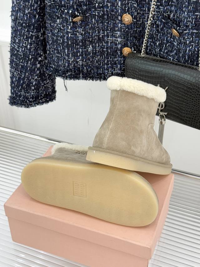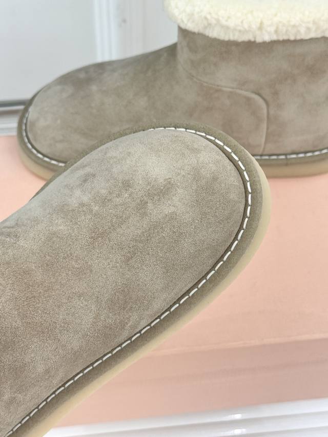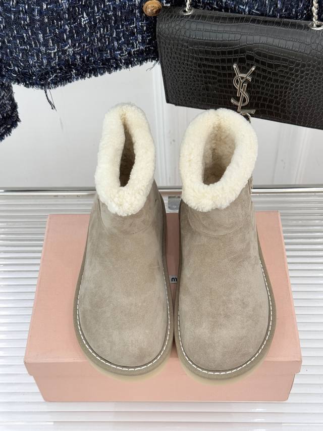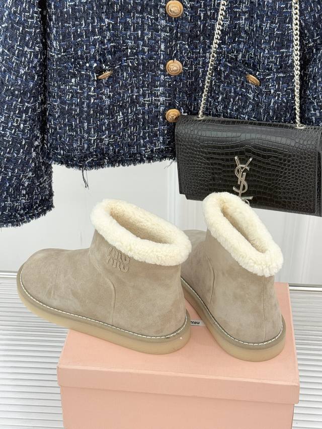 Factory Price Miu Miu 25Wf New Retro Lambswool Thick-Soled Snow Boots. When retro texture collides with a soft, warm touch, it takes the Femininities theme as its core concept, weaving girlishness and practicality into a fashionable symbol for winter, reinterpreting the diverse possibilities of femininity. The upper is crafted from imported New Zealand cow suede; everyday stains can be easily cleaned with a light brush. The lambswool provides full-coverage warmth from toe to insole. The subtle brand logo on the boot shaft contrasts delicately with the soft, plush texture, subtly enhancing its recognizability. The folded-over boot opening adds a retro touch. The meticulous hand-stitched details ensure a long-lasting and refined connection between the fur and leather. These snow boots are more than just a warm garment; they're Miu Miu's gentle interpretation of feminine charm. Their warm, soft texture envelops a free spirit, making every step a romantic winter stroll in a retro style. Sizes: 35-39, 40 (custom sizes available).