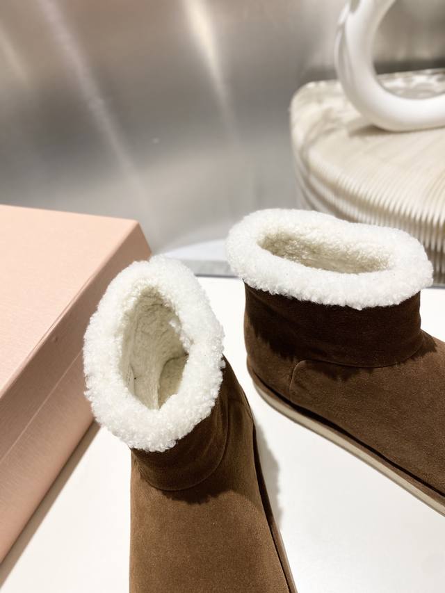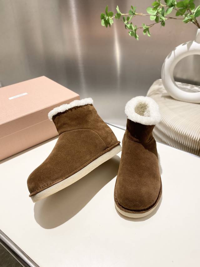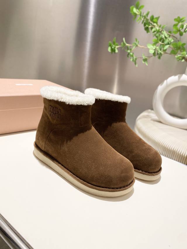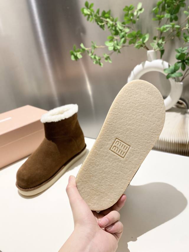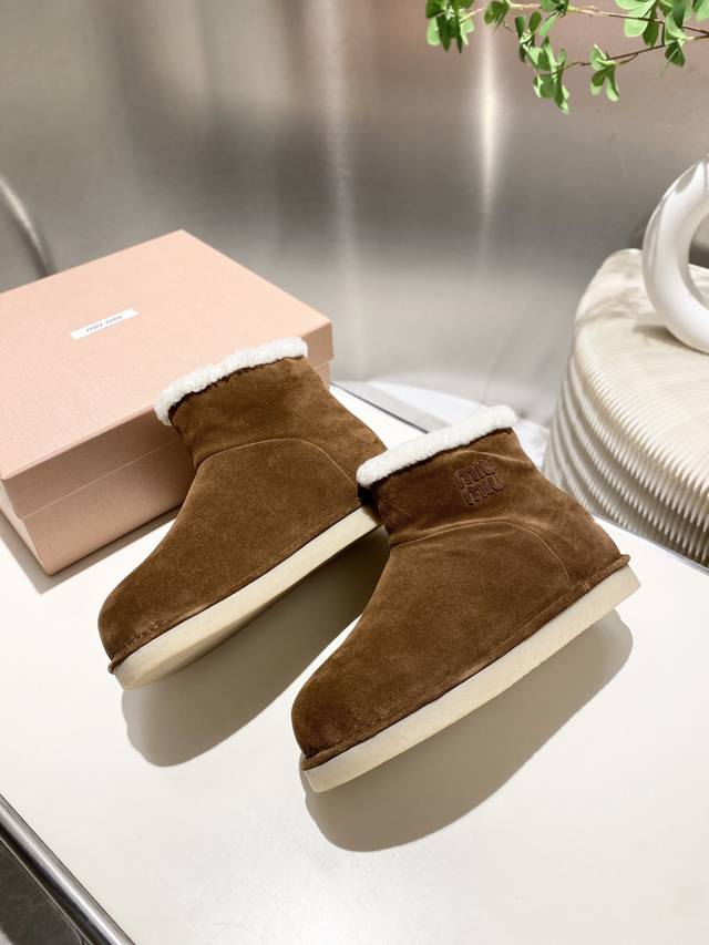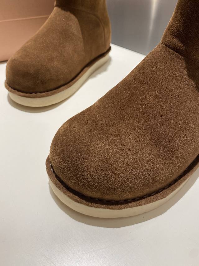 Factory Price p Miu Miu 2025 Fall/Winter Runway New Snow Boots. The most worthwhile boots to buy this year, bar none! Adorned by numerous internet celebrities and stars, this Miu Miu Fall/Winter limited edition is extremely difficult to find in stores. It looks stiff, but it's actually incredibly soft and comfortable! Superb feel! The wide boot shaft provides a relaxed fit regardless of leg size and makes legs appear straight! Full of punk style! Material: Italian imported high-gloss cow suede. Lining: Wool lining. Outsole: Italian one-piece molded outsole. Available in 4 colors, sizes 35-42, 40, 41, 42. Custom orders are non-refundable and non-exchangeable.