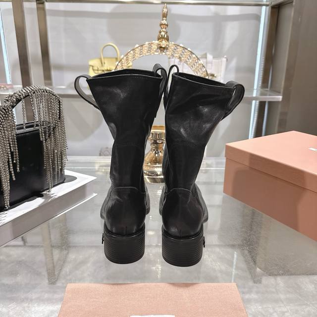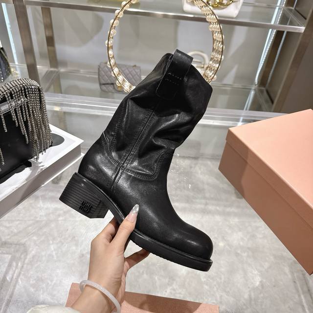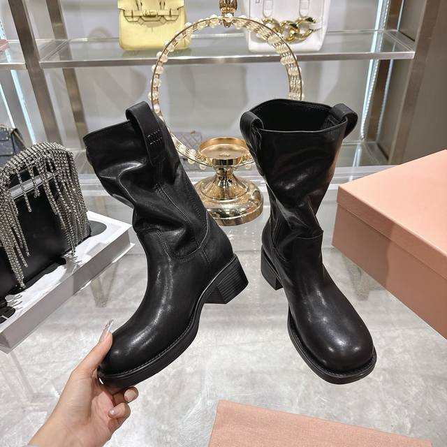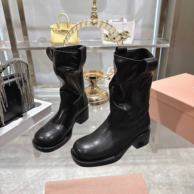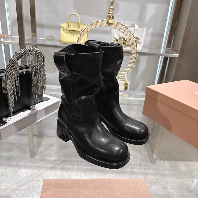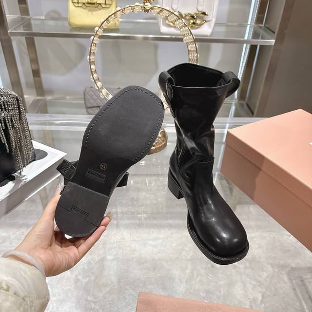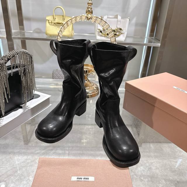 Factory Price p Miu Miu 25th Anniversary Double-Ear Chunky High-Heel Slip-On Ankle Boots, Fall/Winter Runway New Style! This year's most worthwhile boots, bar none! Many internet celebrities and stars have been seen wearing Miu Miu this fall/winter, it's undeniably cool and sexy! This fall/winter limited edition is extremely hard to find in stores. It looks stiff, but it's actually very soft and incredibly comfortable! Superb feel! The wide boot shaft provides a relaxed fit regardless of leg size and makes legs appear straighter! Full of punk style! Material: Distressed calfskin; Lining: Cowhide; Outsole: Italian genuine leather injection-molded sole. Sizes: 34-40.