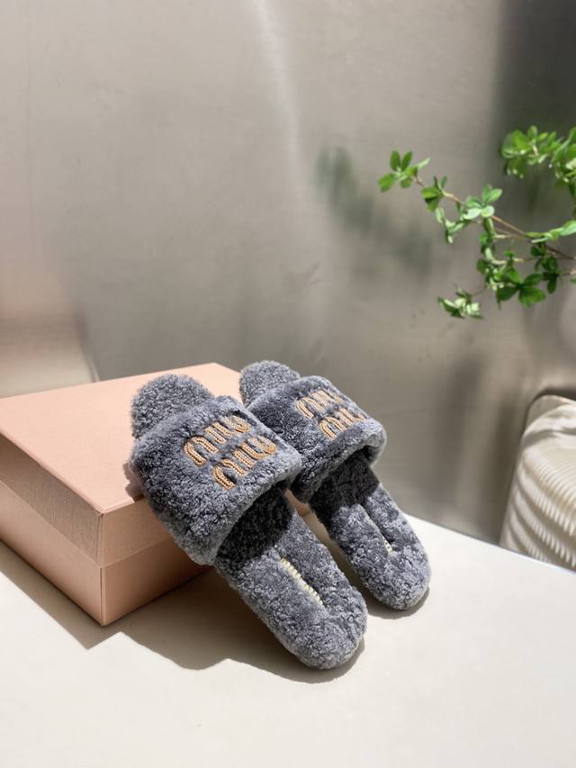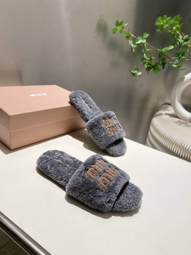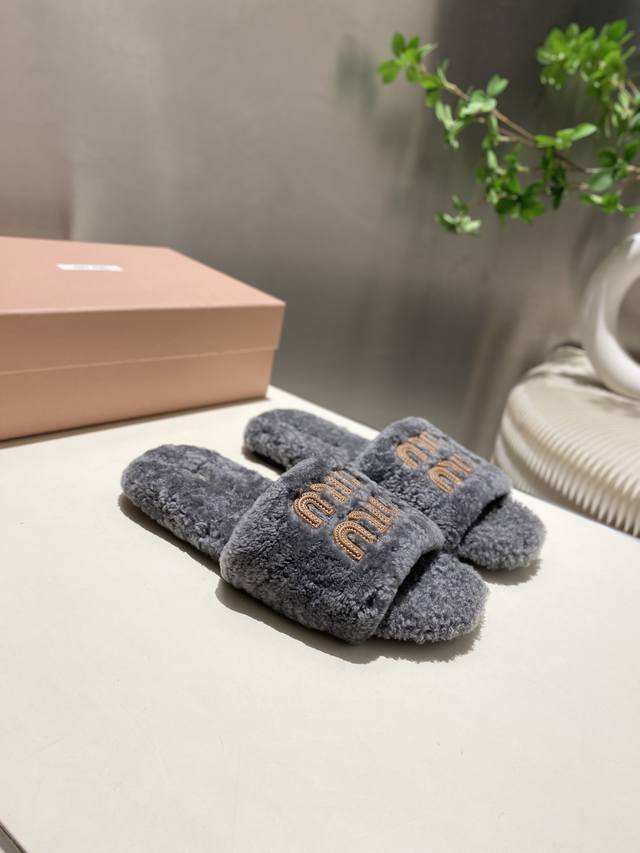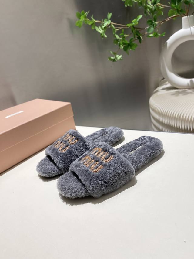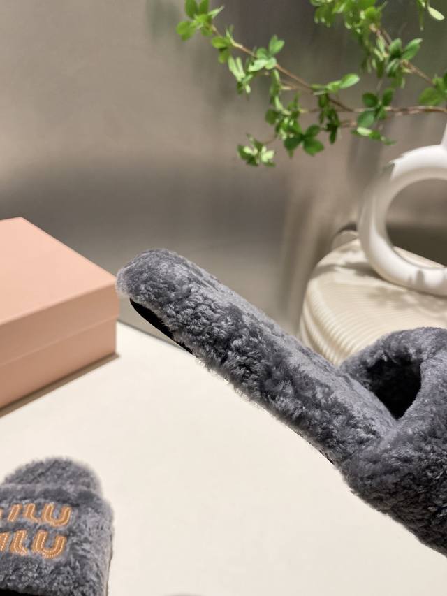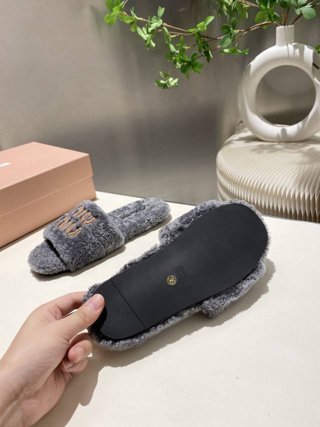 Factory Price p Miu Miu Top-Tier Version DDD 2025 Autumn/Winter Trendy Furry Slippers! 1:1 Mold Opening, Outshining All Other Versions on the Market. A favorite of European and American socialites, celebrities, and internet celebrities. Made with imported Icelandic wool, this single-color wool is fluffy, soft, and skin-friendly. A winter essential with fashionable elements, the upper exudes a luxurious feel. Wearing these shoes always showcases a woman's fashionable charm
