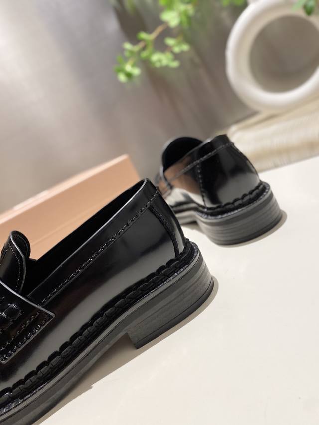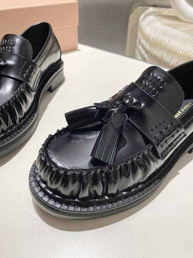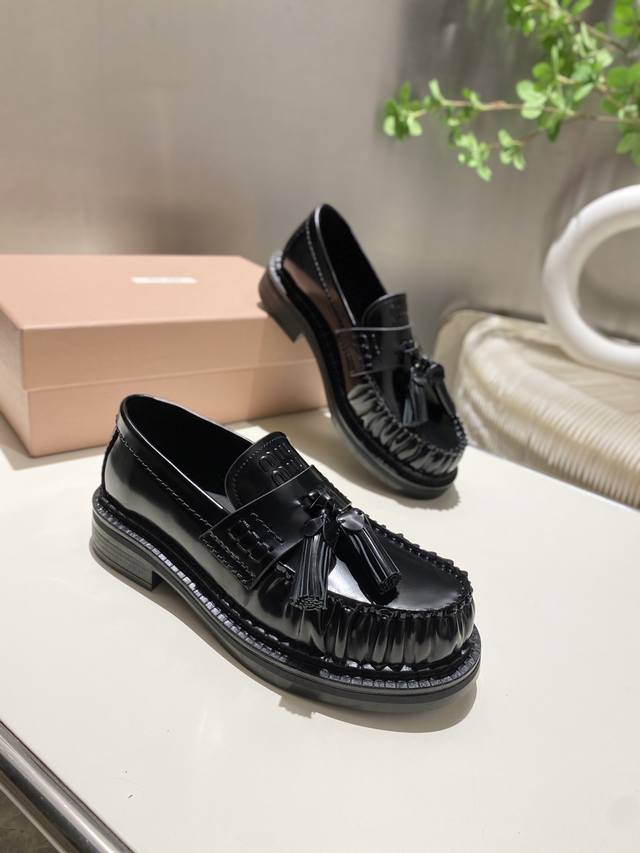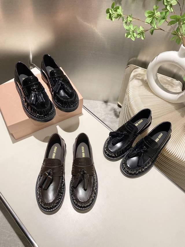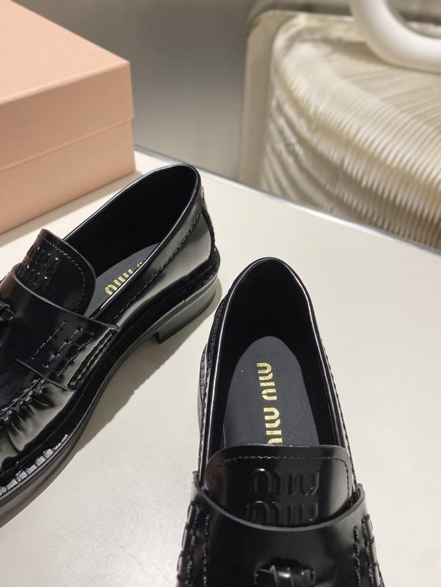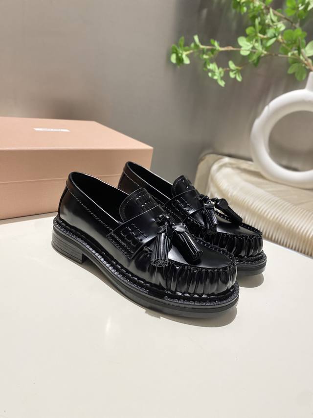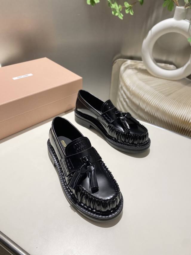 Factory Price: p Miu Miu's new tassel-embellished motorcycle shoes from the 2025 runway, slip-on loafers, small leather shoes, and casual shoes. These timeless calfskin loafers feature an embossed Miu logo on the tongue, showcasing a unique, classic style. The toe cap is embellished with leather straps and the distinctive tasseled strap. Extremely comfortable. Zp develops hardware and custom colors. Upper: Custom imported top-grain cowhide. Lining: Cowhide. Sole: Zp molded rubber outsole. Sizes: 35-42. Custom sizes: 40, 41, and 42.