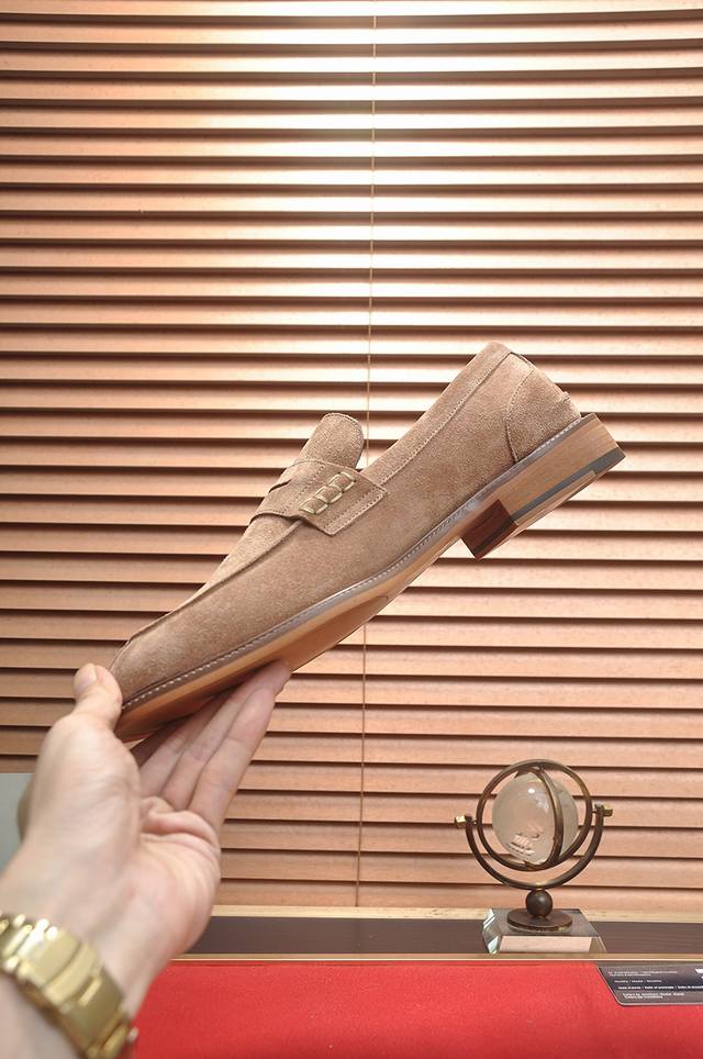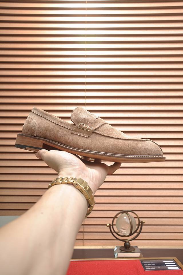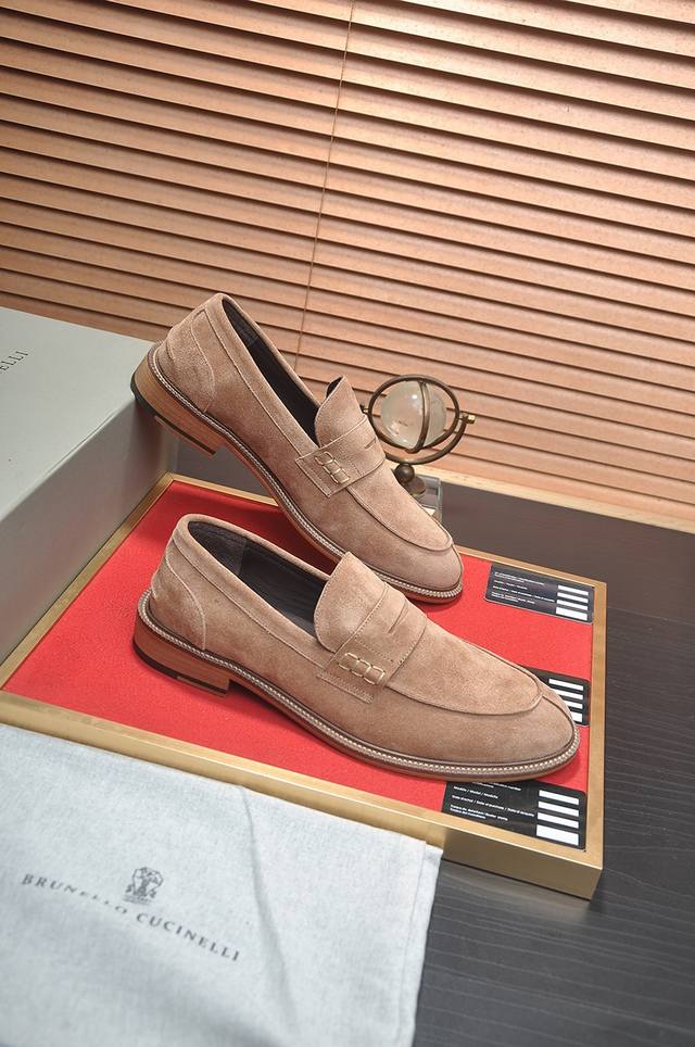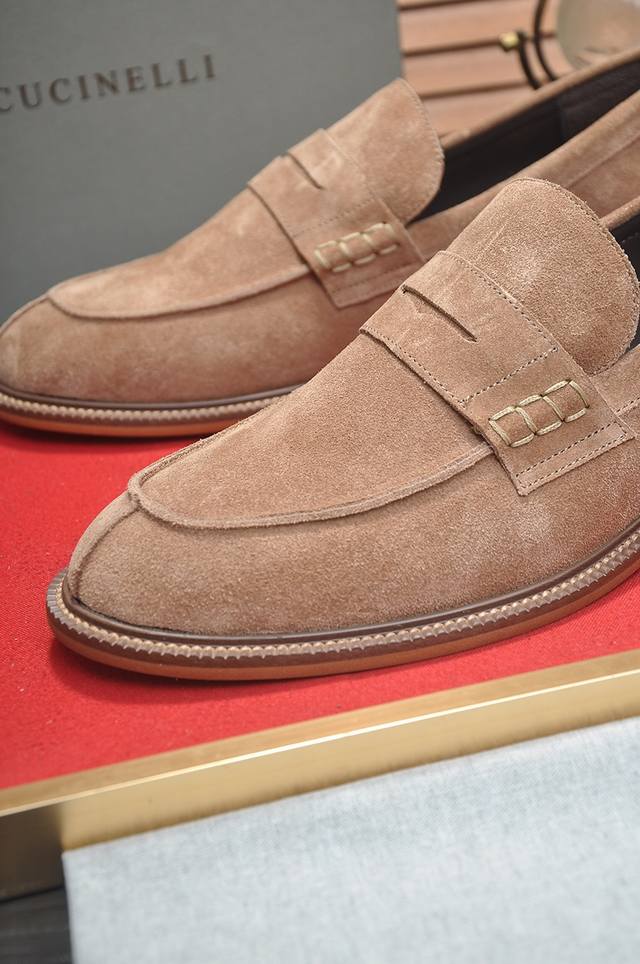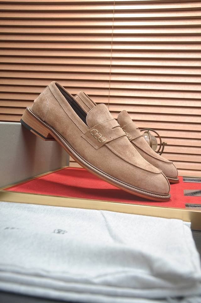 Factory Price p New Brunello Cucinelli Men's Casual Slip-on Loafers, available now on the official website. This timeless BC rubber-soled shoe has a new story, with exquisite cowhide as the featured material. The combination of a smooth and flexible upper and a natural rubber sole ensures a comfortable fit, creating a lightweight and flexible shoe. The Solomeo logo on the heel adds an elegant touch to the design. The precious calfskin leather features an ultra-soft grain and a pleasant feel. The leather is processed to have a slightly smooth appearance at the bends, while the hand-brushed areas create subtle color variations, enriching the texture. The rubber outsole and insole are crafted from full-grain cowhide. Welcome to order! Sizes: 38, 39, 40, 41, 42, 43, 44. Comes with original packaging box + dust bag.
