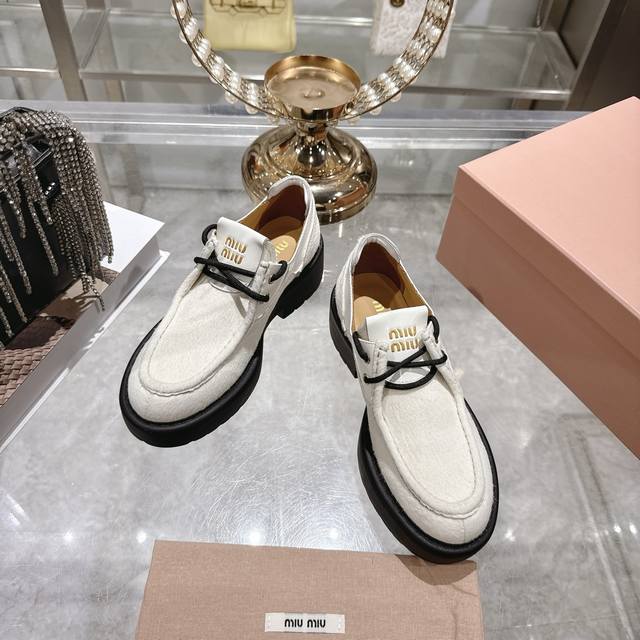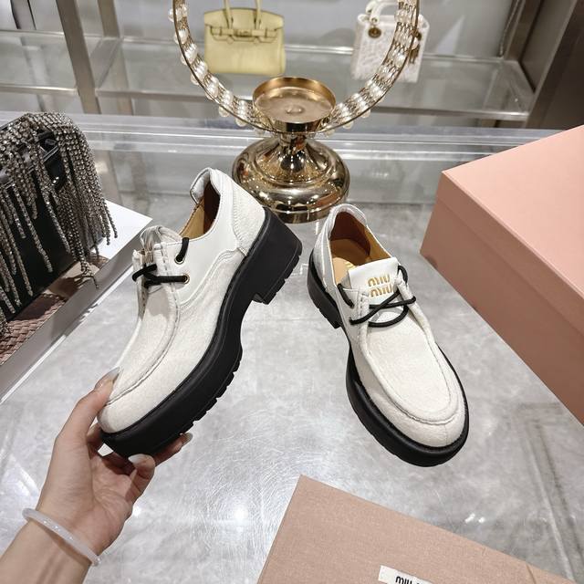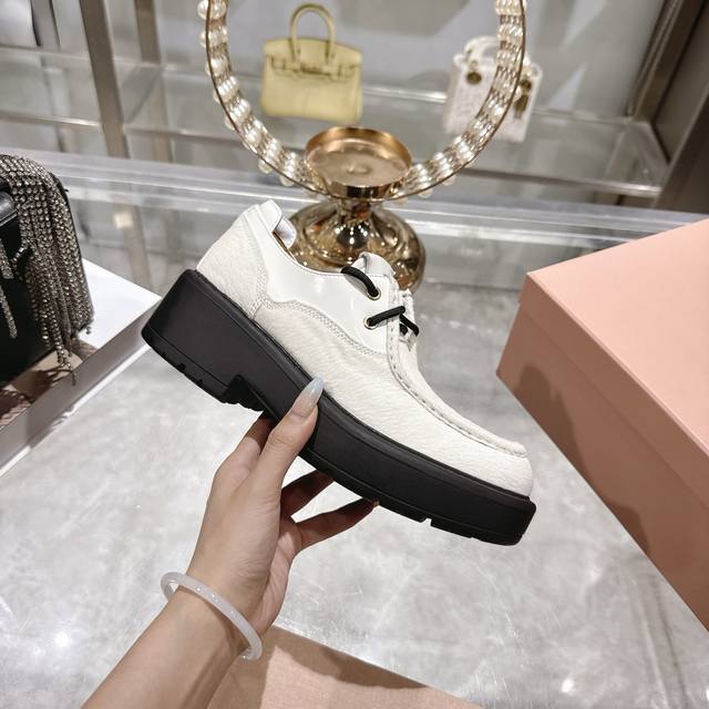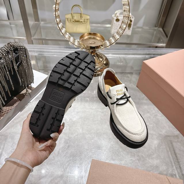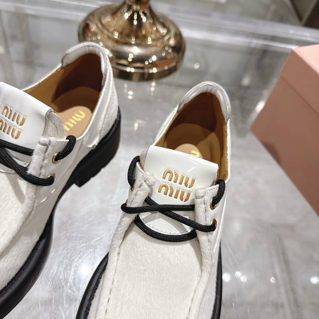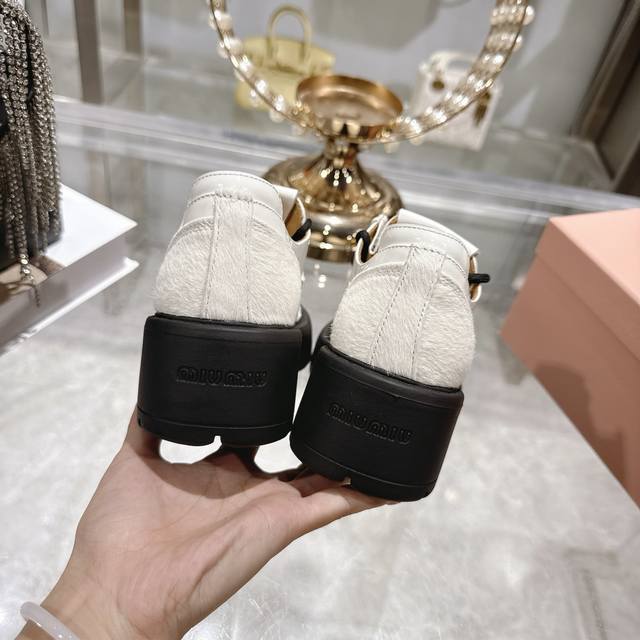 This style uses horsehair material and features an embossed Miu logo on the tongue, showcasing a unique classic style. Exceptionally comfortable to wear