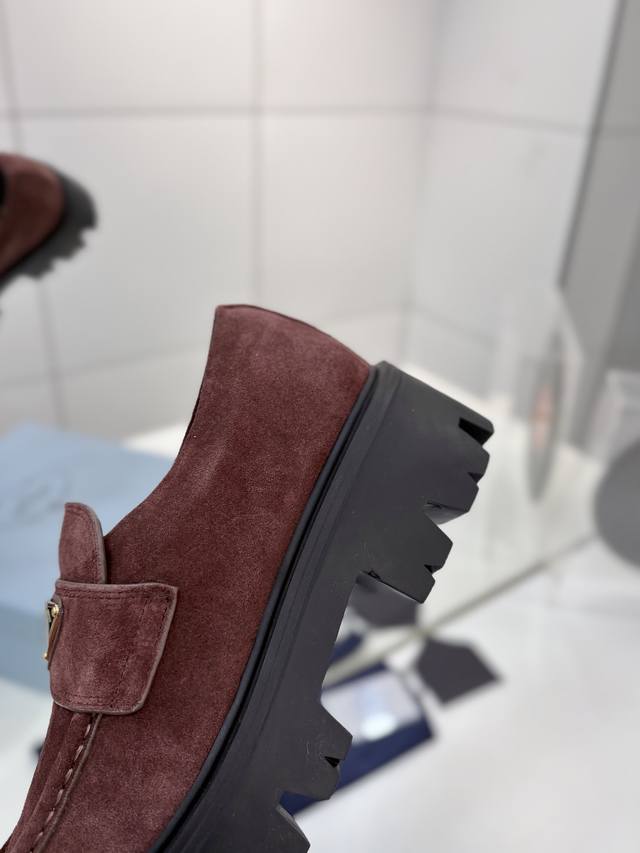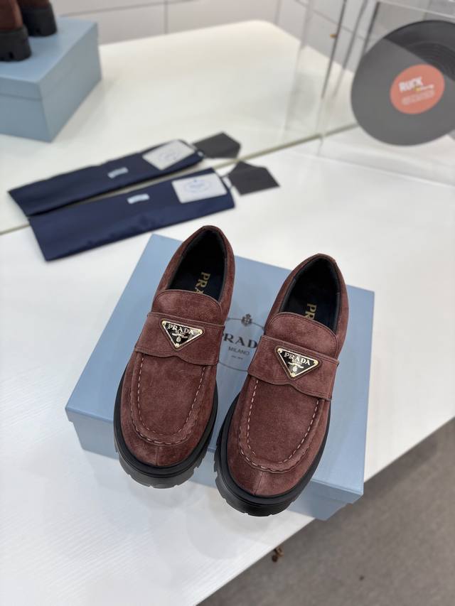 Factory price Prada loafers, triangular buckle thick-soled leather loafers, complete set. These shoes feature a decorative strap and a metal buckle with an enamel triangular logo. The retro-chic thick sole paired with a cowhide upper makes the shoes lightweight and comfortable, and makes legs look incredibly long. Upper: Two-tone cowhide premium suede. Lining: Cowhide. Outsole: Original mold outsole. Sizes: 35-42. Sizes 40, 41, and 42 are custom-made and non-refundable.