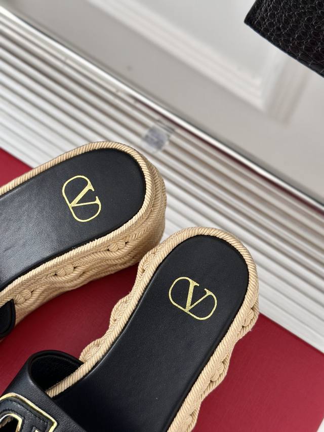 Factory Price Valentin 2024 Spring/Summer New Arrival Large V-Buck Platform Slippers. The classic large V-buck design showcases the brand's unique style. Luxurious, fashionable, and highly recognizable. The platform sole is incredibly leg-lengthening, versatile, comfortable, and instantly gives you long legs! The upper is made of imported calfskin, the lining is made of mixed sheepskin, original mold hardware buckles, and original mold hemp rope rubber outsole. Sizes: 35-39, 40, 41 (Custom sizes available).