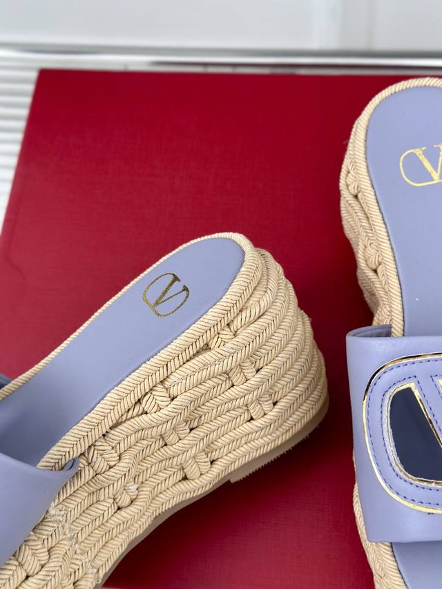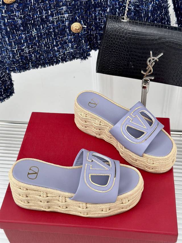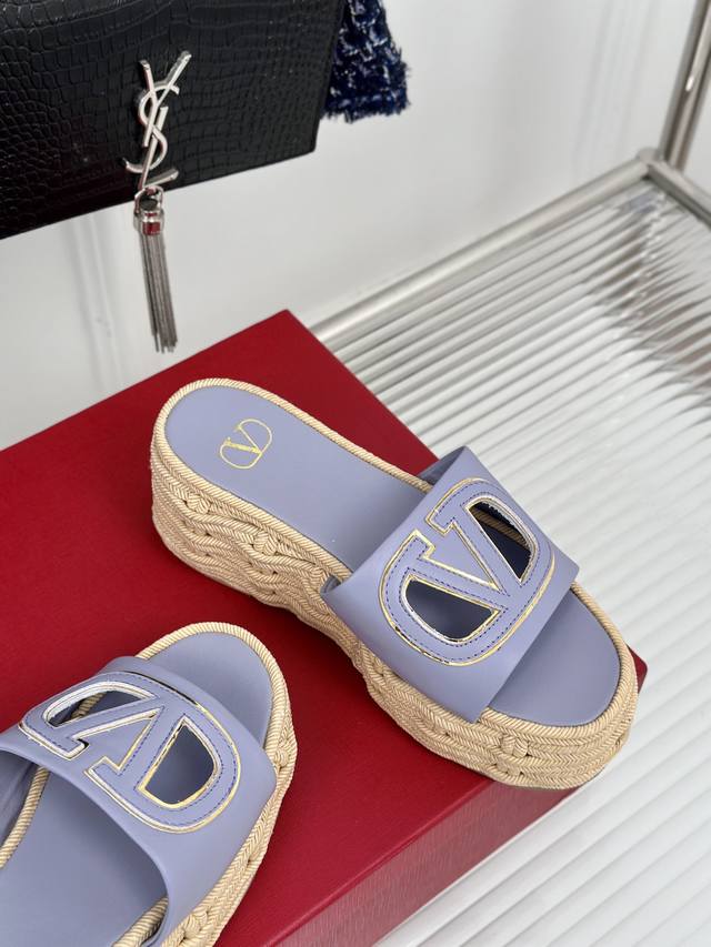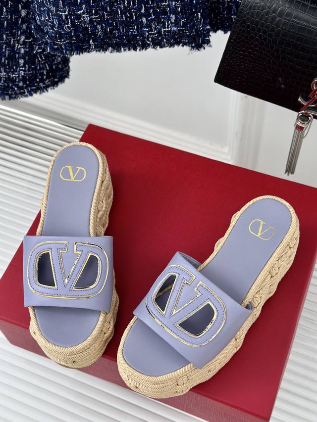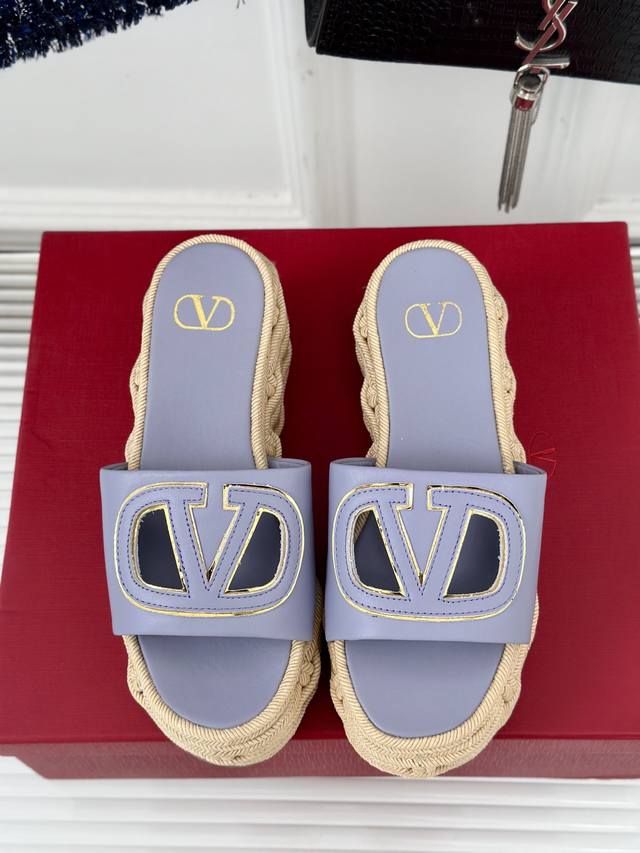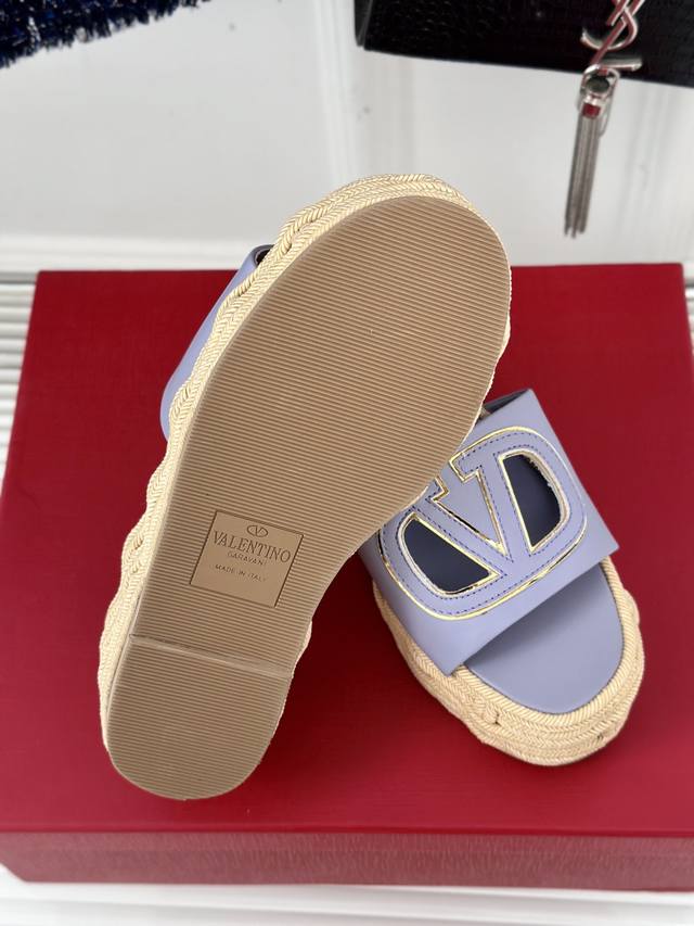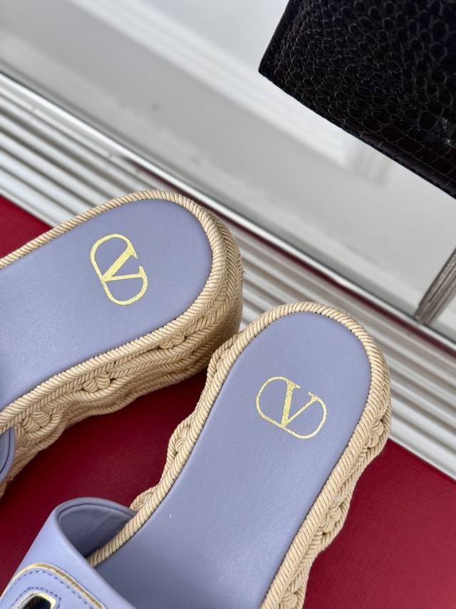 Factory Price Valentin 2024 Spring/Summer New Arrival Large V-Buck Platform Slippers. The classic large V-buck design showcases the brand's unique style. Luxurious, fashionable, and highly recognizable. The platform sole is incredibly leg-lengthening, versatile, comfortable, and instantly gives you long legs! The upper is made of imported calfskin, the lining is made of mixed sheepskin, original mold hardware buckles, and original mold hemp rope rubber outsole. Sizes: 35-39, 40, 41 (Custom sizes available).