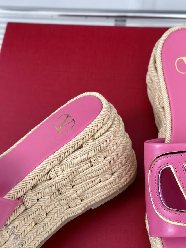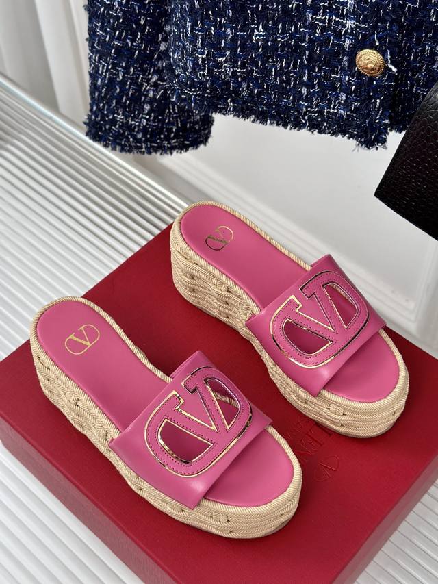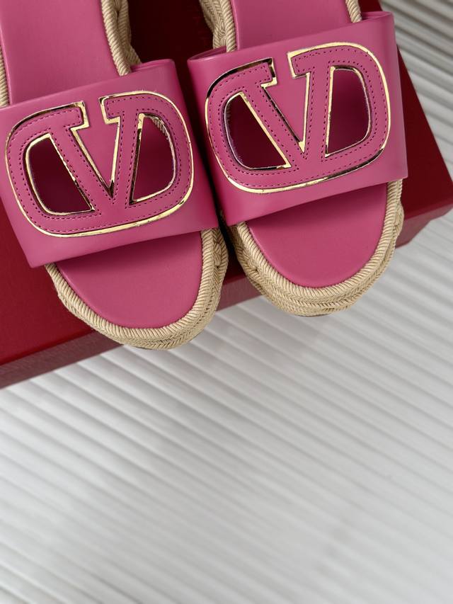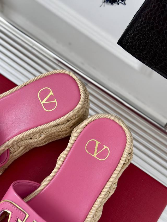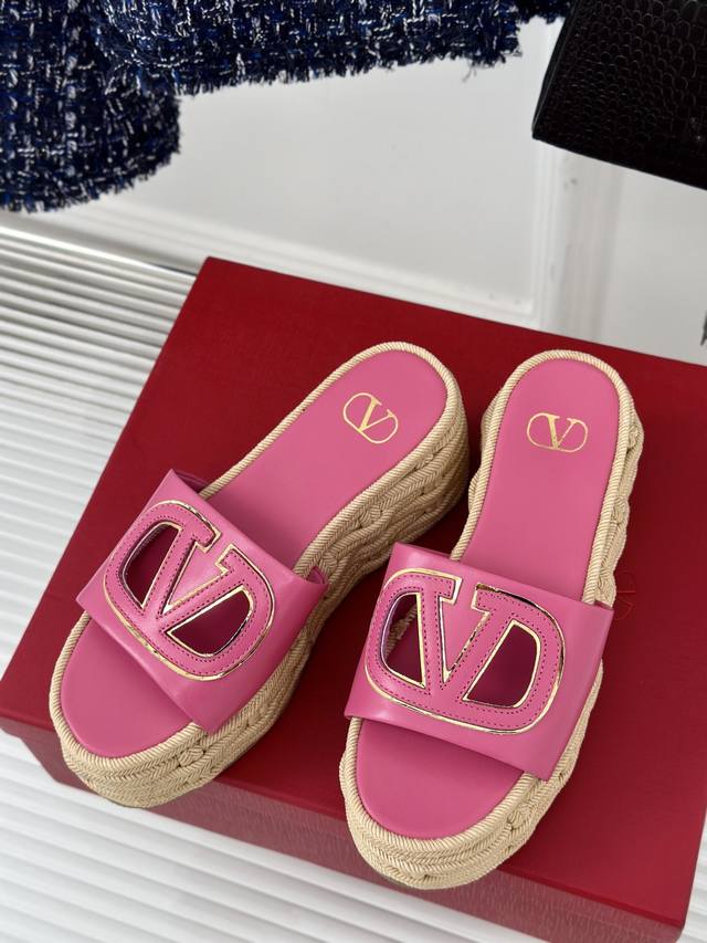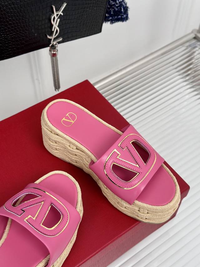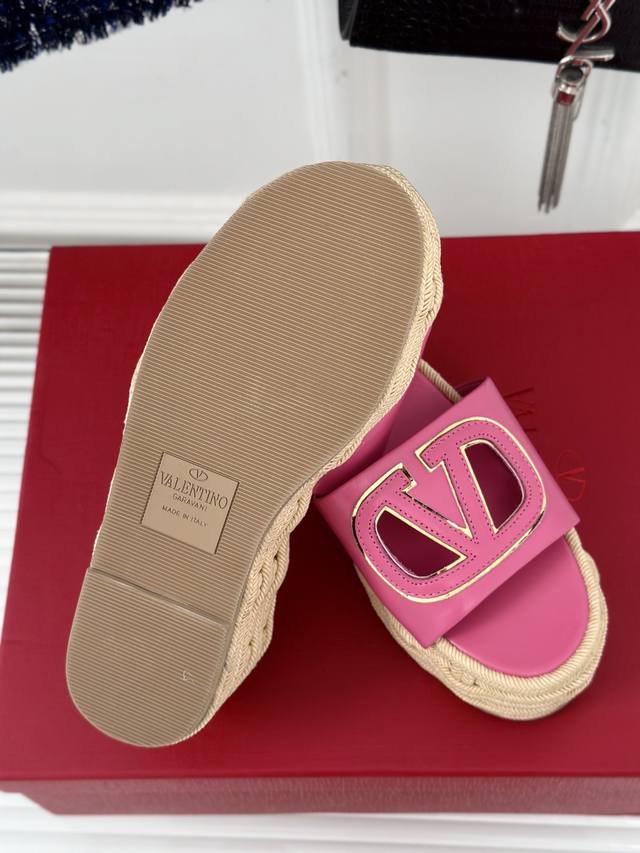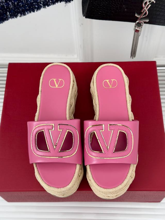 Factory Price Valentin 2024 Spring/Summer New Arrival Large V-Buck Platform Slippers. The classic large V-buck design showcases the brand's unique style. Luxurious, fashionable, and highly recognizable. The platform sole is incredibly leg-lengthening, versatile, comfortable, and instantly gives you long legs! The upper is made of imported calfskin, the lining is made of mixed sheepskin, original mold hardware buckles, and original mold hemp rope rubber outsole. Sizes: 35-39, 40, 41 (Custom sizes available).