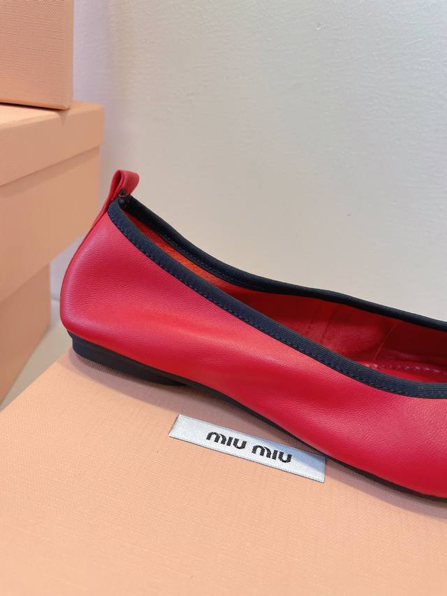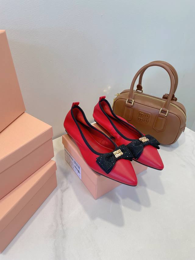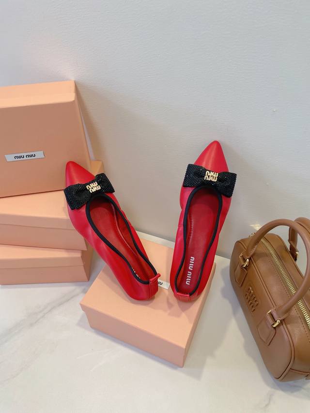 Miumiu ballet shoes, elegant and intellectual small pointed toe, beautiful and smooth. I really understand women's hearts and know how to grasp the sense of refinement. Bow + imported rhinestones, beautiful to the heart, combining sexiness and cuteness