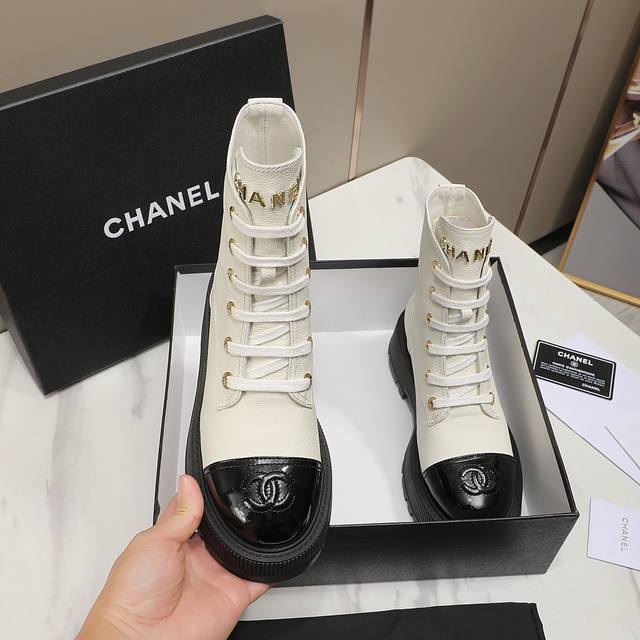 Factory Price Women's Shoes, Original Sportswear, Chanel Autumn/Winter Leather Ankle Boots, New Arrival Fw23 ~ A classic Chanel boot style, sleek and stylish! Sturdy, wide, and full, with a stylish touch! Streamlined, made with the same meticulous craftsmanship as the original. Chanel hardware buckle adorns the tongue, creating a unique and refined look. Upper: Imported calfskin, patent leather toe cap. Lining: Soft, water-dyed lambskin. Outsole: Custom-molded TPU outsole. Sizes: 35-40.