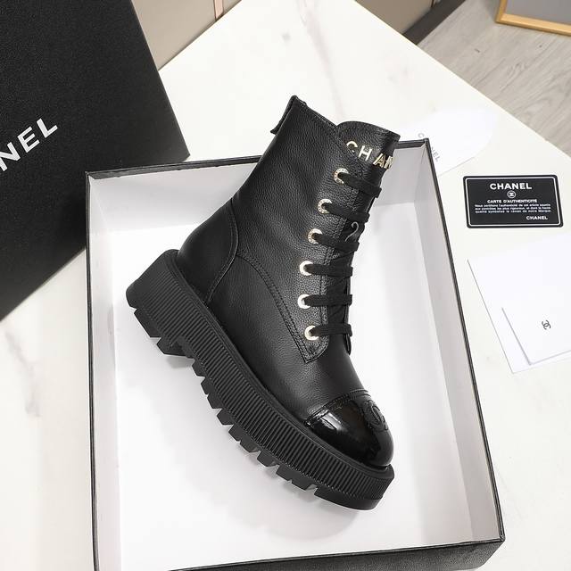 Factory Price Women's Shoes, Original Sportswear, Chanel Autumn/Winter Leather Ankle Boots, New Arrival~ A basic Chanel boot style, sleek and stylish! Sturdy, wide and full, with a stylish touch! Streamlined, made with the same meticulous craftsmanship as the original. Chanel hardware buckle adorns the tongue, creating a unique and refined look. Upper: Imported calfskin, patent leather toe cap. Lining: Soft, water-dyed lambskin. Outsole: Custom-molded TPU outsole. Sizes: 35-40.