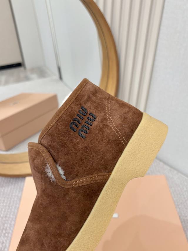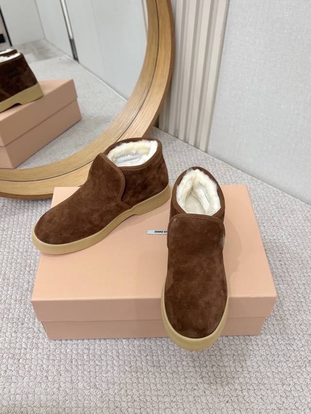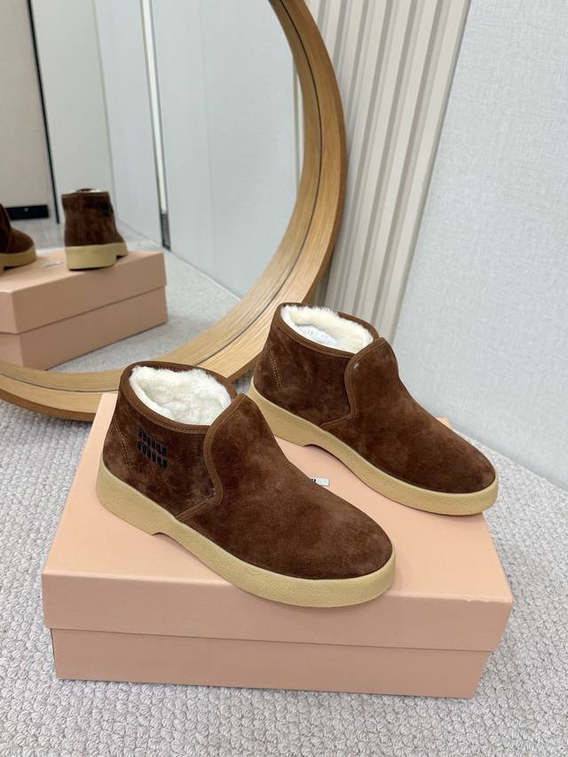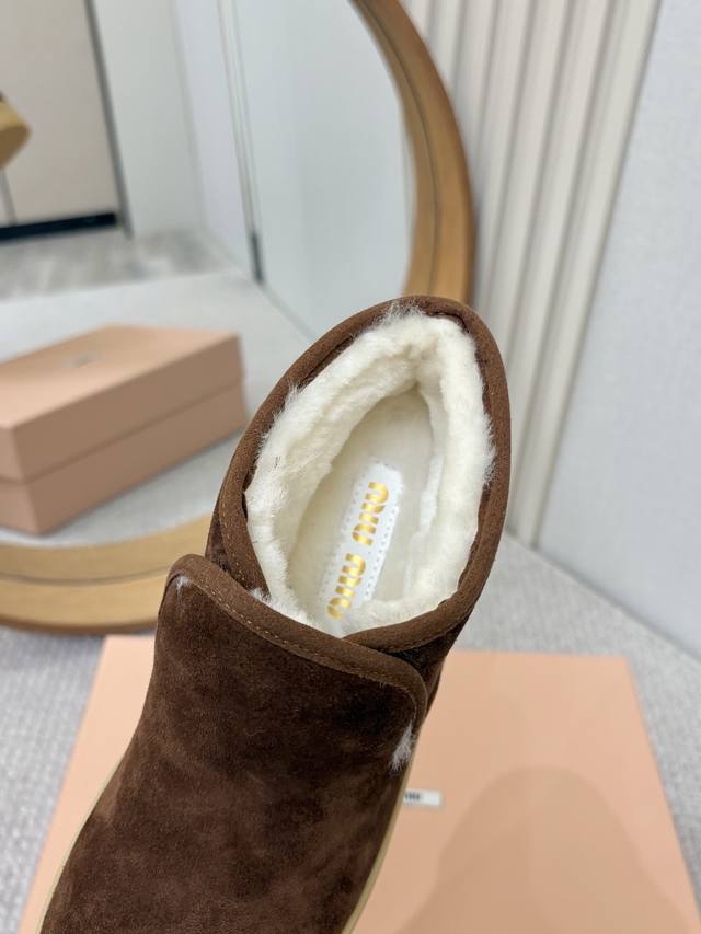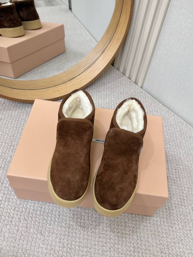 Factory wholesale women's clothing, shoes, sportswear, original single DDD Miumiu. Autumn/Winter runway new pure wool snow boots. A warm choice for sweet and cool girls in winter. Snow boots reach a new level of sweetness and coolness. From the design to the details, they perfectly balance girlishness and warmth. The silky cow suede material has a delicate and high-end feel. The wool trim at the shoe opening is fluffy and soft, visually "warm" and can also modify the ankle line, making the calves look slimmer. Suitable for everyday outings or winter commuting DDD Sizes: 35-40 40 custom-made DDD