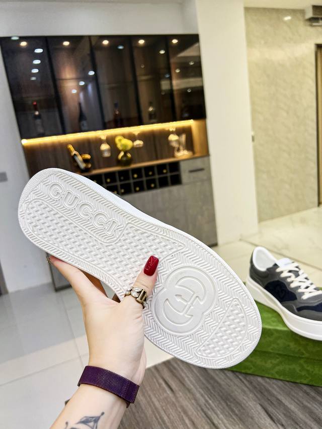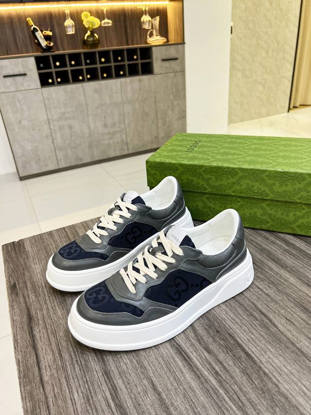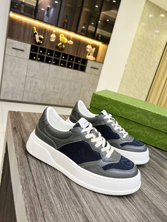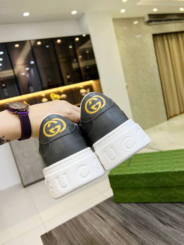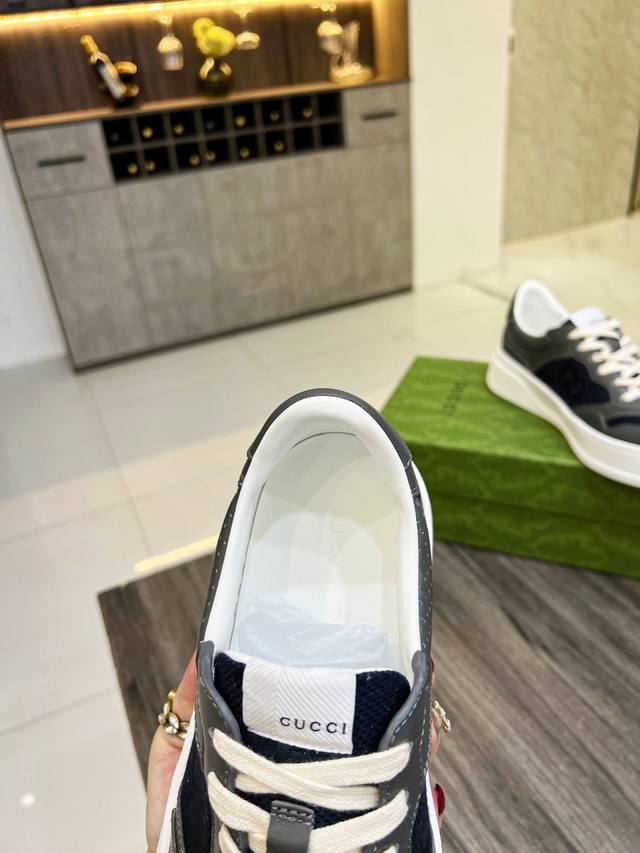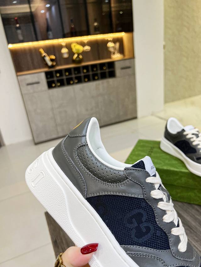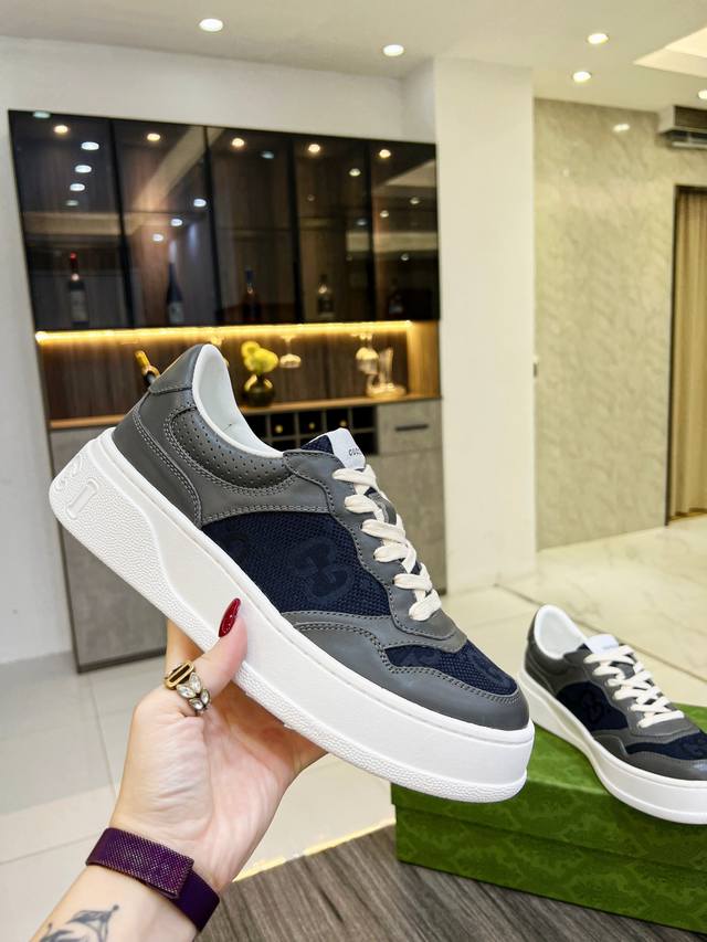 G's latest blockbuster thick-soled white sneakers, a blend of sporty and casual styles, combine modern design with a touch of retro flair. The new collection continues to draw inspiration from everyday life in other eras while incorporating contemporary design elements. Made from embossed GG leather, the shoes feature the classic interwoven Double G motif, showcasing the brand's signature heritage. Fabric: Original silk cowhide. Lining: Cowhide lining. Footrest: Original Double G pad. Outsole: IP foam. Tongue size: Air-pressed original size. Packaging: Complete set with a tote bag. Note: All details are compared with the original. P. Regular 230. P. High-top. Sizes: Women's 35-42, 38-45 .